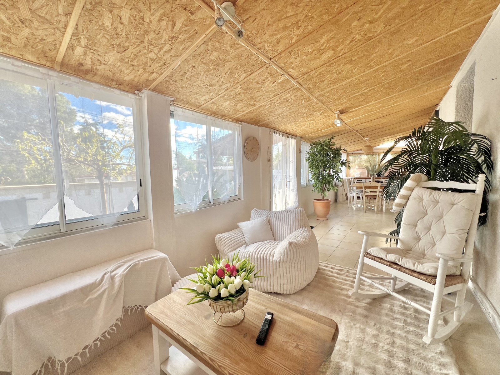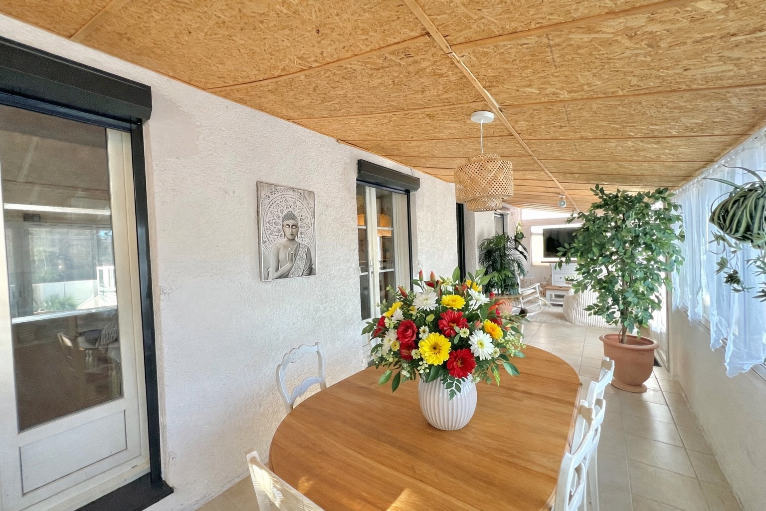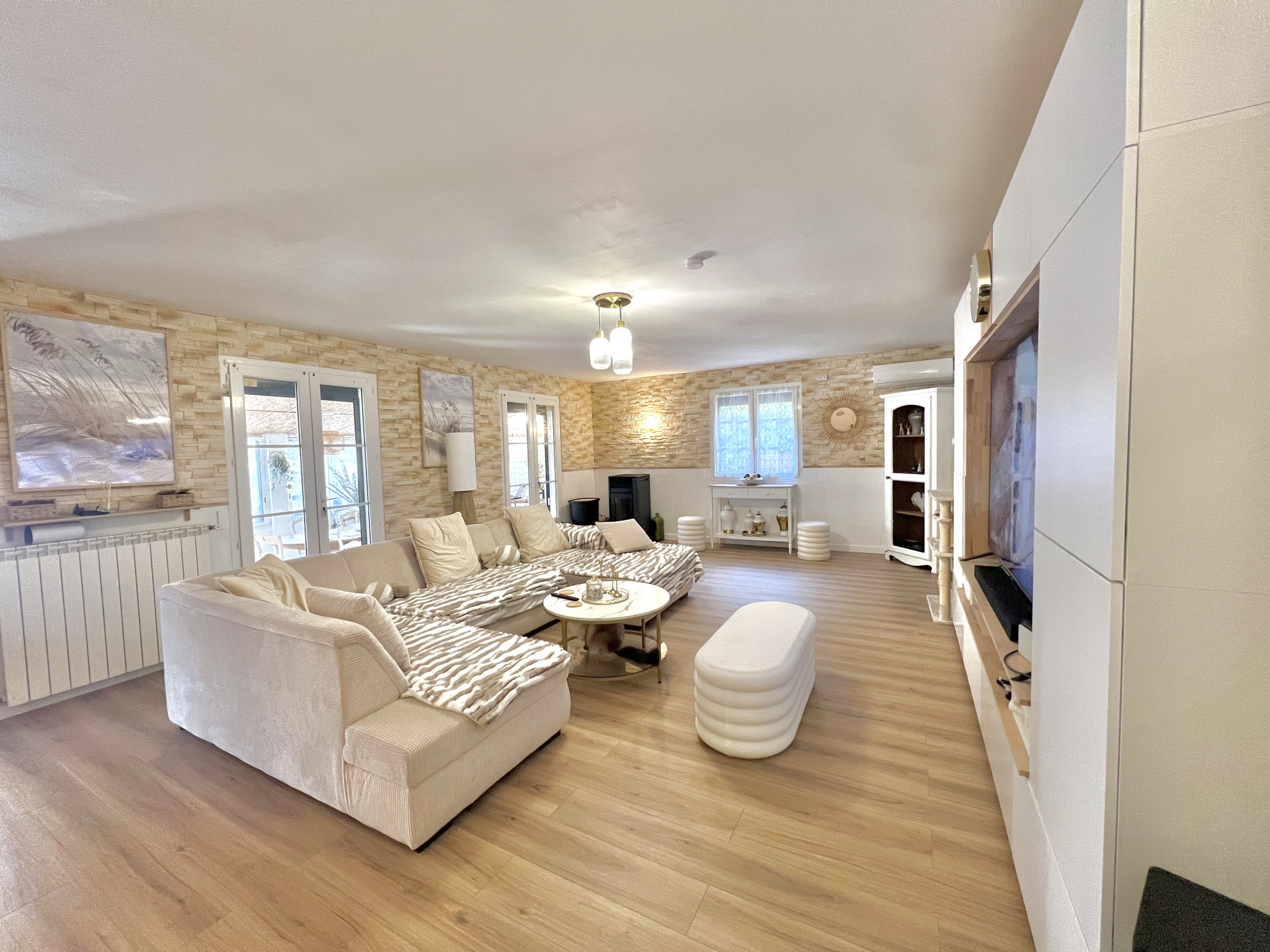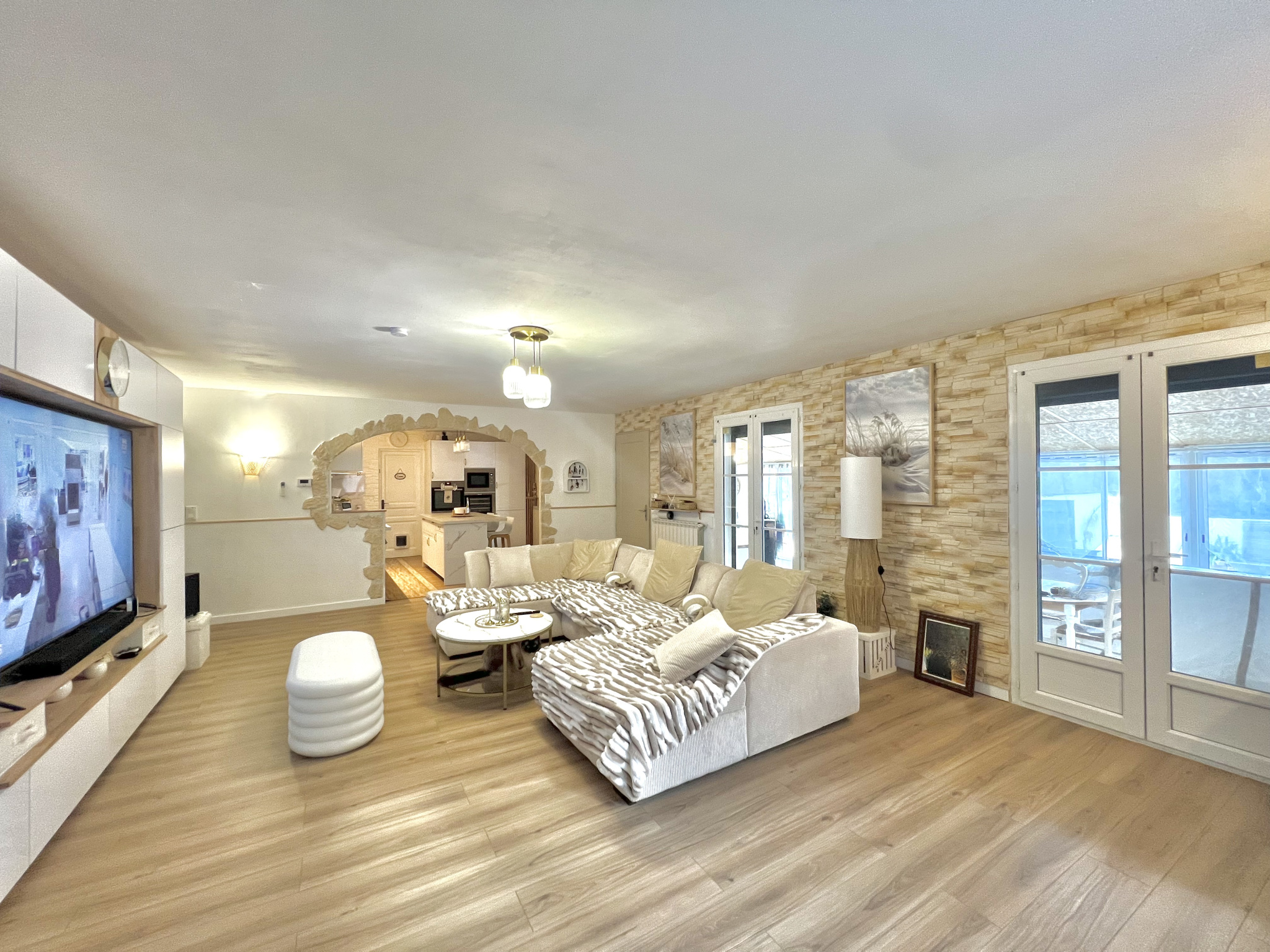 Les espaces de vie s’organisent autour de deux volumes principaux. En façade, une grande véranda bâtie en dur, avec couverture tuiles et larges ouvertures vitrées, constitue un véritable espace de vie à part entière, lumineux et pleinement exploitable au quotidien. Dans son prolongement se déploie la pièce de vie principale de 51,60 m², composée d’un salon et d’une cuisine entièrement équipée ouverte sur l’ensemble, offrant une circulation fluide et une très belle générosité d’espace.