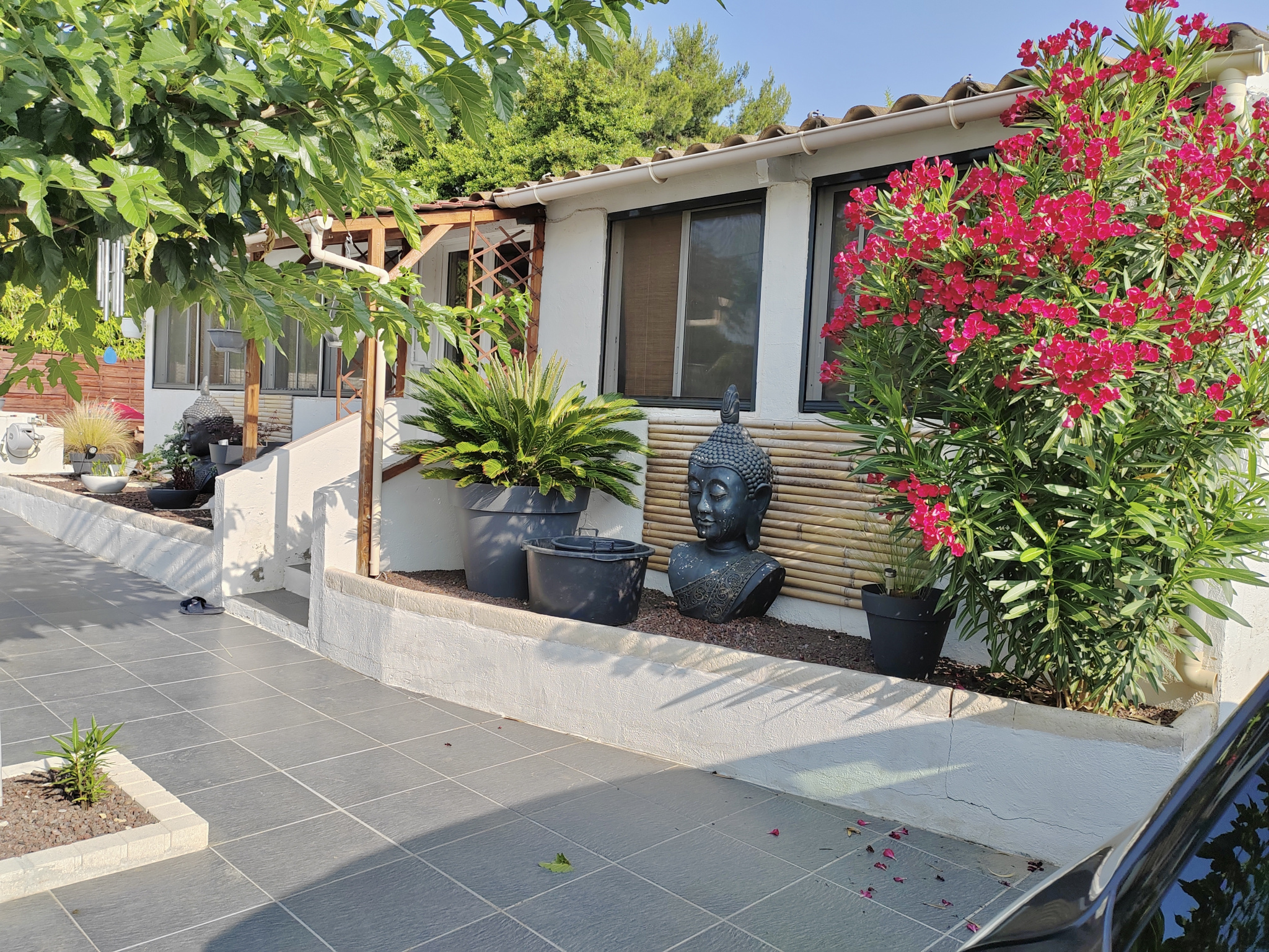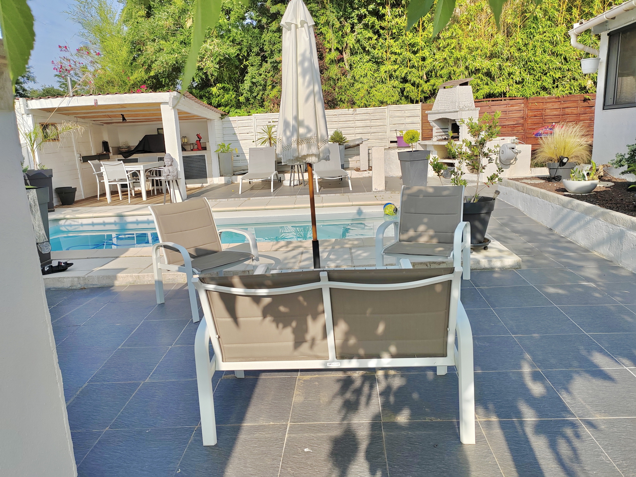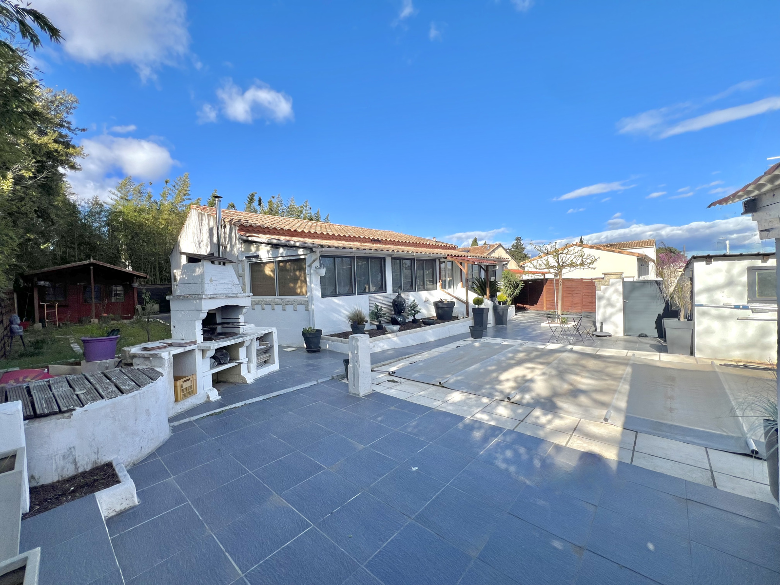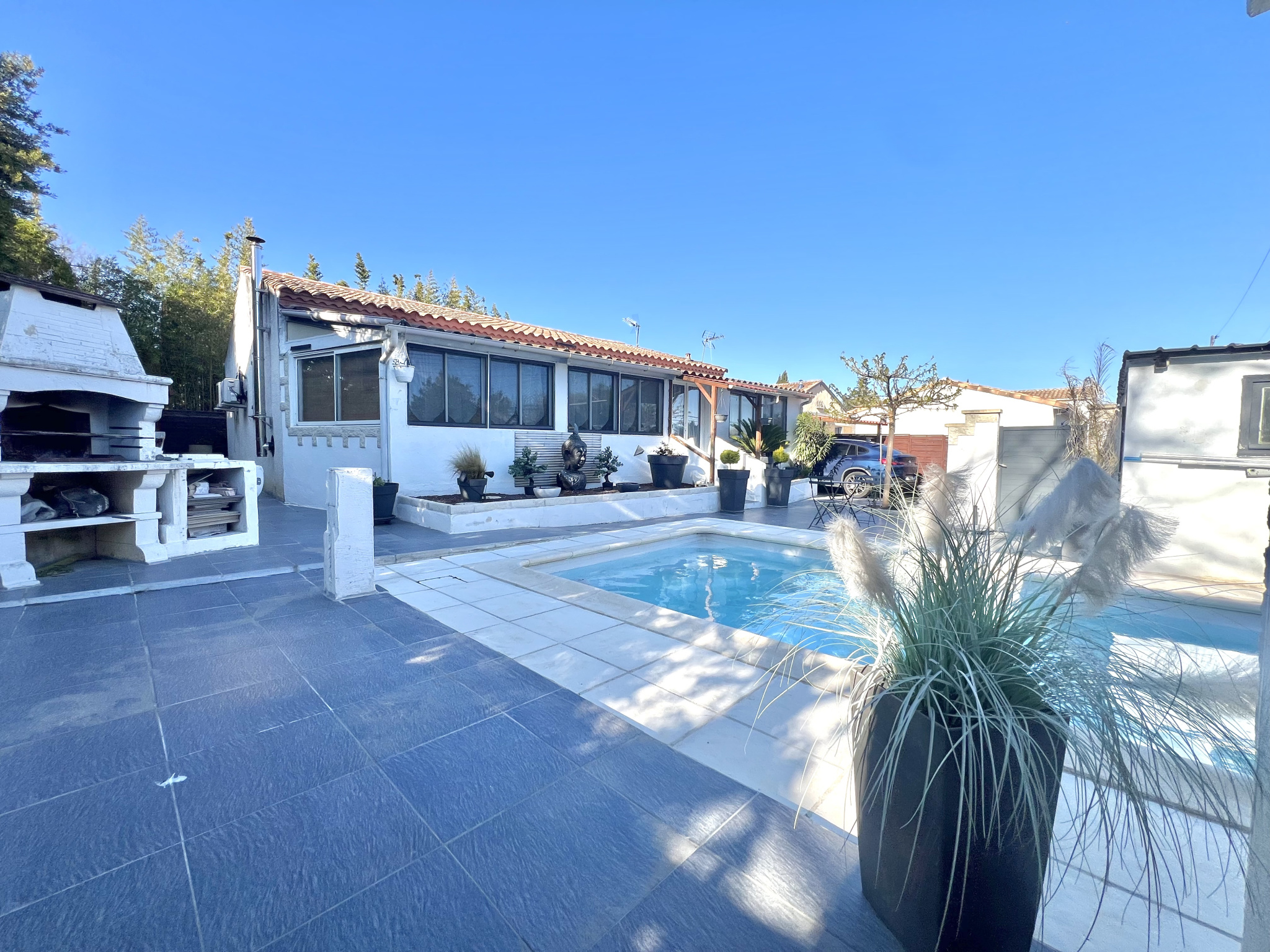 À l’extérieur, la propriété s’inscrit sur une parcelle de 506 m² et bénéficie d’aménagements particulièrement agréables : piscine avec espace pool house, terrasses carrelées, un vaste abri de jardin sur dalle béton, un espace étendoir protégé, un puit avec pompe immergée. Un portail automatique qui ouvre sur un espace de stationnement privatif avec abri voiture, apportant un confort supplémentaire au quotidien. Le terrain enveloppe largement la villa, renforçant la sensation d’espace et la fonctionnalité générale du bien.