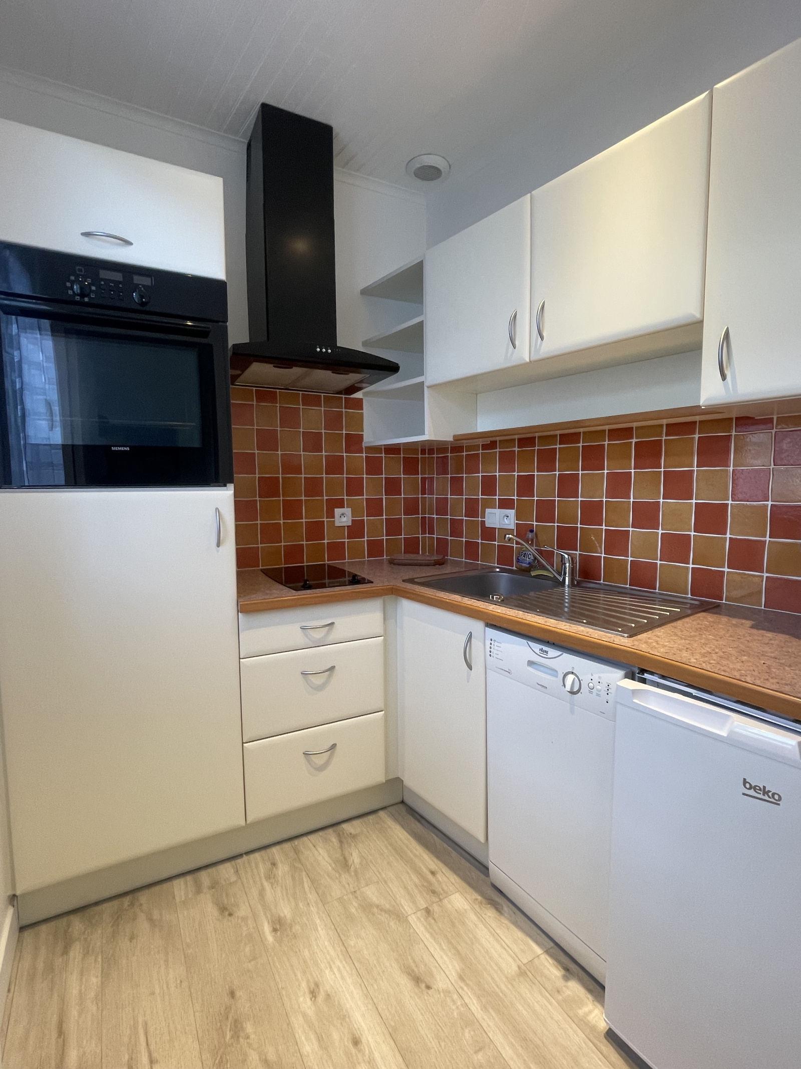 Cuisine aménagée et équipée : four, lave-vaisselle, réfrigérateur, plaques vitrocéramique, hotte