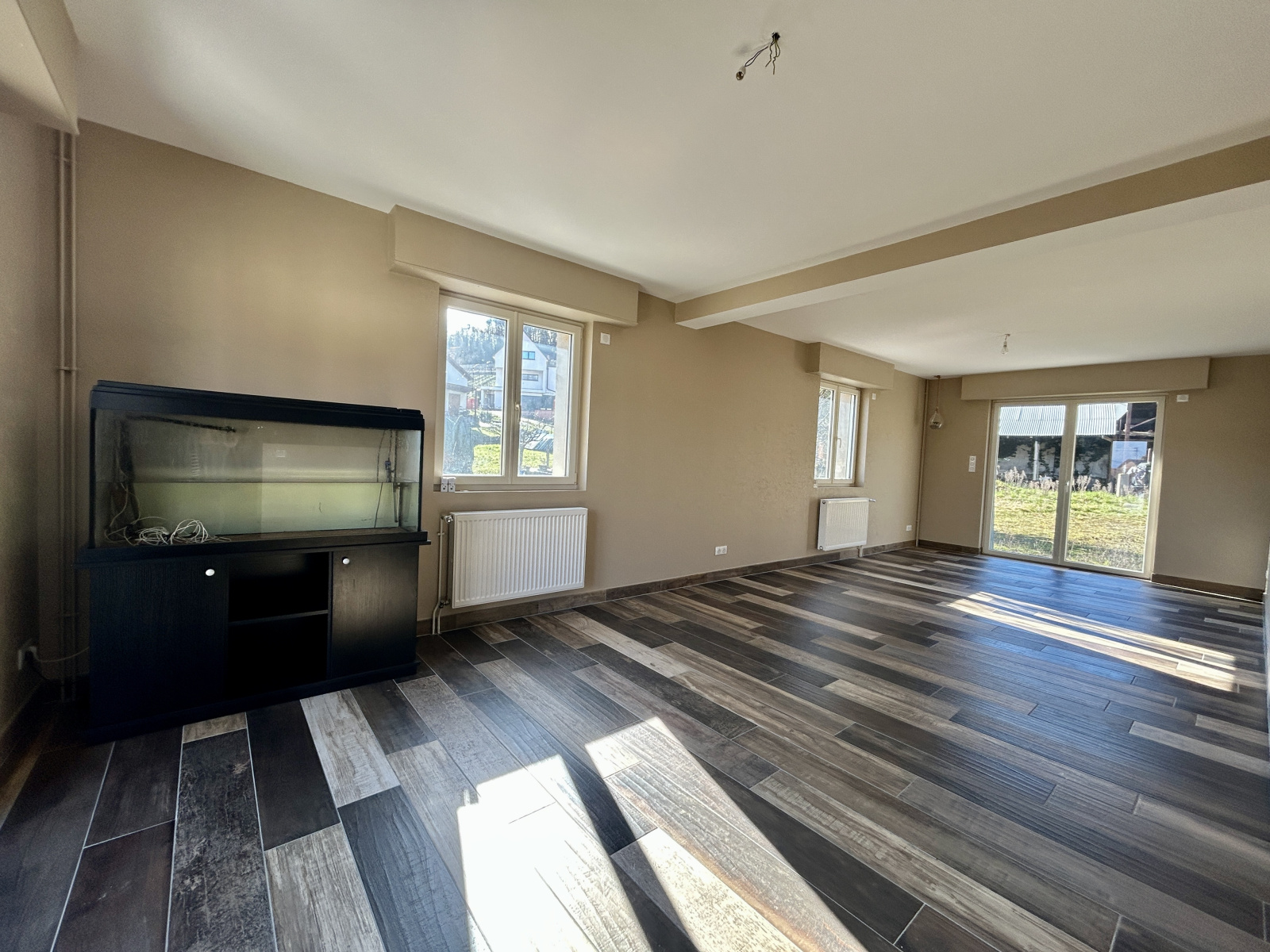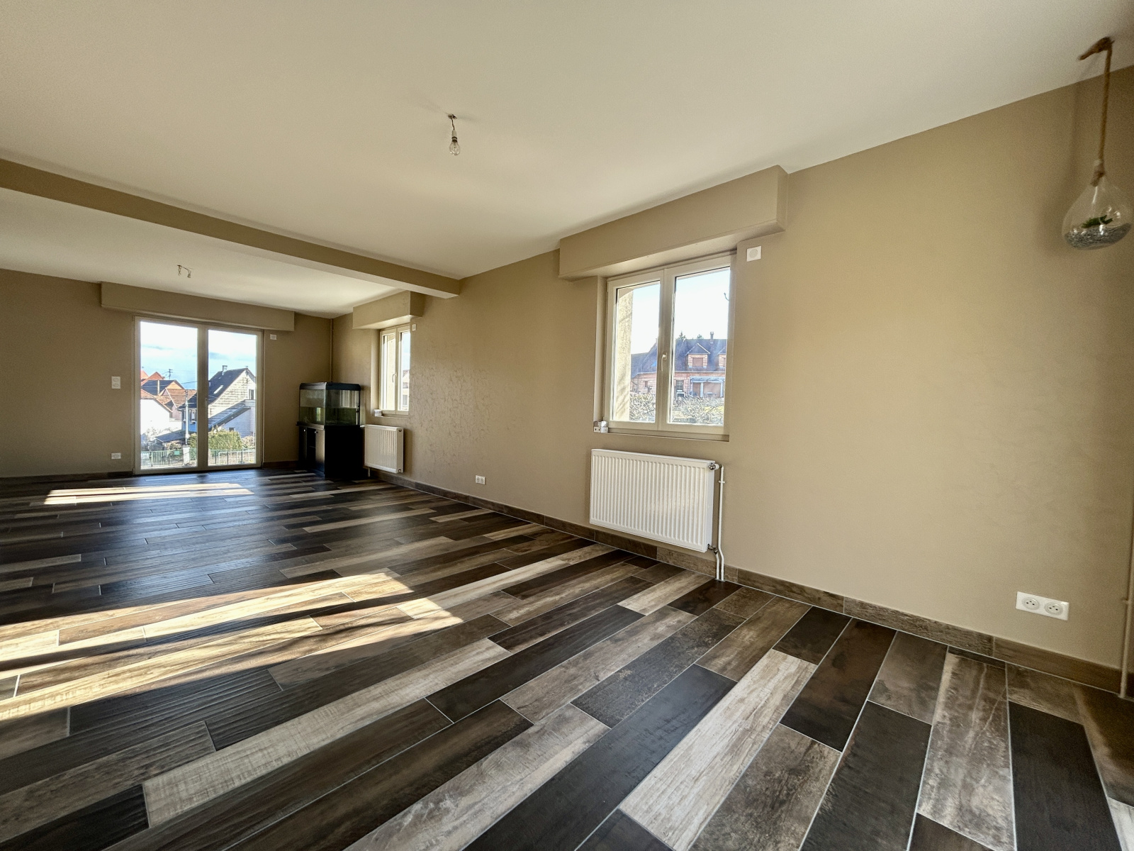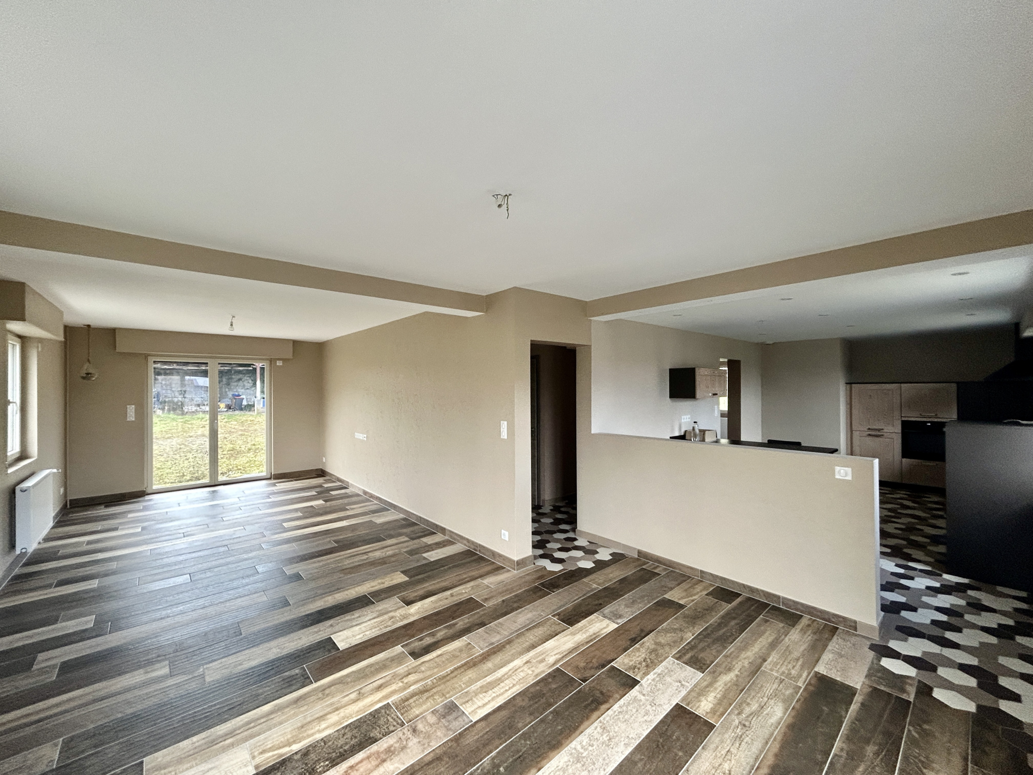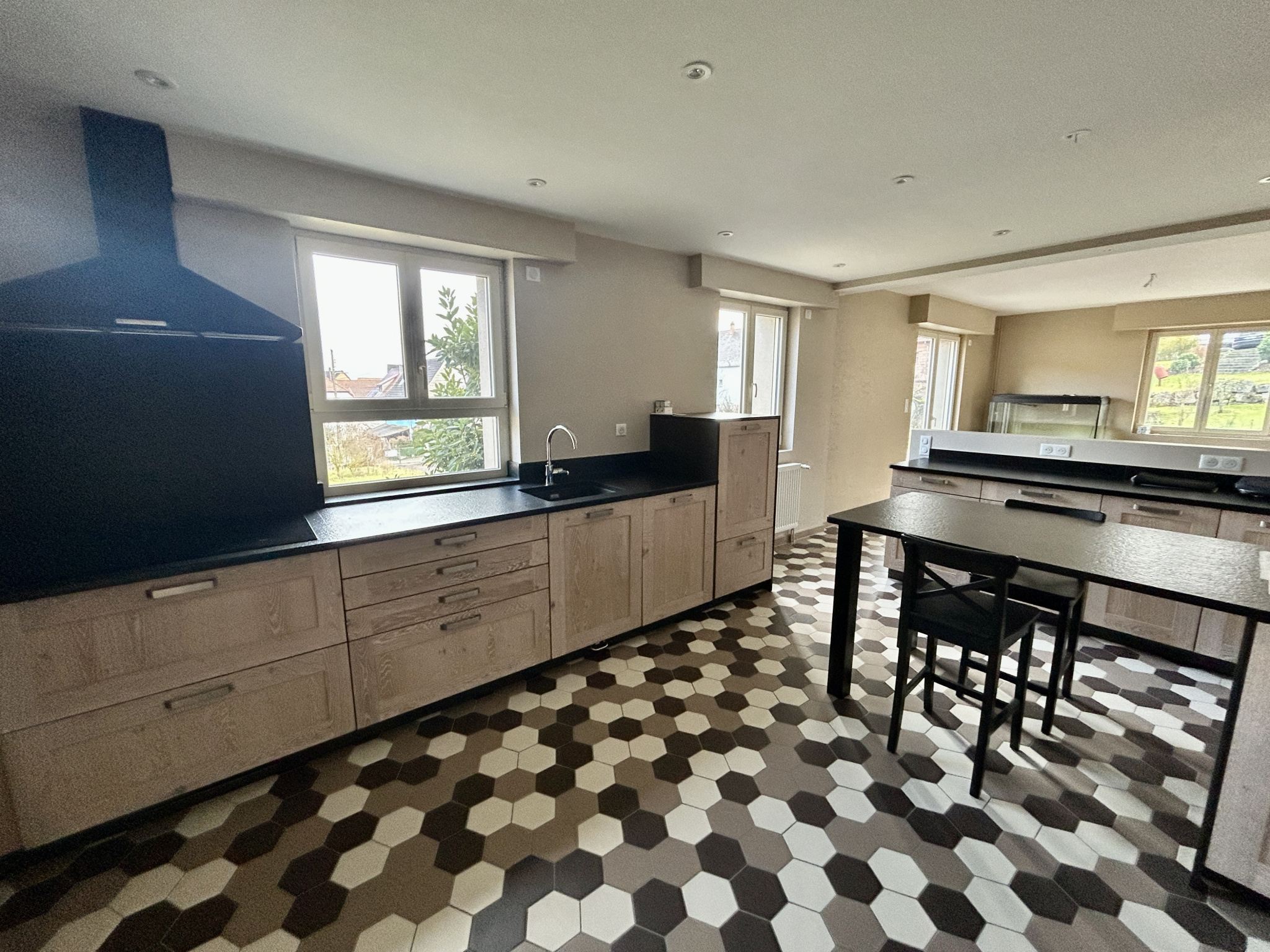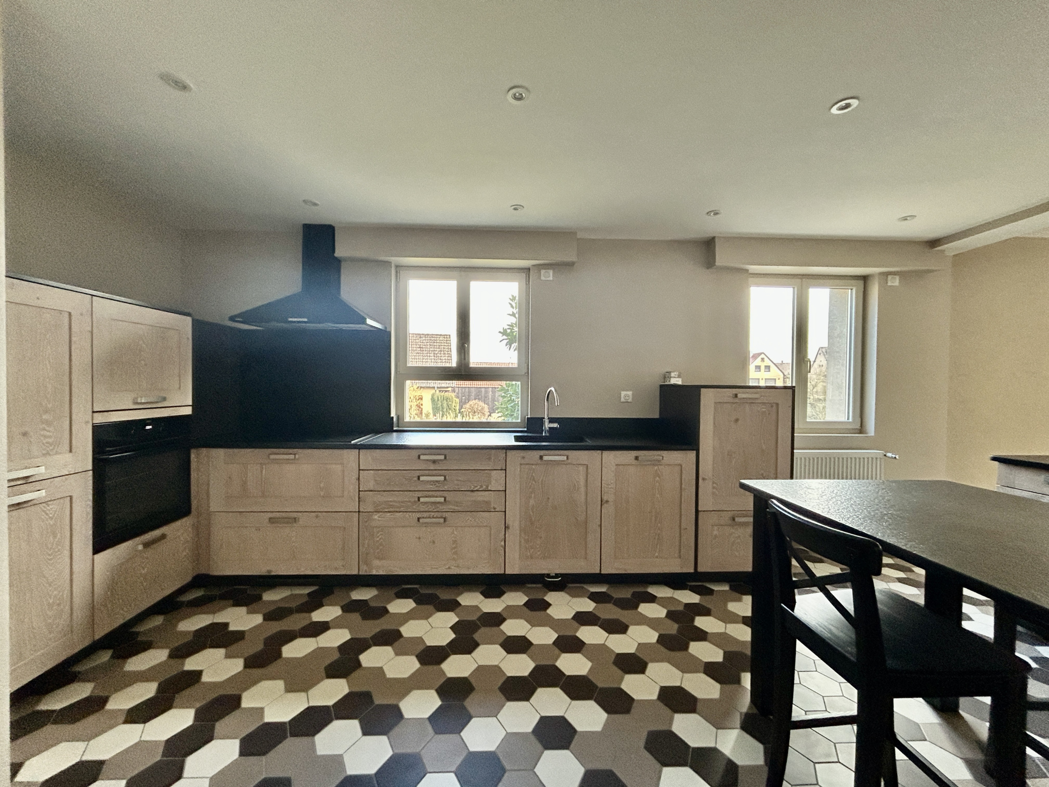 1 double salon/séjour lumineux ouvert sur une grande cuisine équipée dinatoire. (Schmidt).