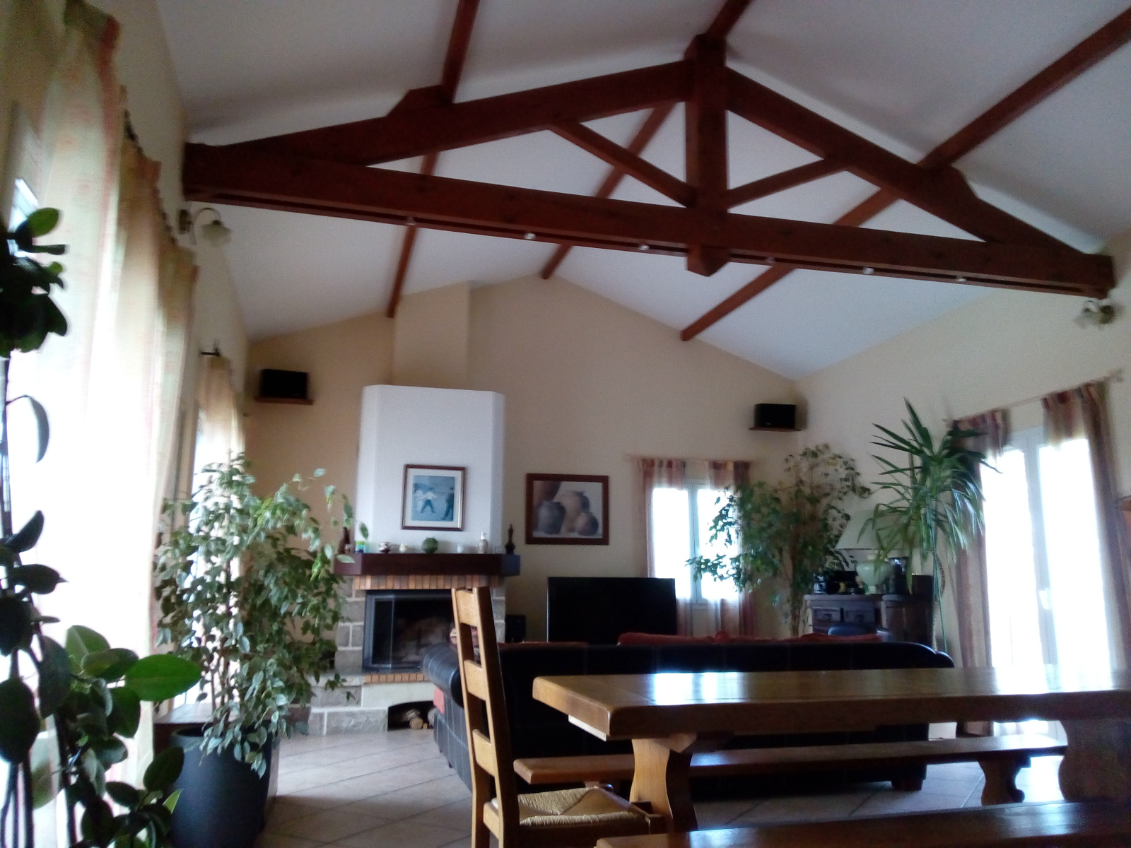 Un séjour cathédrale donnant directement sur la terrasse semi couverte ,un coin plancha