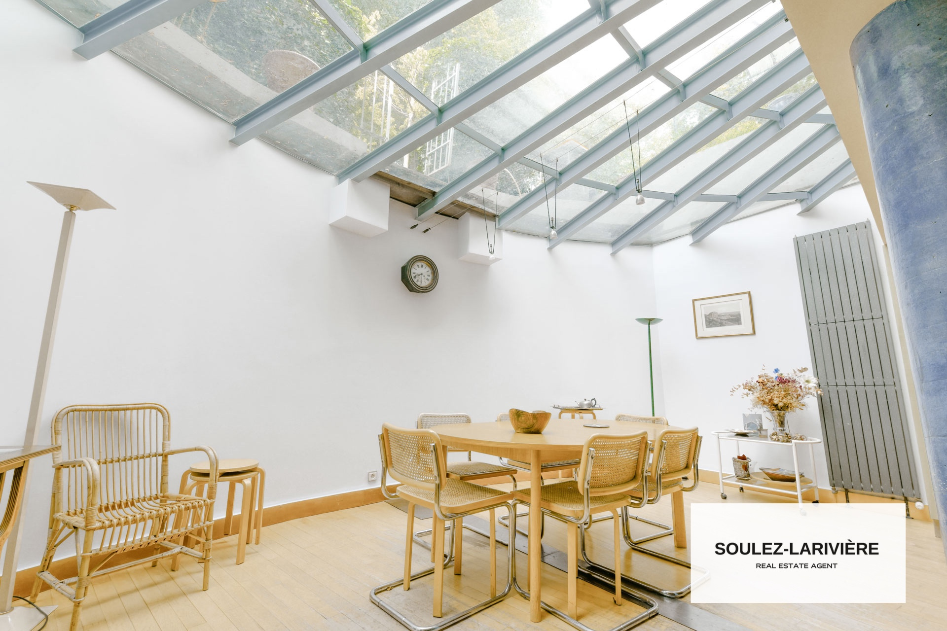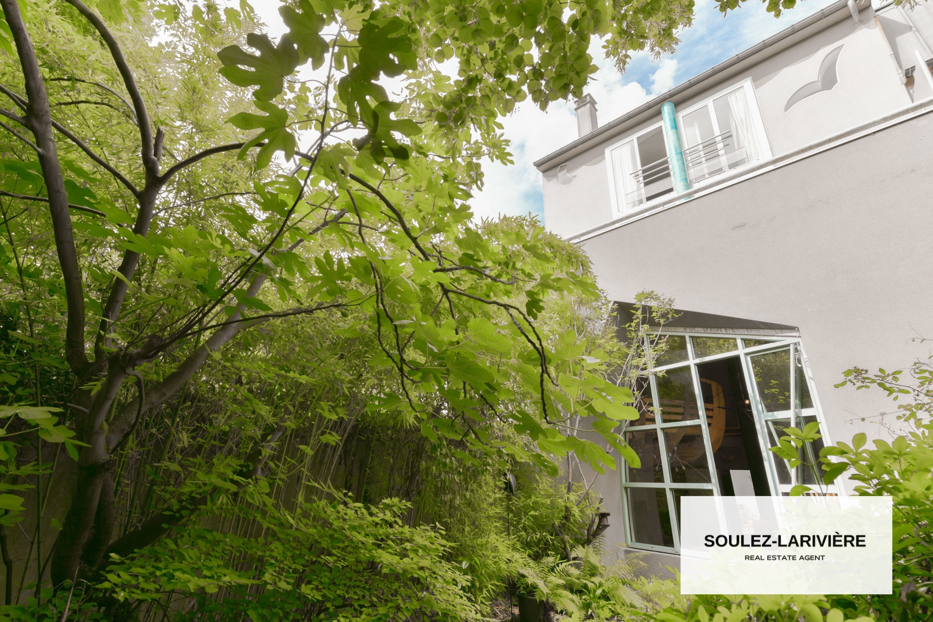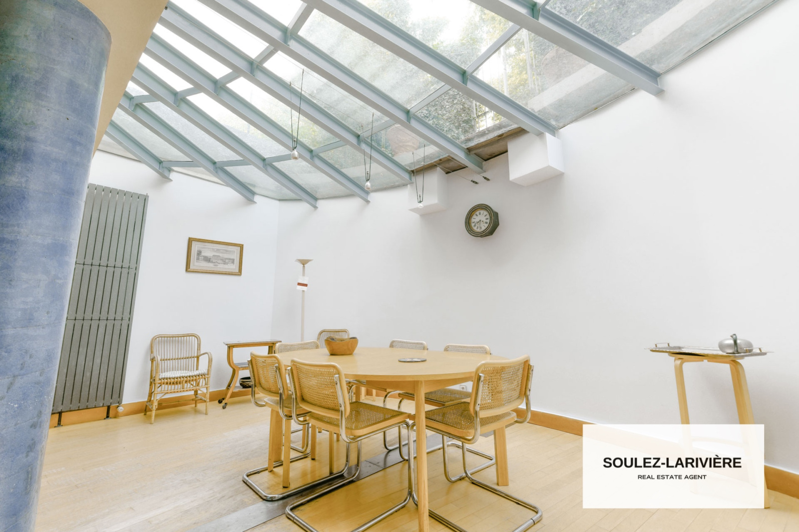 Au rez-de-jardin, un plateau d'une surface de 90m² accueille un vaste salon cathédrale avec près de 6m de hauteur de plafond donnant sur le jardin arboré sans vis-à -vis. Sur ce même plateau se trouve une cuisine ouverte, aménagée et équipée, s’ouvrant sur une salle à manger spacieuse et lumineuse, sublimée par une verrière laissant passer la lumière naturelle ainsi qu'un espace buanderie. Un espace en mezzanine de 12m2 surplombe le salon.