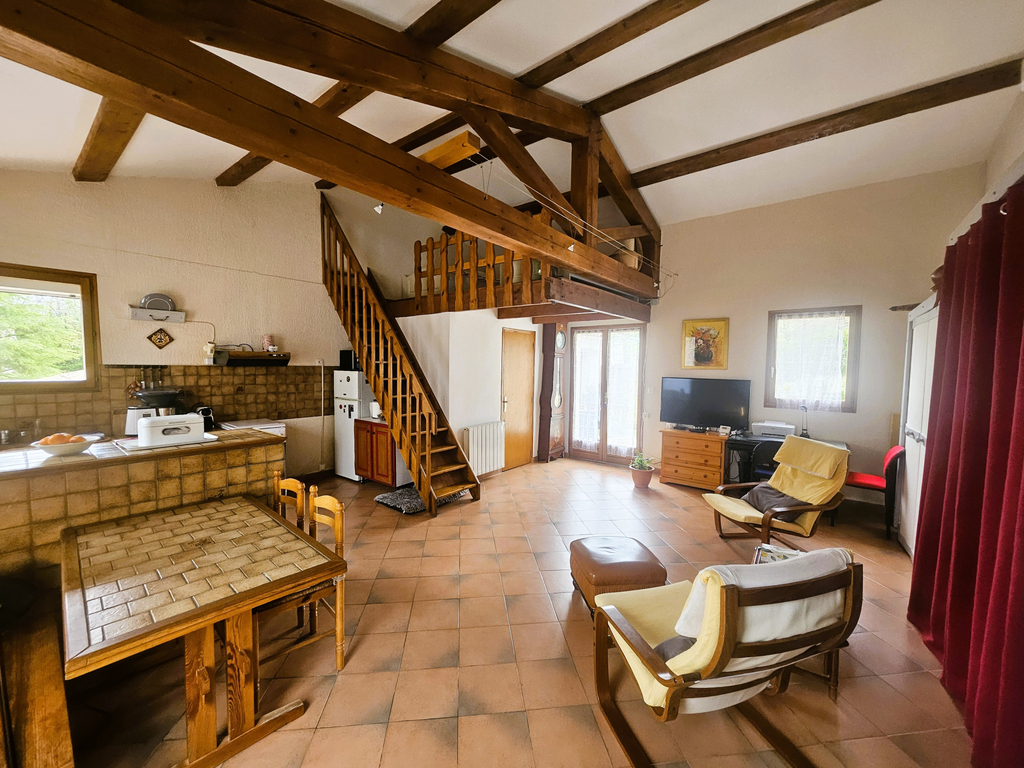 Un studio indépendant de 50 m², avec séjour, salle d’eau et chambre en mezzanine, complète l’ensemble. Il bénéficie d’un accès privatif et génère actuellement un revenu locatif de 500 € par mois.