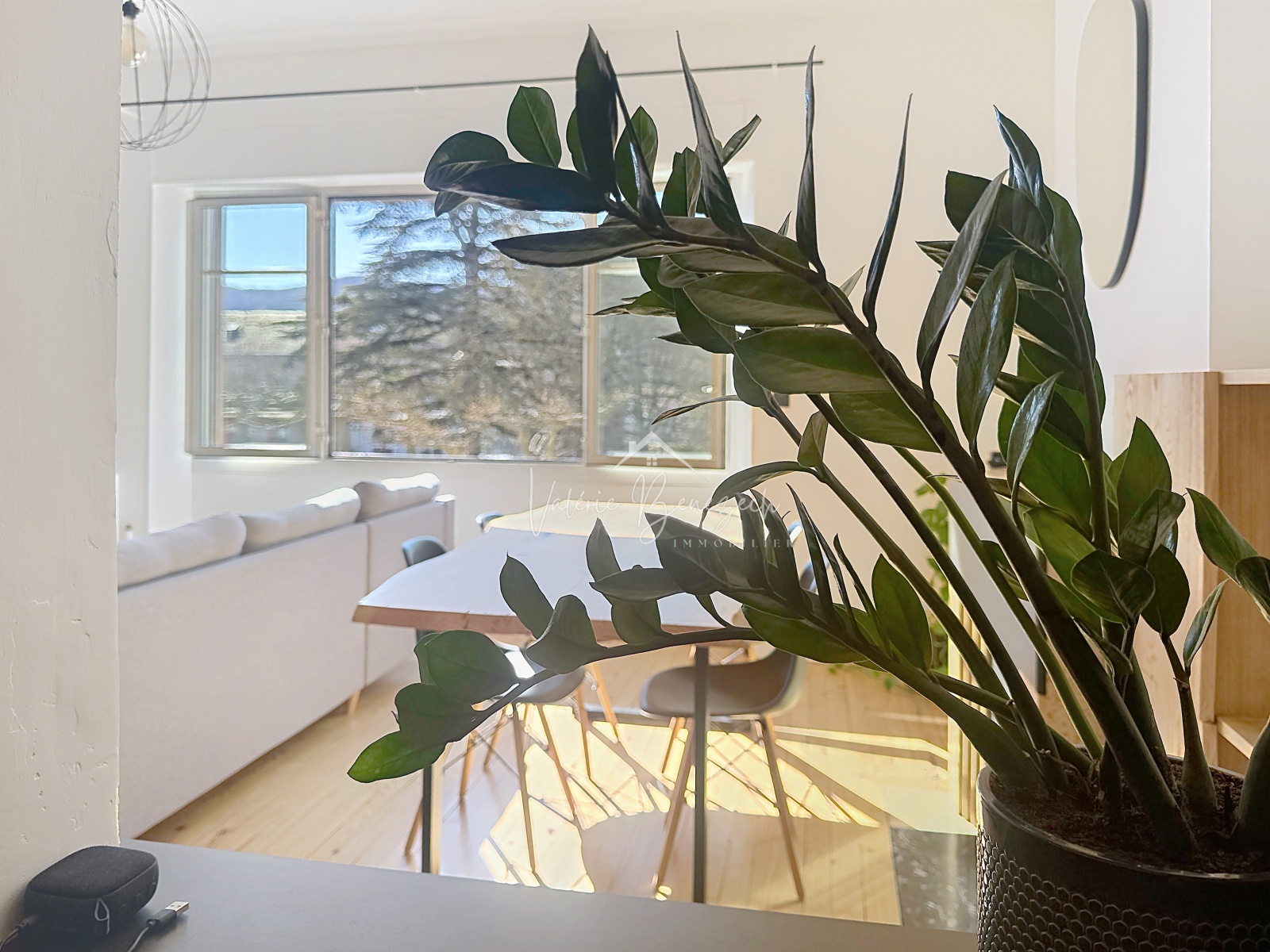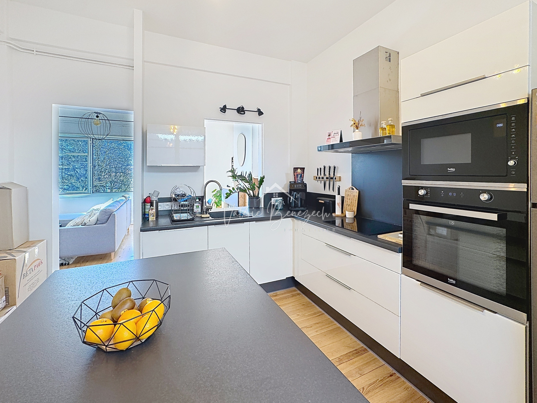 Le salon-séjour spacieux invite à la détente et aux moments partagés. La cuisine équipée, moderne et fonctionnelle, prolonge cet espace de vie convivial.