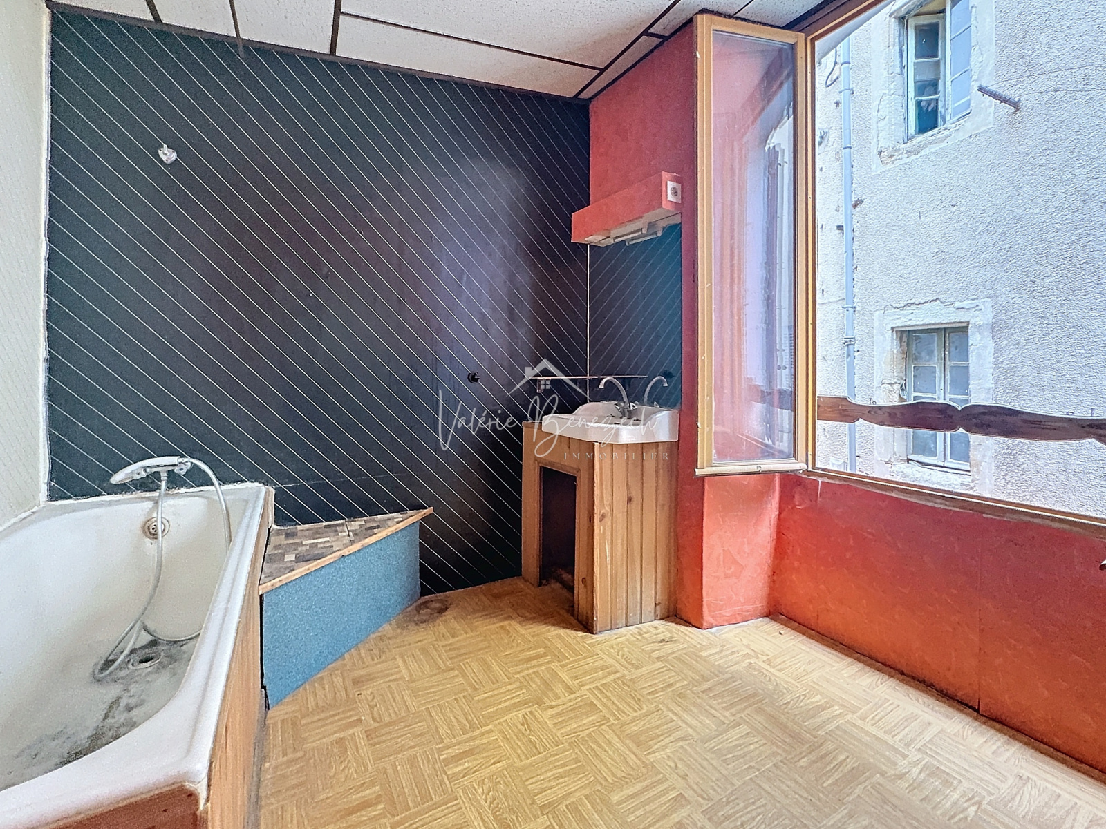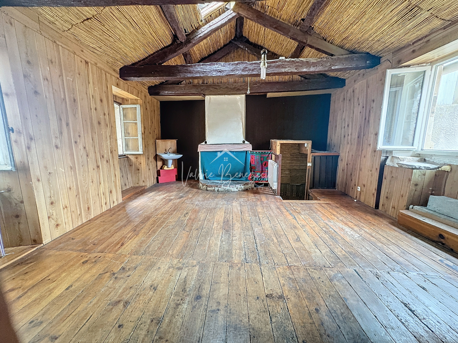 Parquet, évier et cheminée