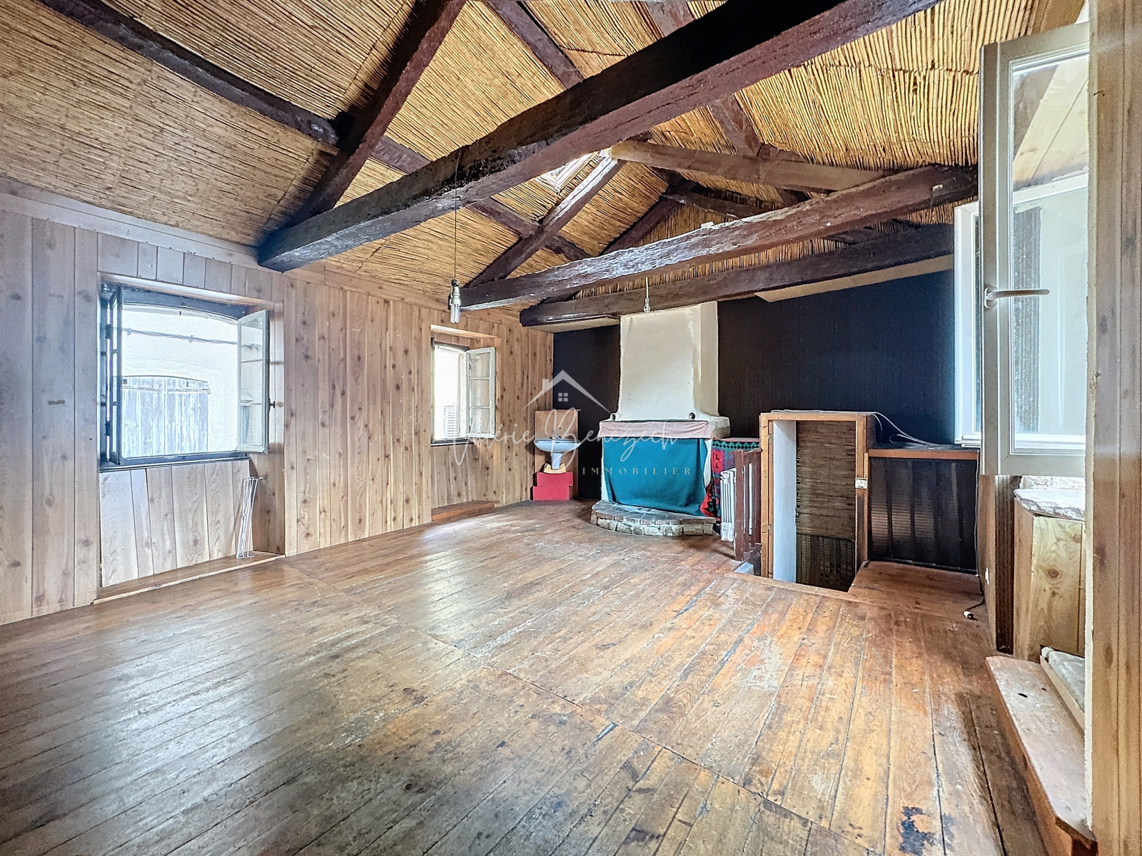 - Une grande pièce à vivre lumineuse de 28 m² au deuxième étage, avec une charpente en bois apparente qui apporte authenticité et caractère.