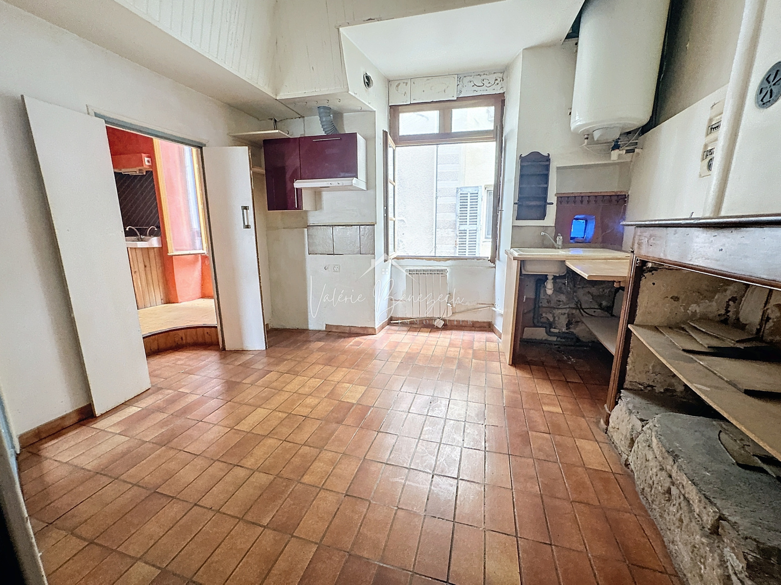 Carrelage, évier, hotte, placards et cumulus