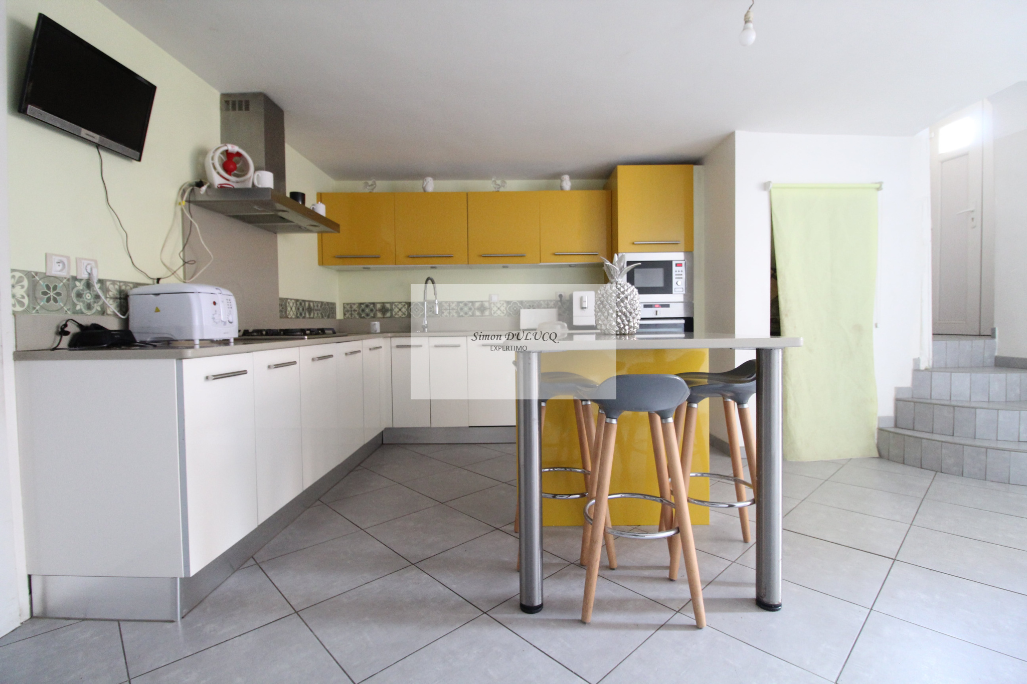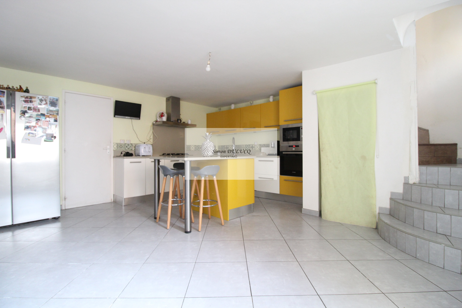 En rez-de-chaussée : une grande cuisine équipée aménagée, WC séparé et cave.