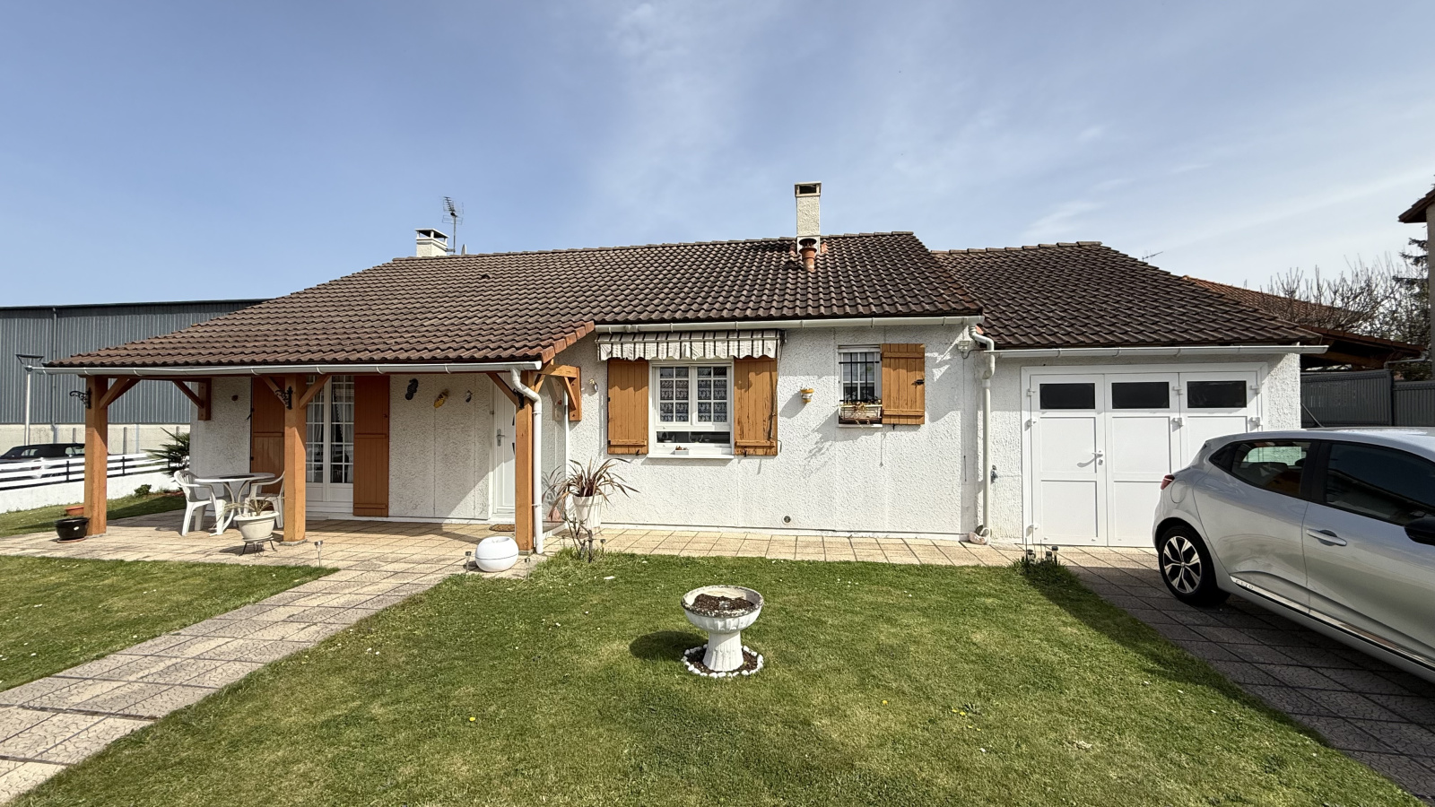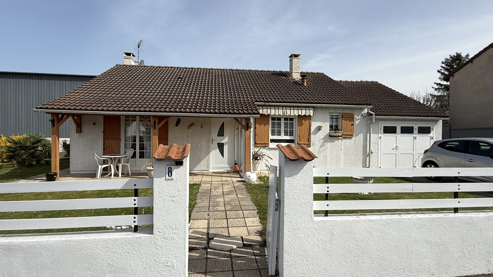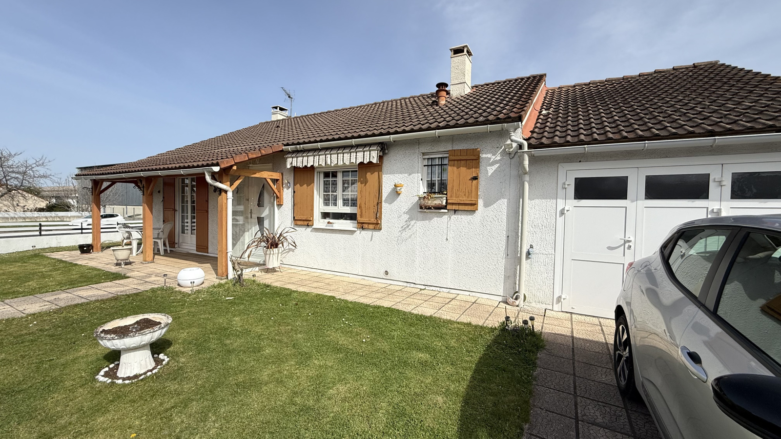 - 3 chambres, 1 bureau, séjour et salle à manger, cuisine équipée, salle d’eau, WC, et garage.