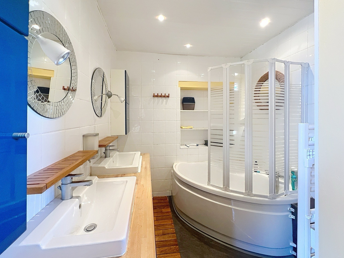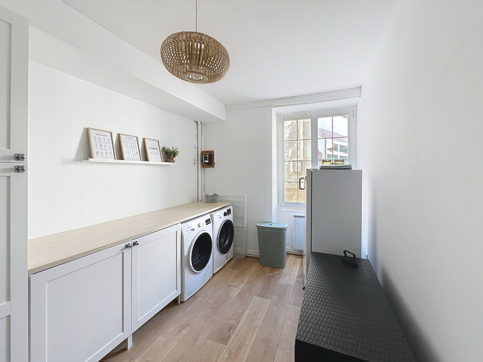 Rez-de-chaussée : une entrée distribue un studio indépendant entièrement rénové, avec salle d’eau neuve et WC — parfait pour recevoir ou pour une activité de location. Un ancien local commercial a été transformé en spacieuse salle de réception avec billard et accès direct au jardin par une cave voûtée en pierre. Buanderie neuve, très lumineuse et fonctionnelle, avec rangements intégrés et plan de travail.
