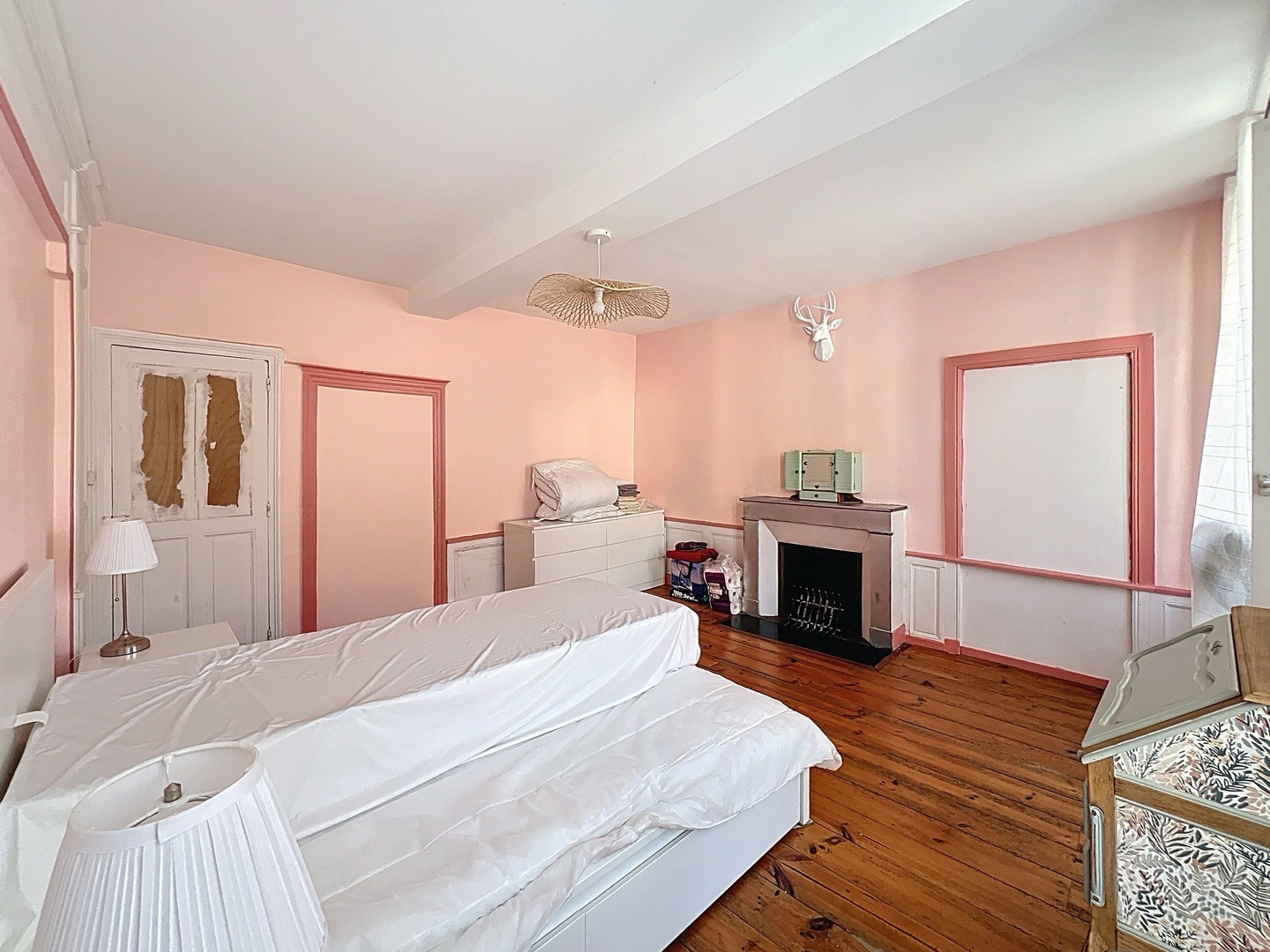 Deuxième étage : trois grandes chambres mansardées avec poutres apparentes, une salle d’eau et des WC.
