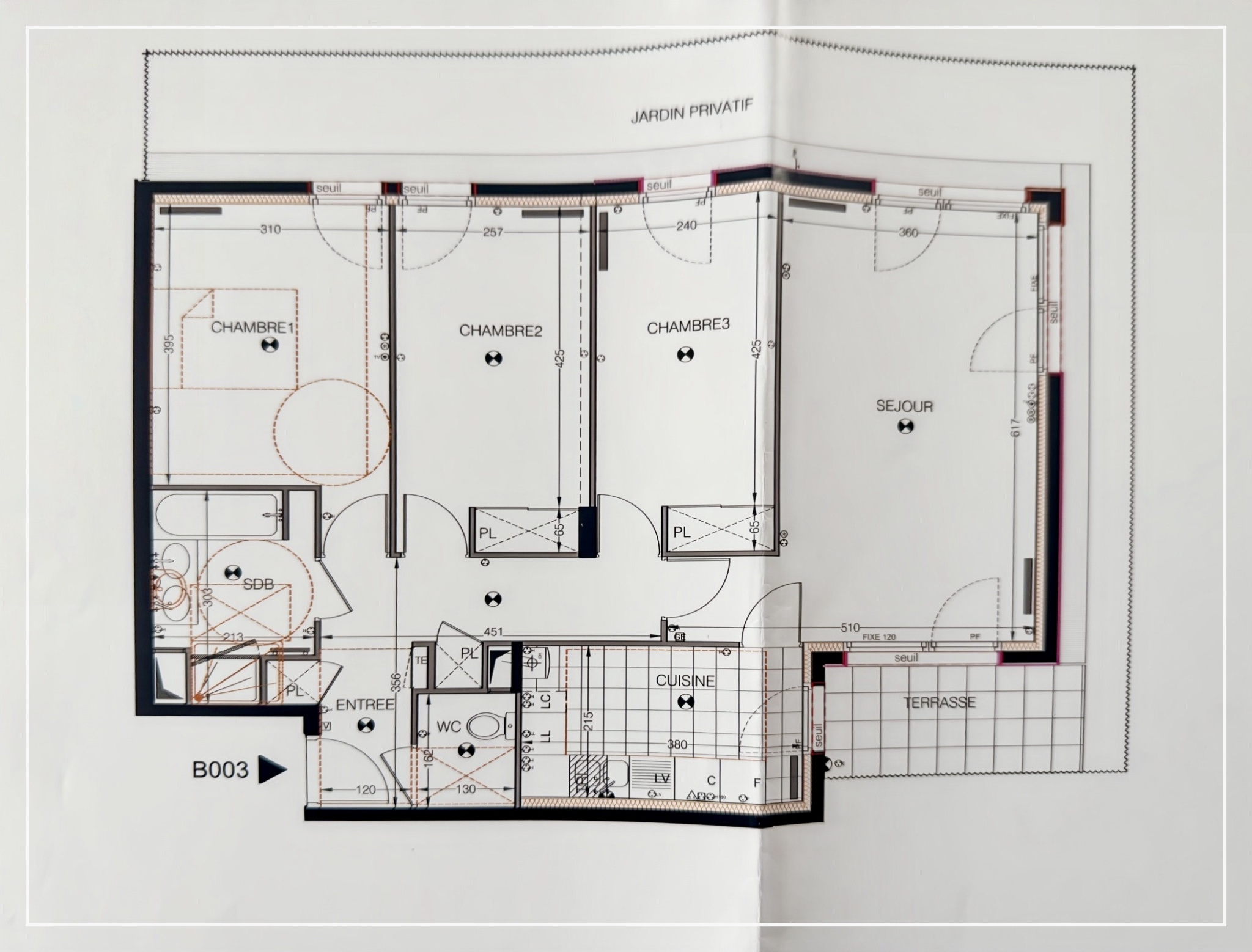 D’une surface de 86,17 m² l’appartement dispose d’un jardin/terrasse privatif de 42,13 m², il se compose d’une entrée avec rangements, d’un séjour/salle à manger traversant de 24,01 m² bien exposé, d’une cuisine de 8,17 m² avec terrasse, de trois chambres (13,10/12,46/11,71 m²) d’un WC séparé, d’une salle de bains avec douche, d’une cave et d’un emplacement de stationnement en sous-sol avec accès direct.