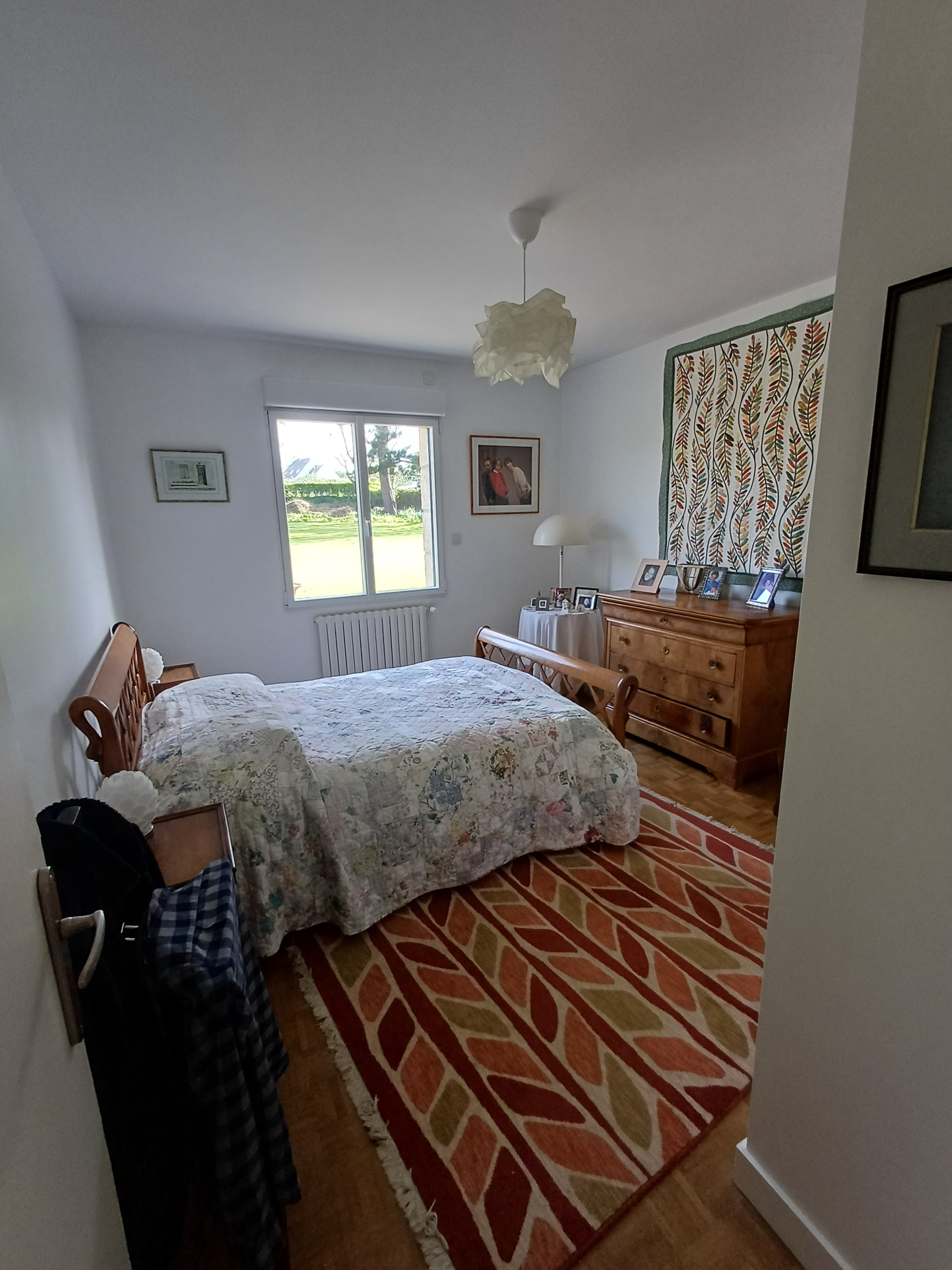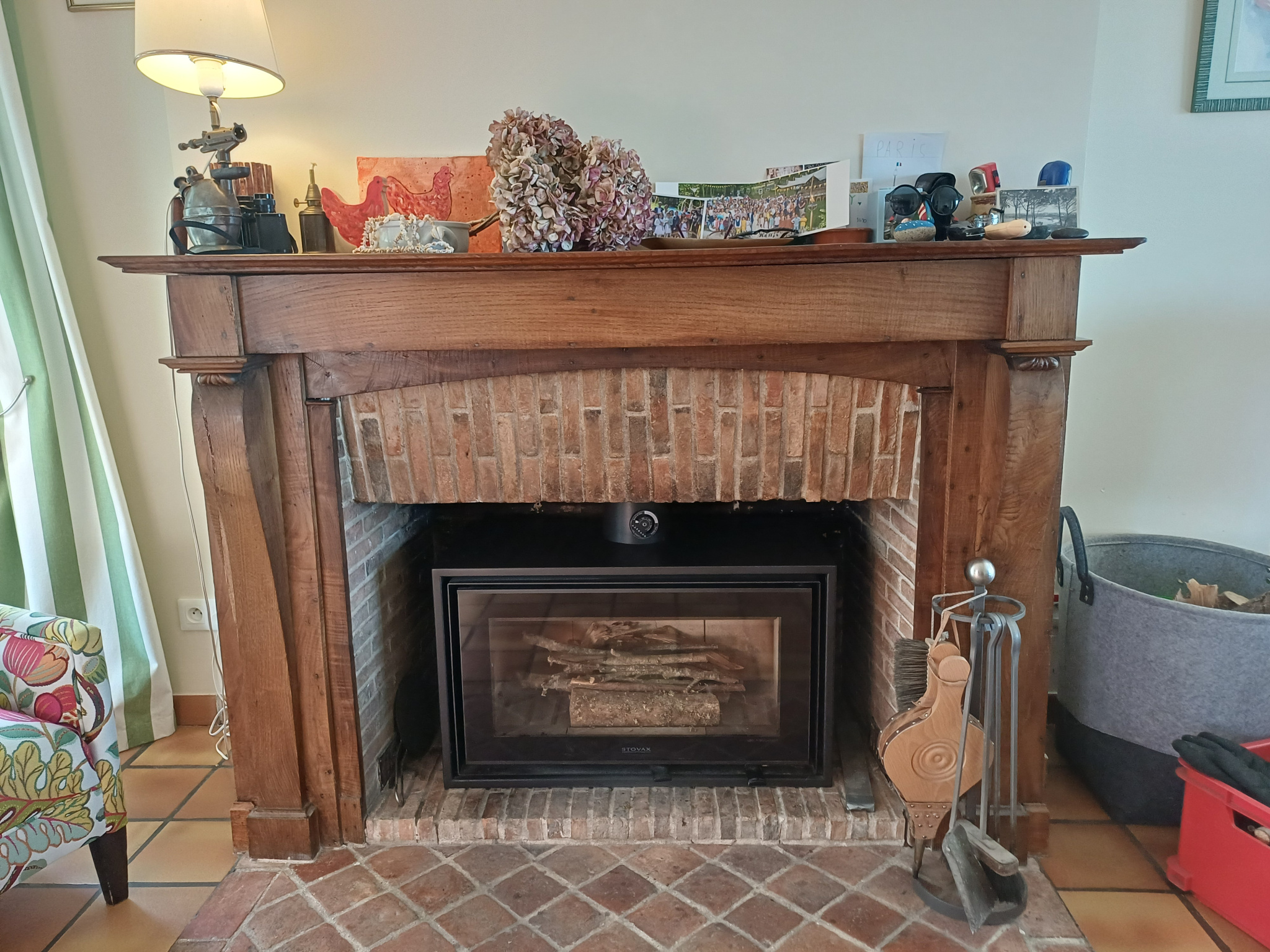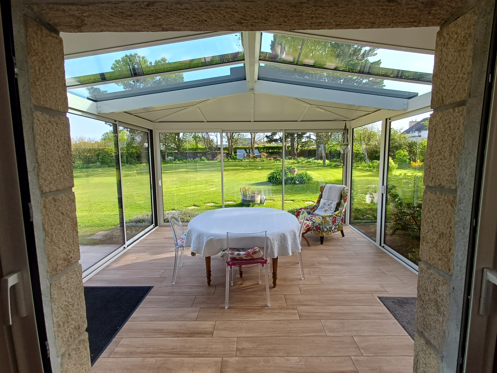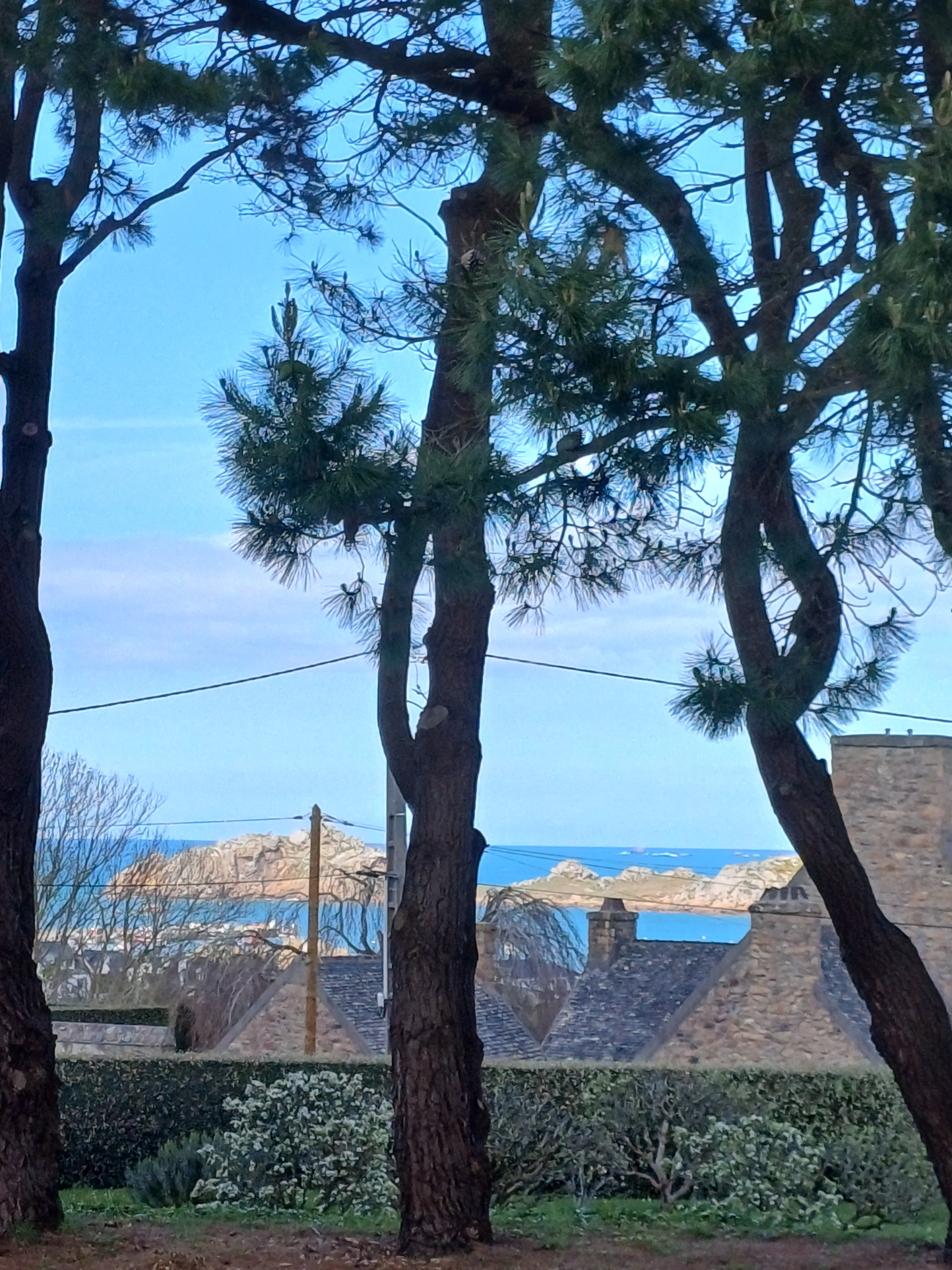 avec une cheminée équipée d'un insert et une vue mer sur la pointe de Primel.