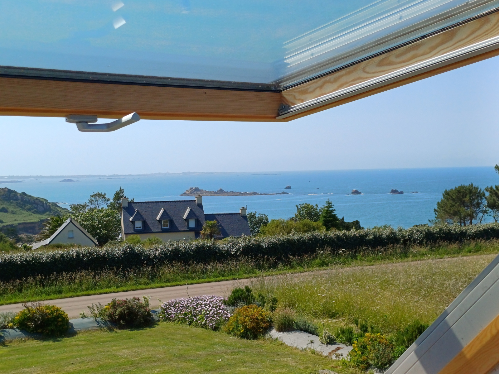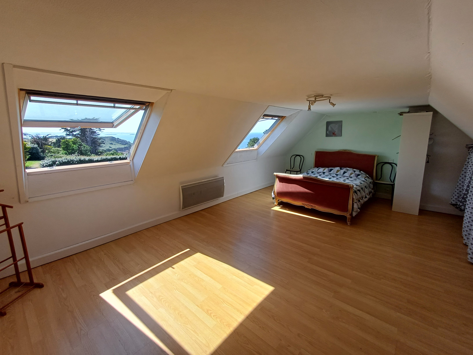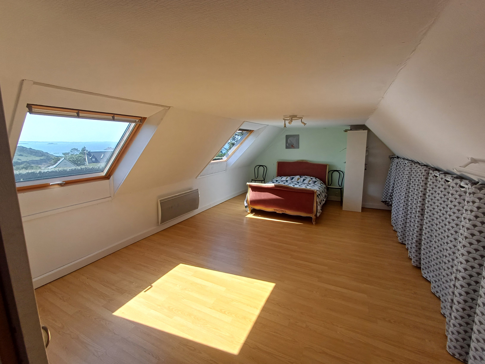 Plougasnou, Le Diben, maison deux chambres, belle vue mer sur 1400 m2 de terrain. Lumineuse exposition Est Ouest pour cette maison située en zone naturelle qui vous propose au rez de chaussée, une pièce de vie à usage de salon salle à manger cuisine avec un poêle à bois et un accès direct à une terrasse vue mer. Une salle d'eau et un wc indépendant.