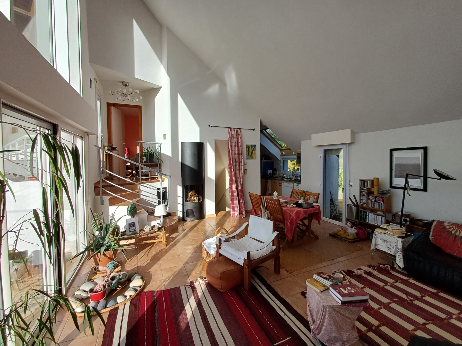 Construite en 1999 face à la mer avec une belle exposition Ouest, cette maison d'architecte vous propose au rez de chaussée, un lumineux salon séjour équipé d'une cheminée à bois et donnant directement sur une terrasse vue mer.