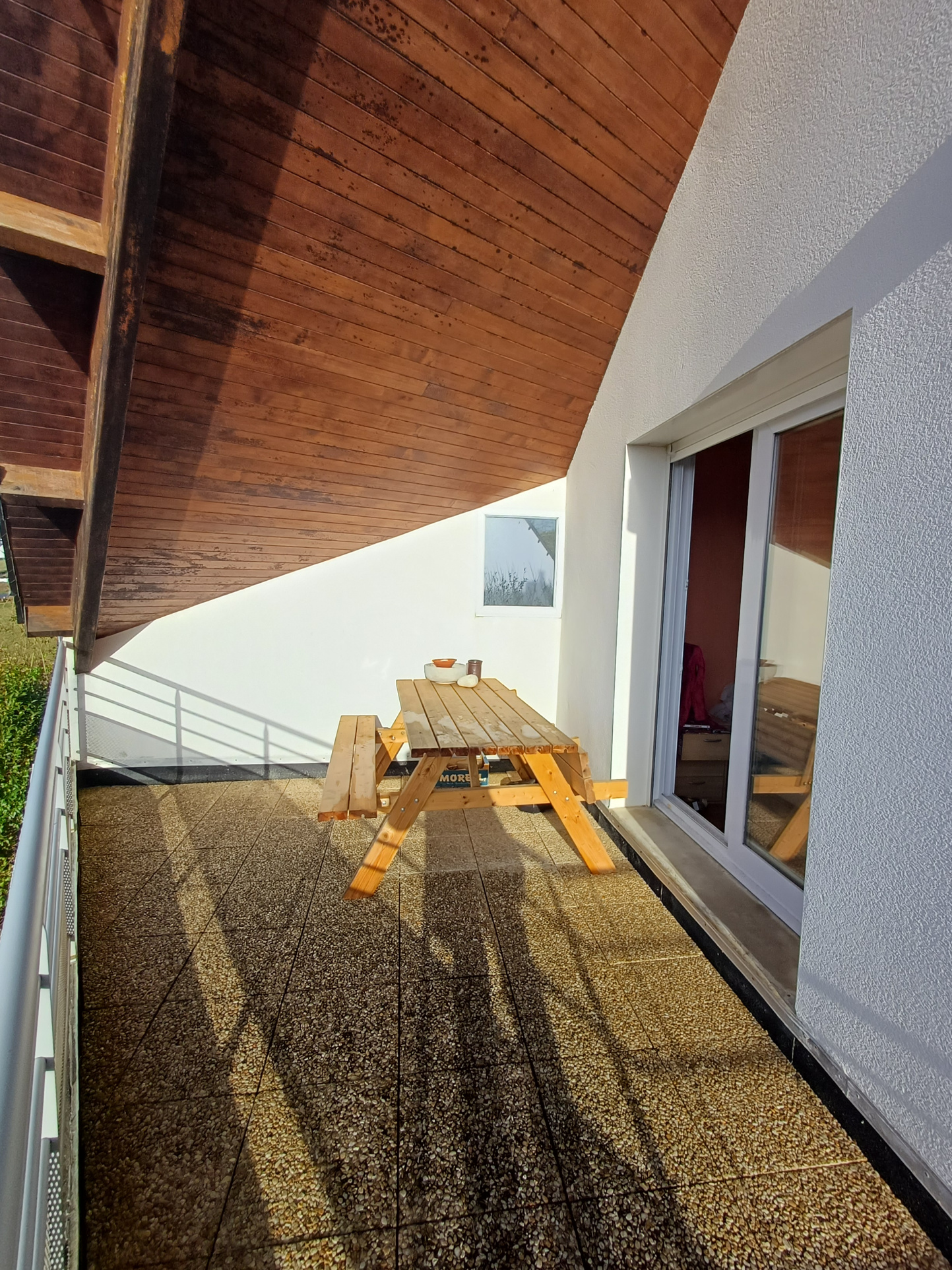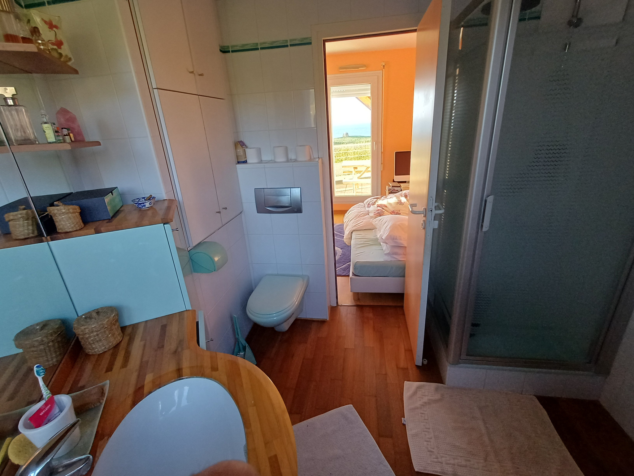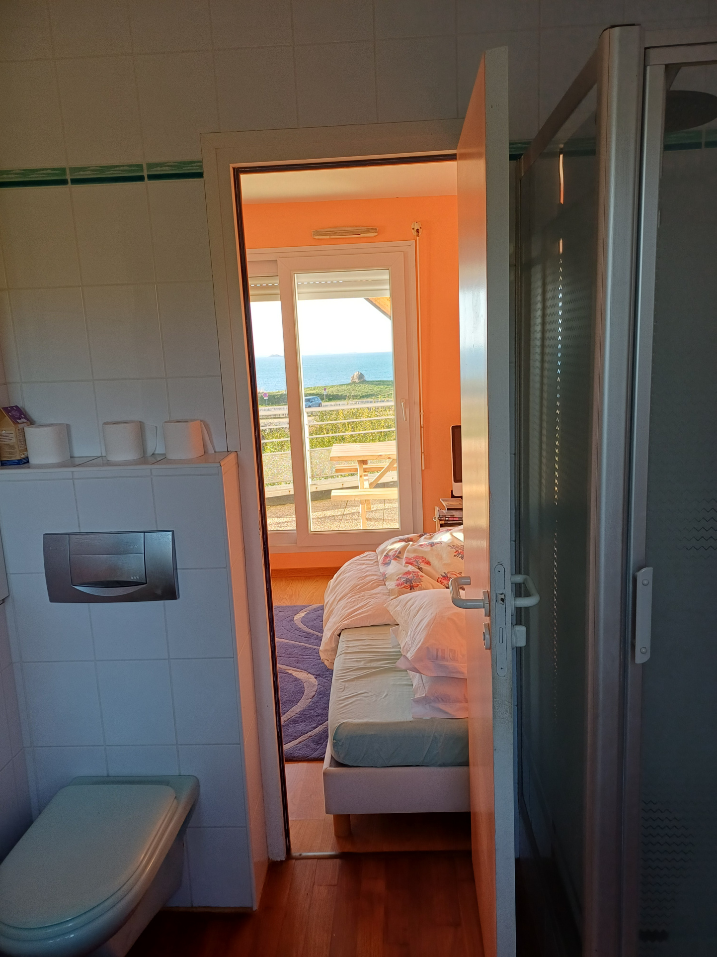 En demi étage, une chambre avec une terrasse balcon pleine vue mer, et une salle d'eau privée avec wc.