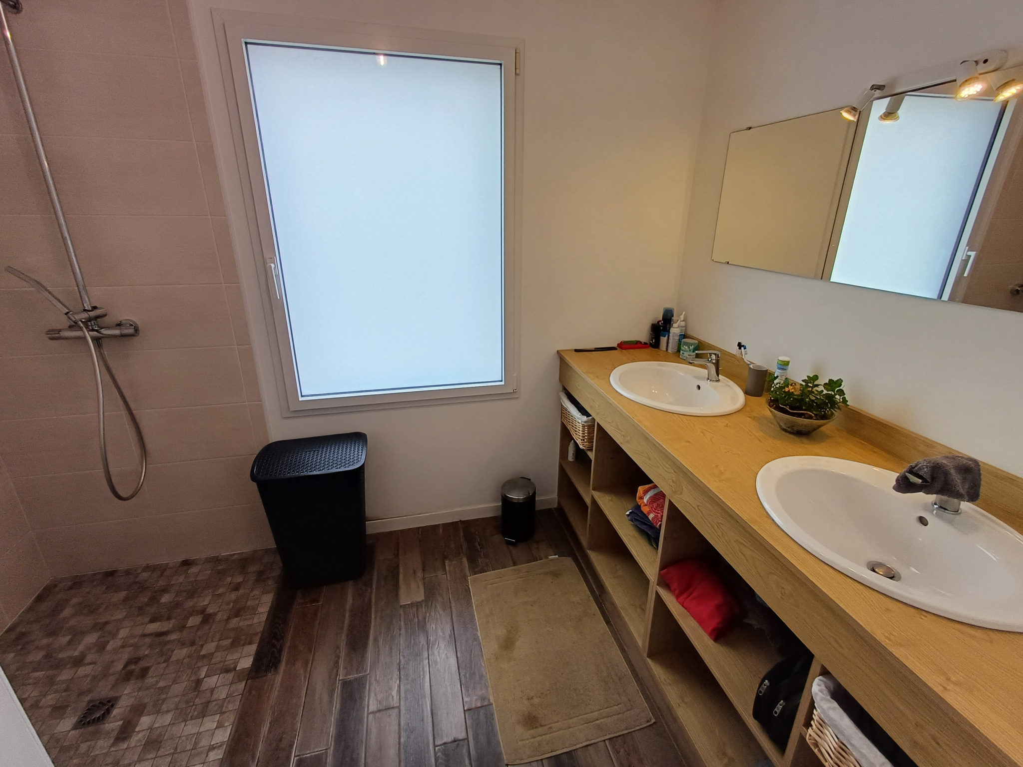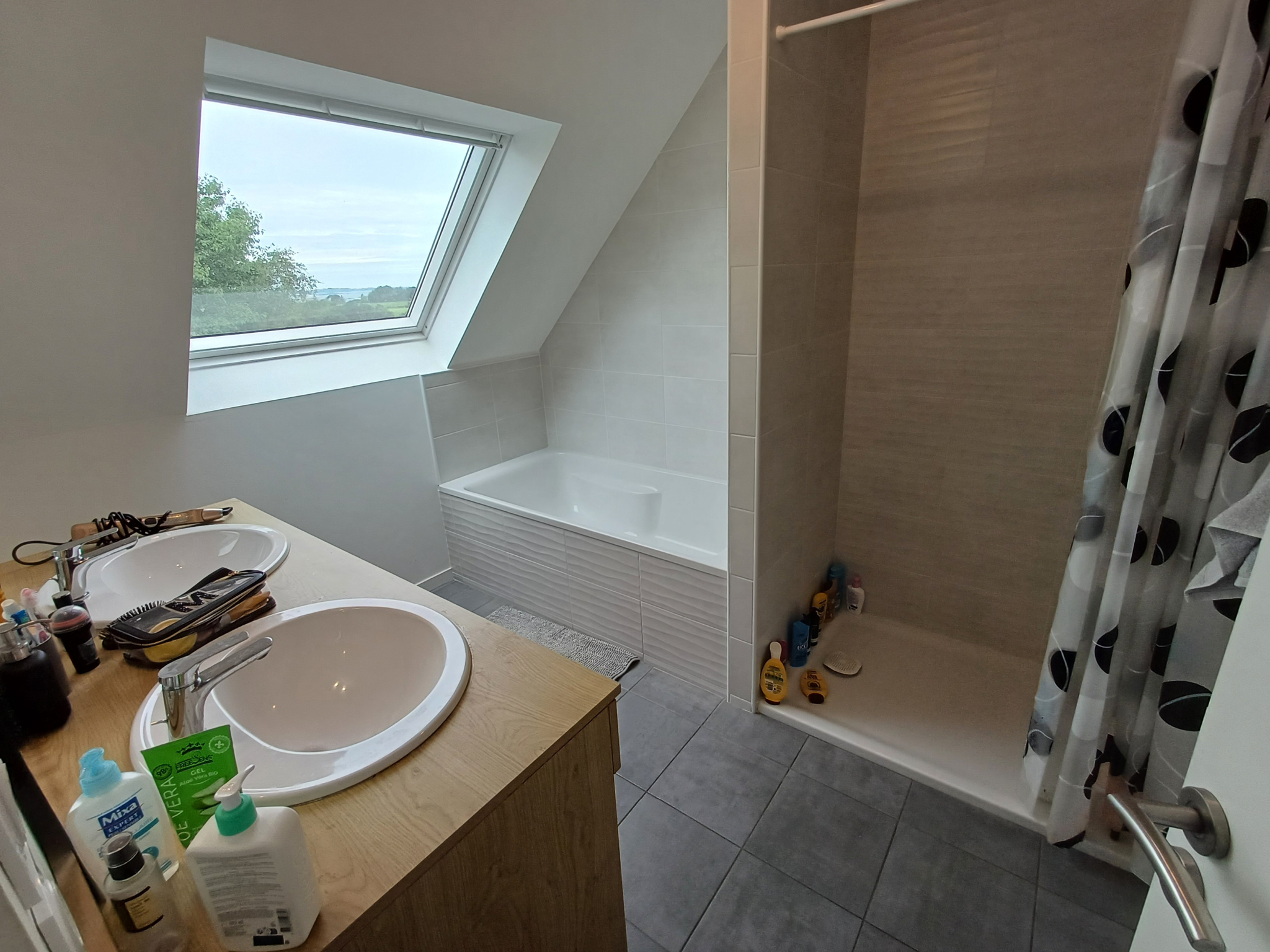 A l'étage, grand palier bureau télé, trois chambres, une salle de bains avec douche et baignoire et un wc indépendant.