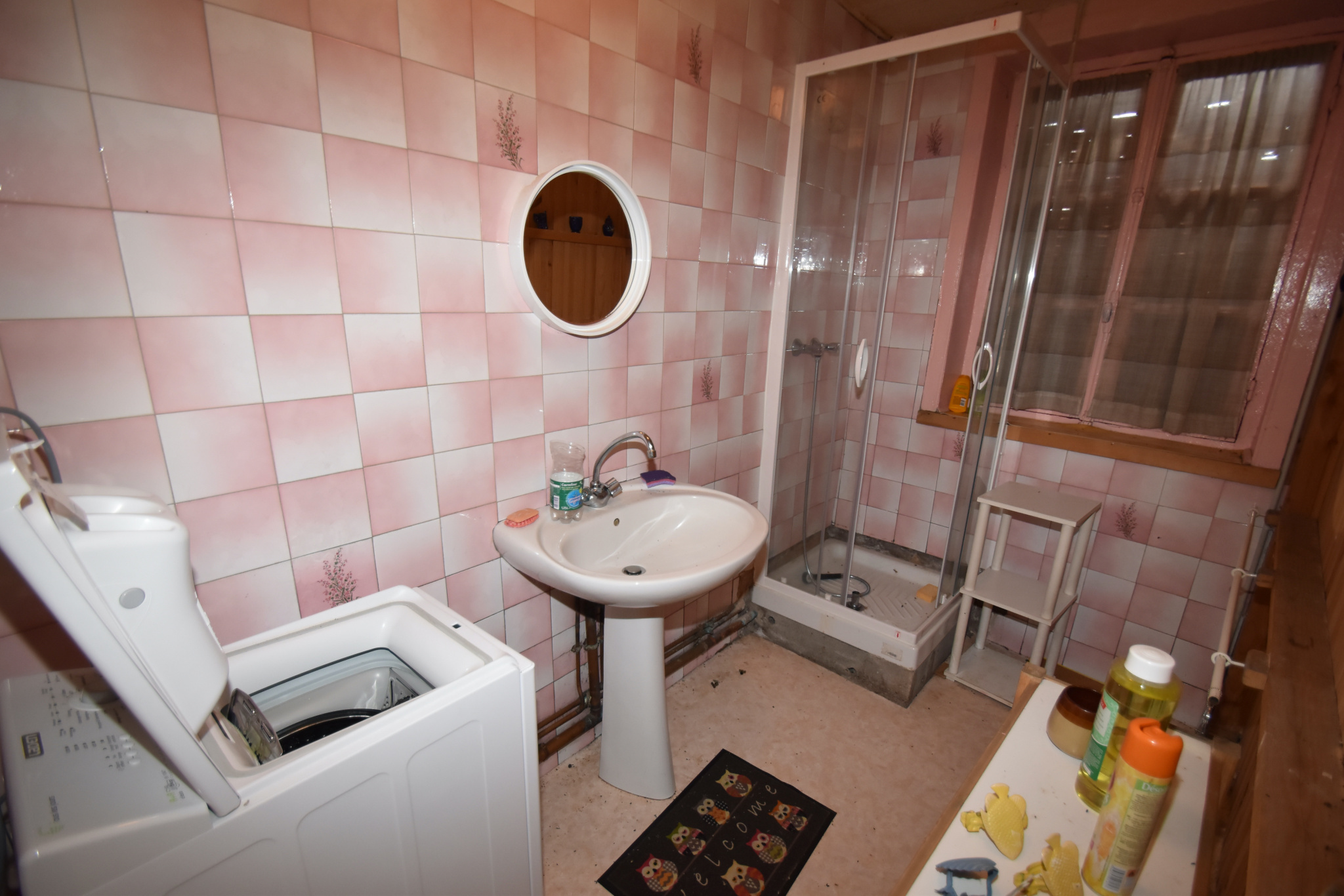 bac à douches cabine, vasque sur colonne, emplacement lave linge