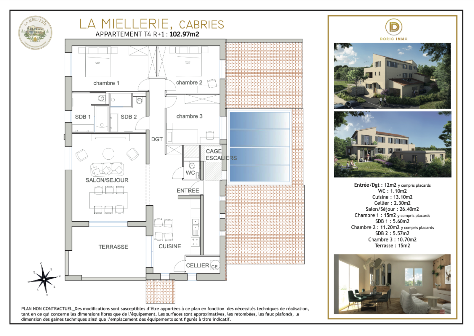 Parmi ces lots, un appartement de type 4 développe une surface généreuse de 103 m², agrémentée d’une terrasse de 15 m² idéalement exposée Sud-Est, offrant un cadre de vie lumineux et privilégié.