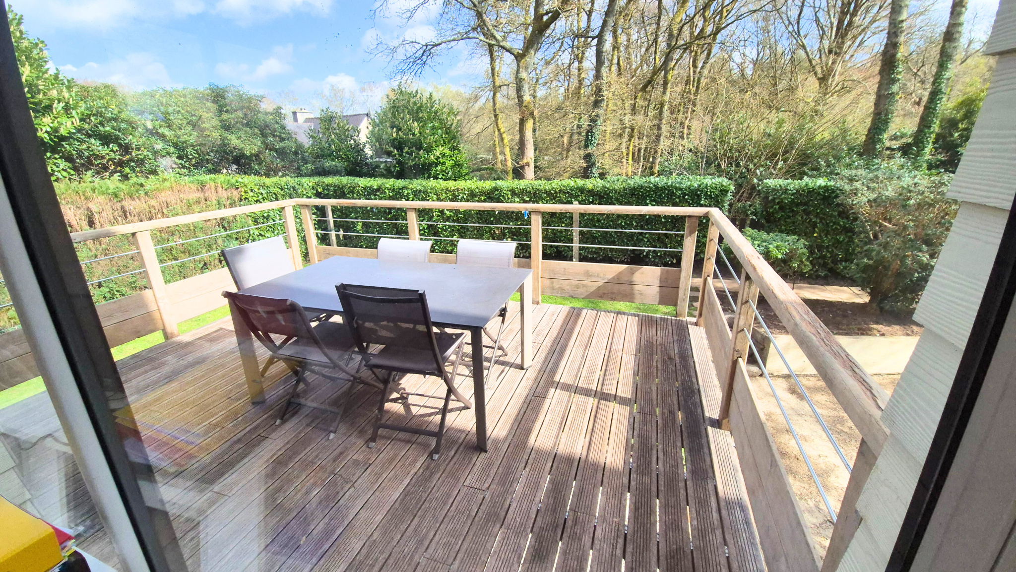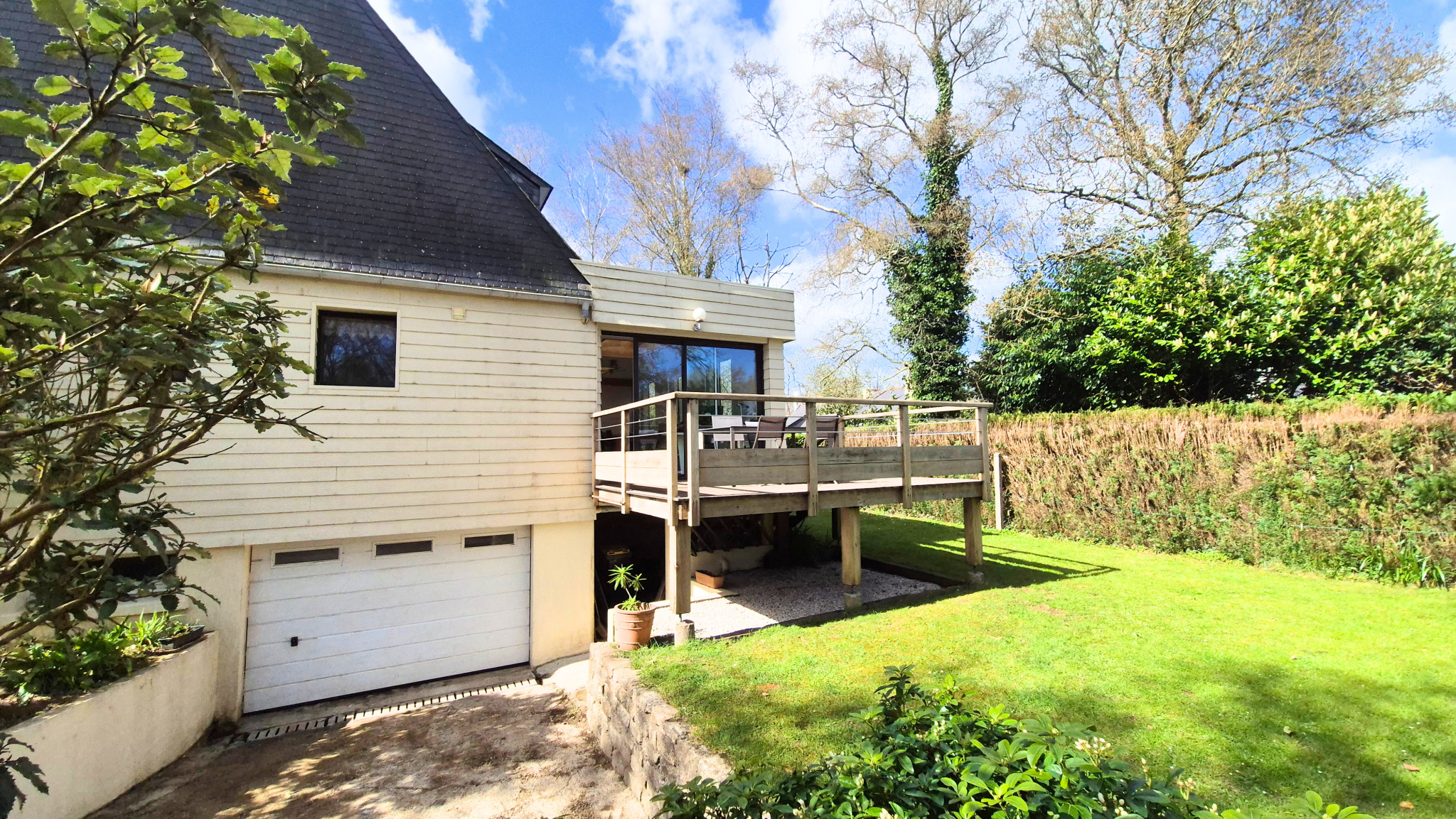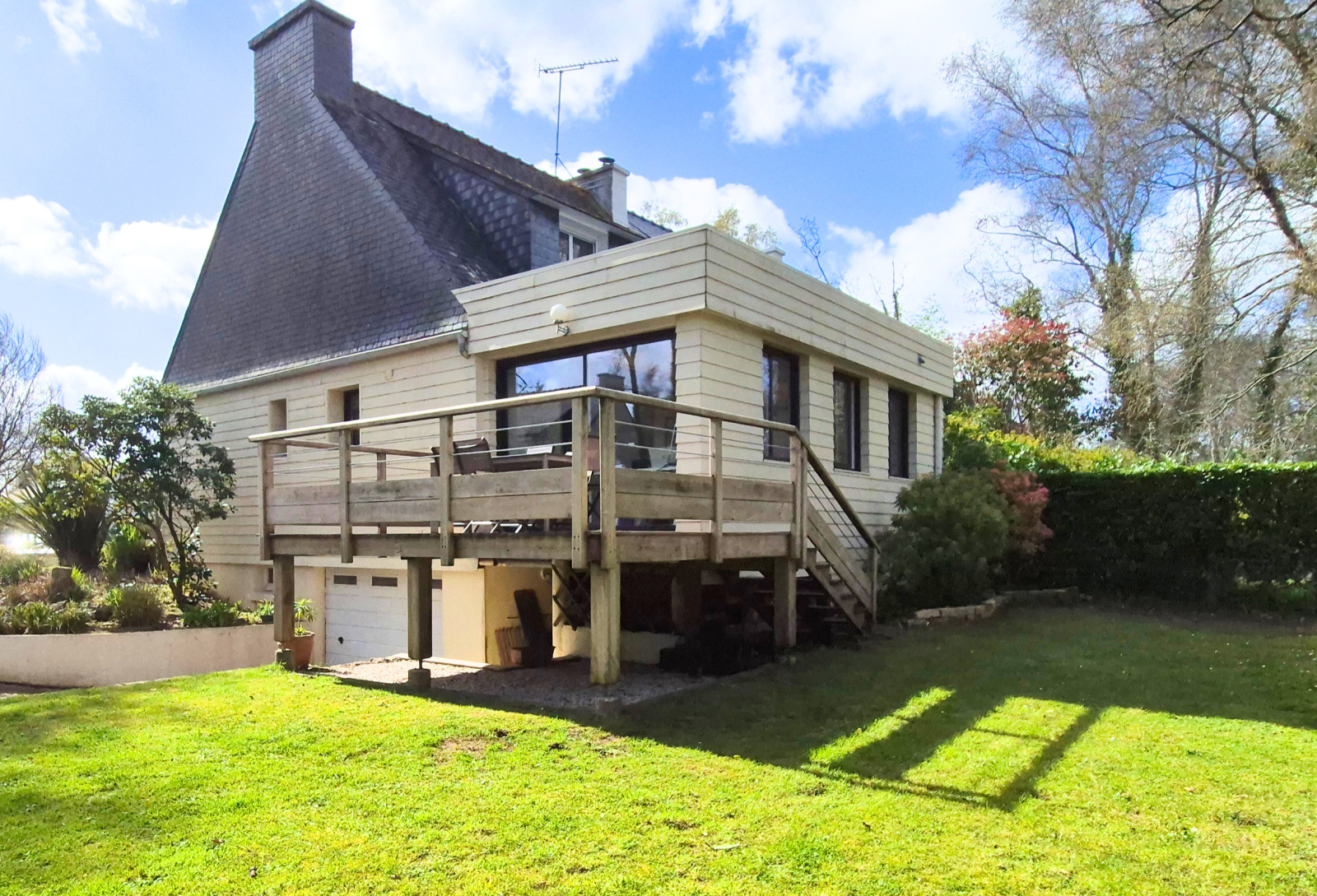Vous aimerez beaucoup cette magnifique extension sur l'arrière prolongée d'une terrasse en bois sur pilotis sans aucun vis à vis !