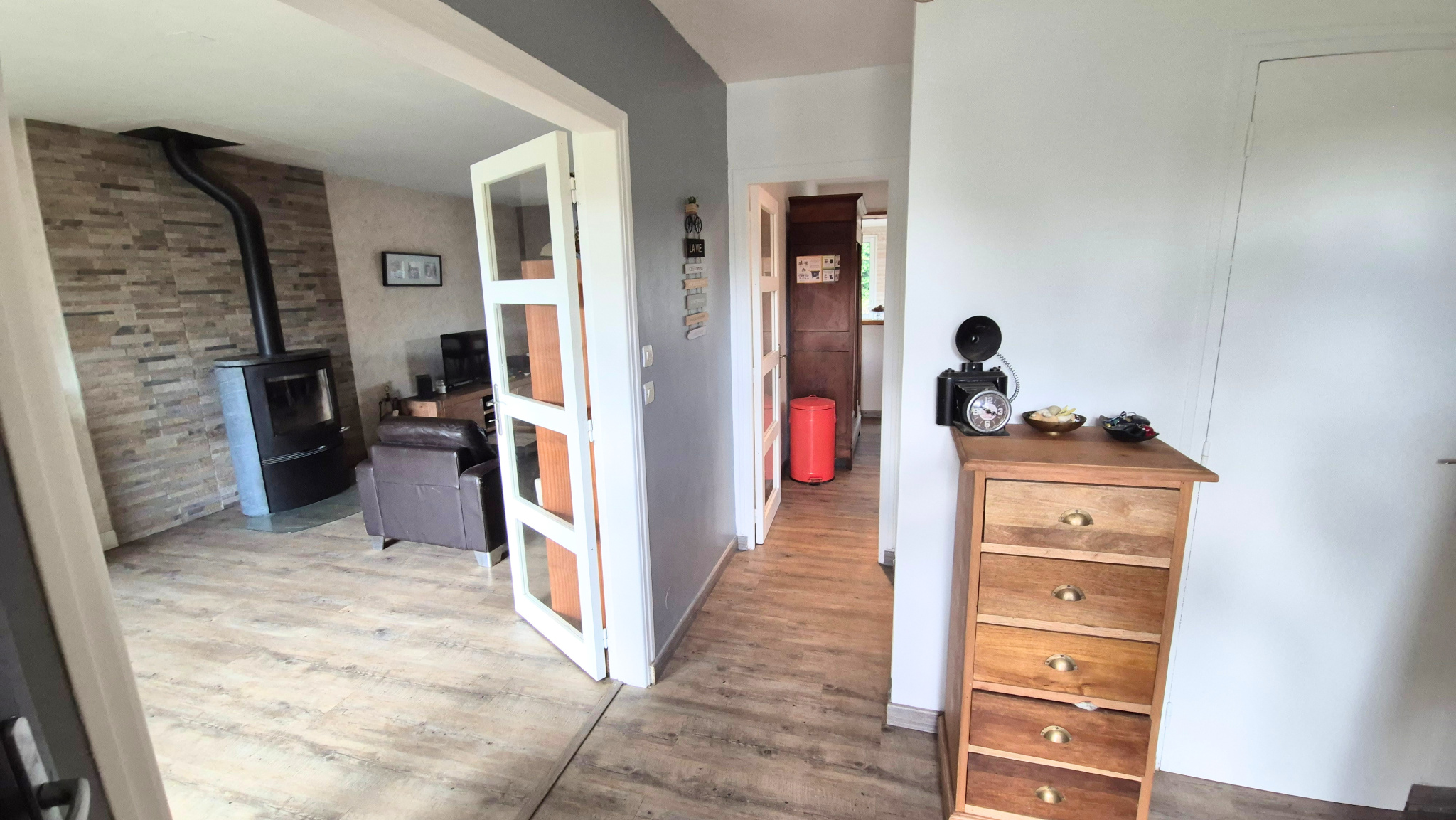 Vous disposez au rez de chausée d'une entrée, d'un wc, d'une cuisine équipée et d'un séjour salon de 47 m² avec un poêle à bois avec cette vue très agréable sur la nature environnante ! (Magnifique !)