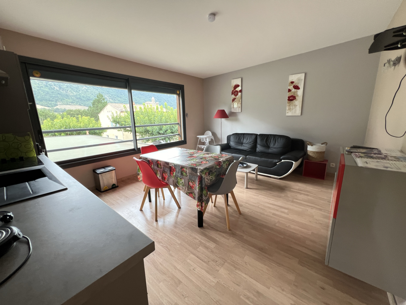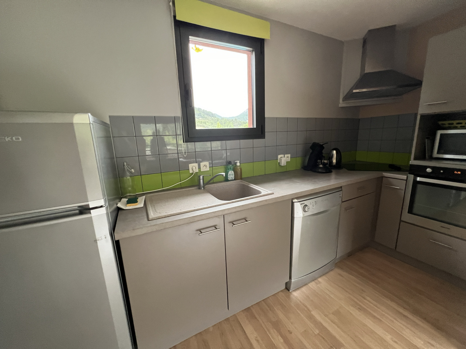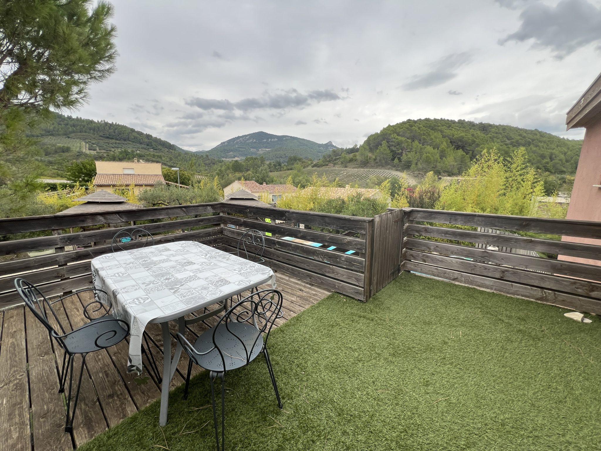Un gite de 50 m2 : Entrée, cuisine équipée, pièce à vivre, dégagement, chambre, salle d'eau, WC - Terrasse avec belle vue sur les collines.
