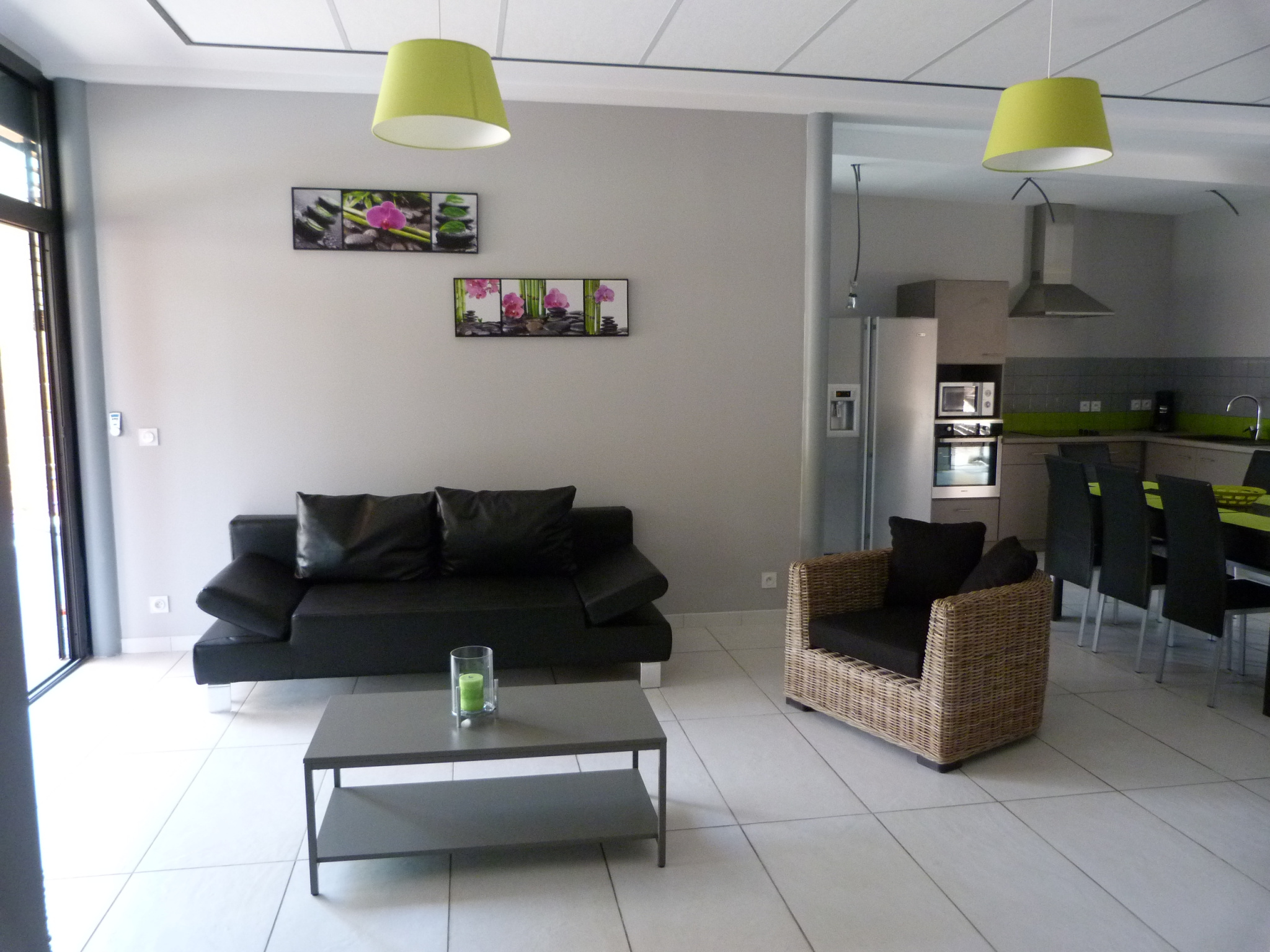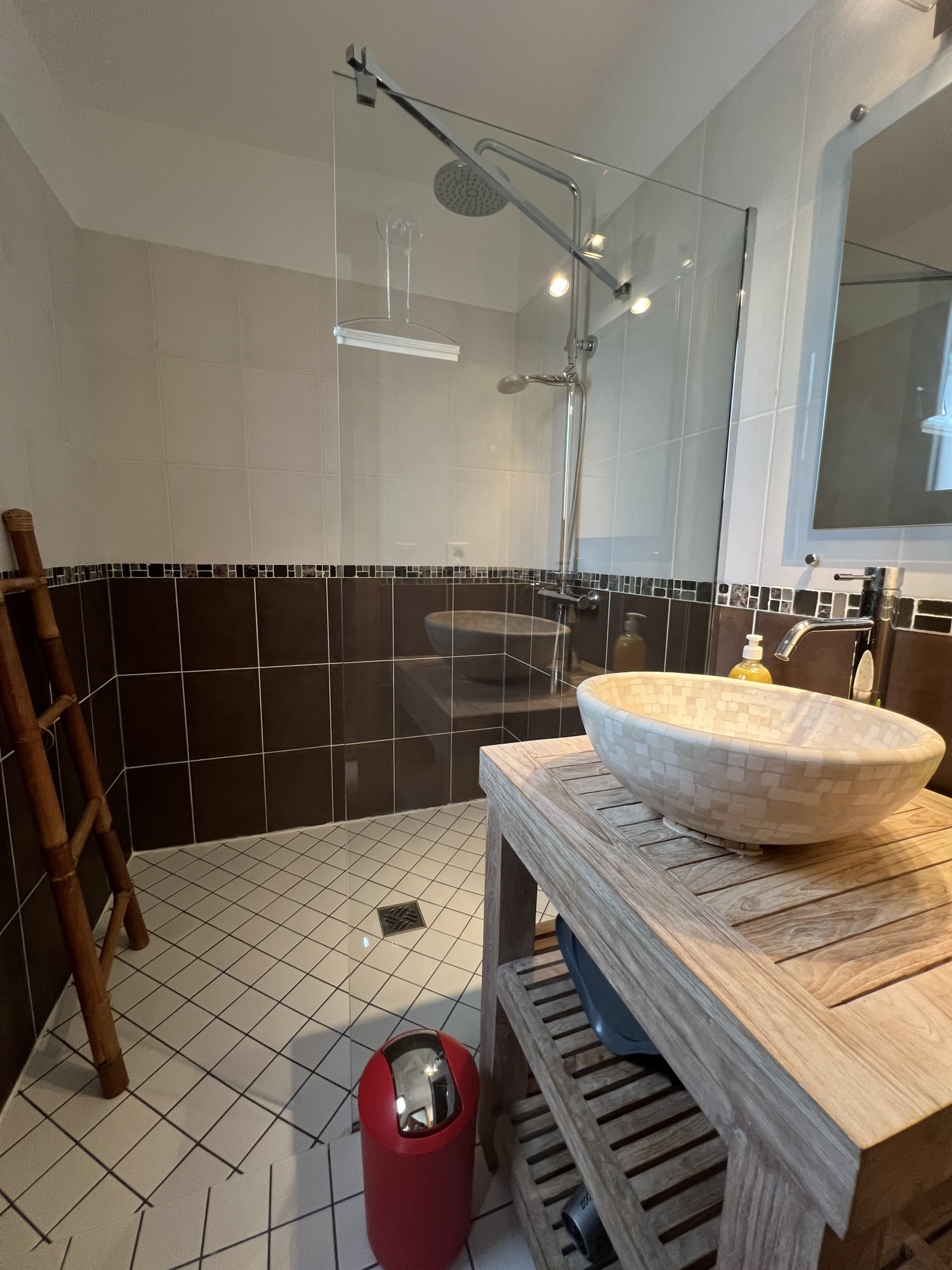 Un gite de 75 m2 : Entrée, cuisine équipée, salon, chambre, coin lit cabine, cave à vin vitrée, 2 WC, buanderie - Magnifique terrasse de 120 m2 en partie couverte (20 m2).