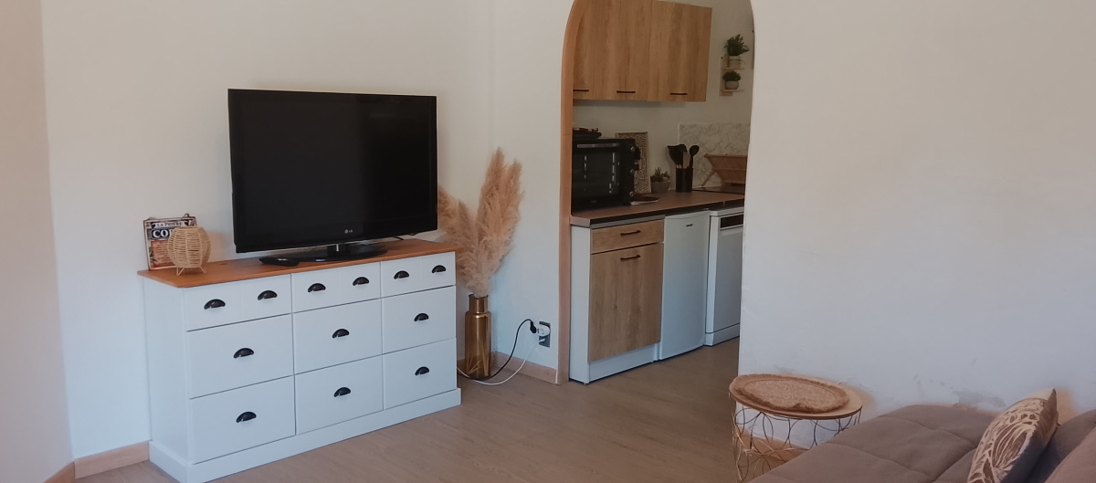 Charmant studio, travaux récents, meublé avec cuisine équipée et son coin nuit, avec un beau séjour donnant sur la terrasse côté montagne