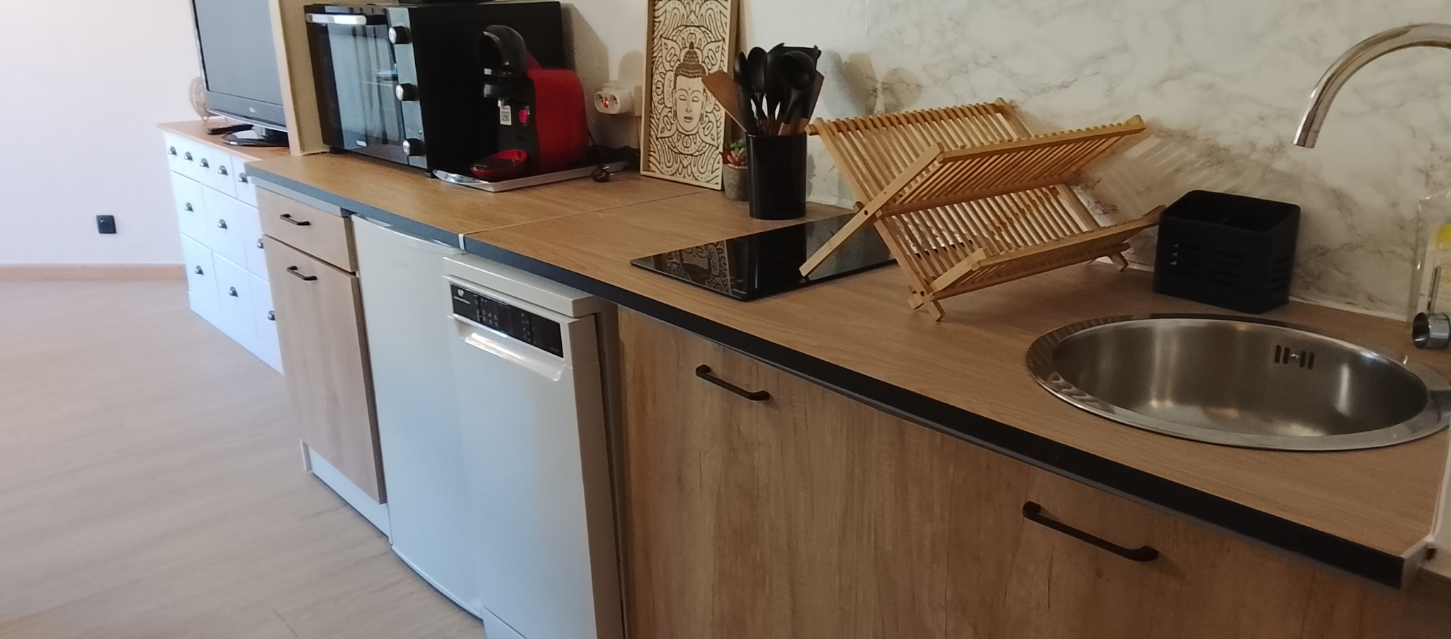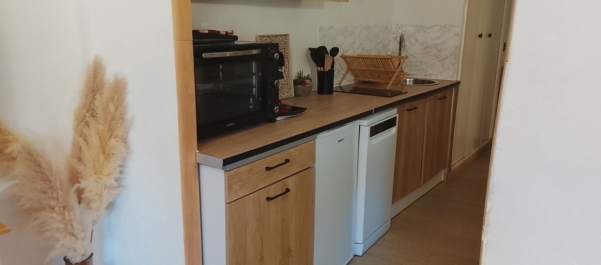 Studio avec cuisine équipée, coin nuit et séjour donnant sur la terrasse + 1 salle d'eau + WC