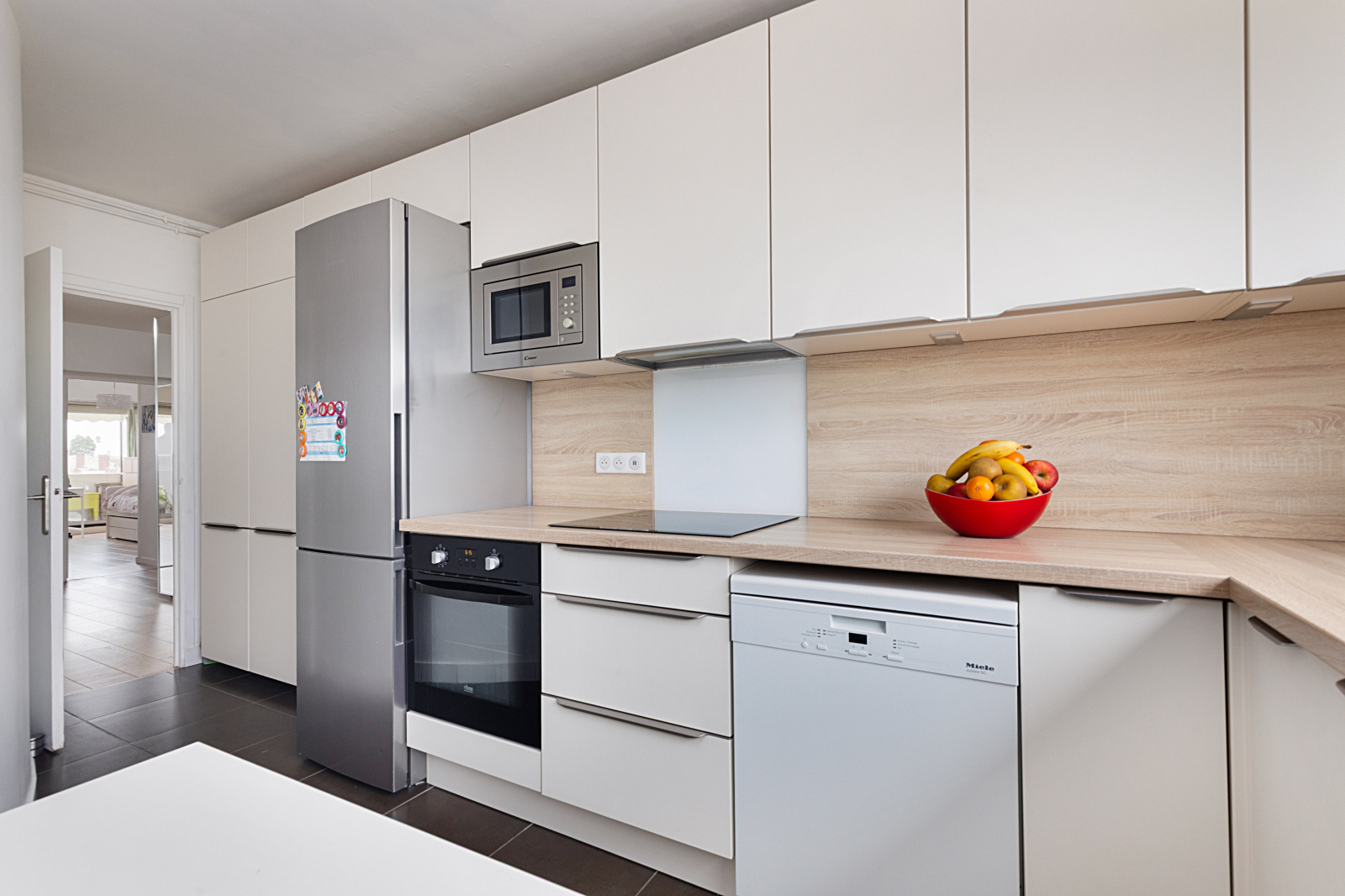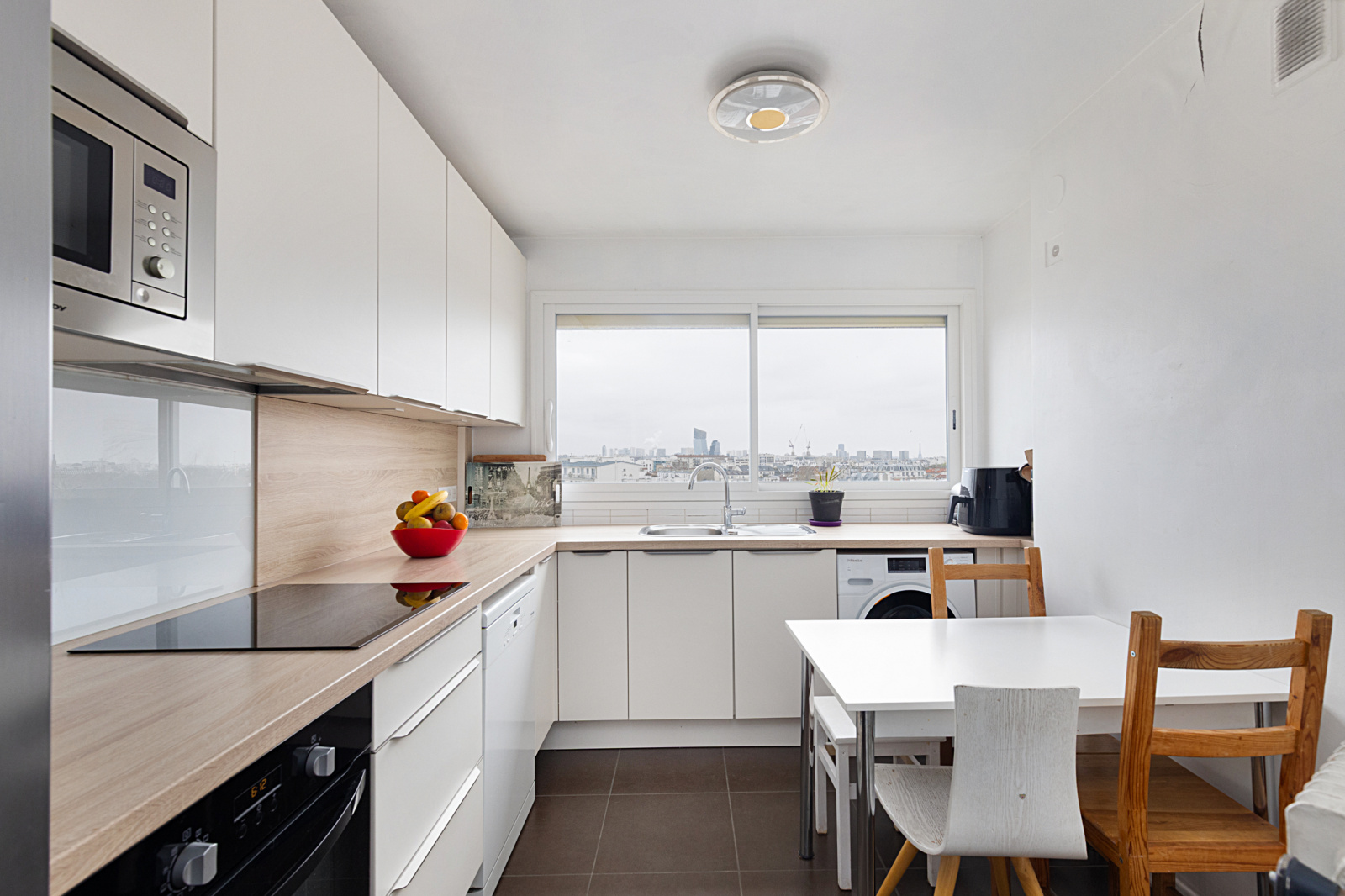 - une cuisine indépendante avec coin repas offrant une vue panoramique vers Paris, la tour Eiffel, le Sacré Coeur...