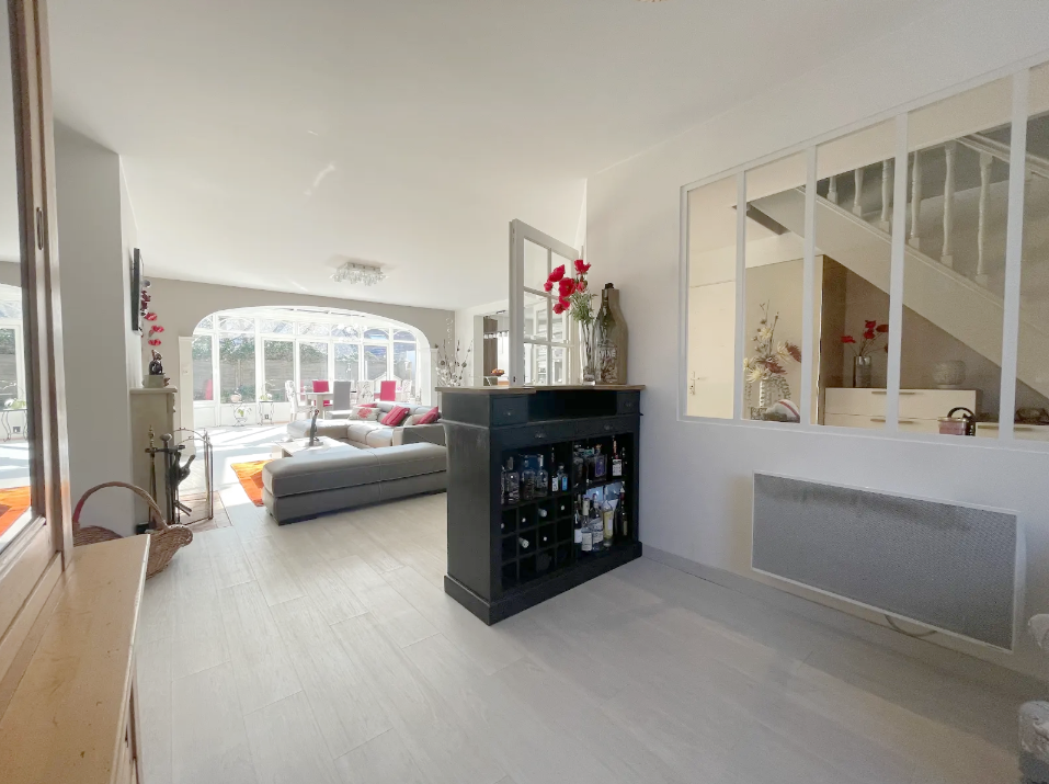 Cette maison vous offre au RDC, une belle entrée avec verrière et rangements conduisant à un espace de vie de 68m2 aménagé en partie salon avec cheminée de charme pour les moments de détente donnant sur une véranda spacieuse avec vitrages isolants et volets roulants électriques, cuisine ouverte équipée avec bar, WC indépendants, garage, cave et cellier isolé attenant pour chambre ou atelier.