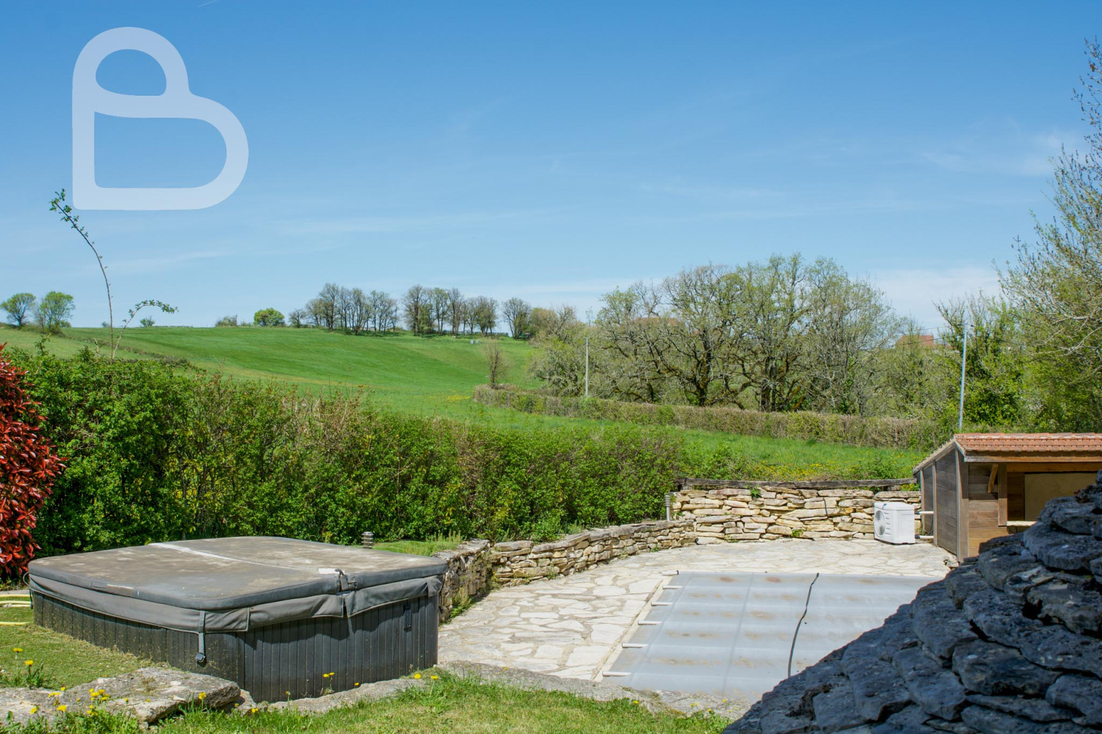 La piscine chauffée (4 x 8 m), fonctionnant au sel et sécurisée par une couverture, est accompagnée d'un jacuzzi, offrant un espace de détente avec une vue magnifique sur la campagne environnante.