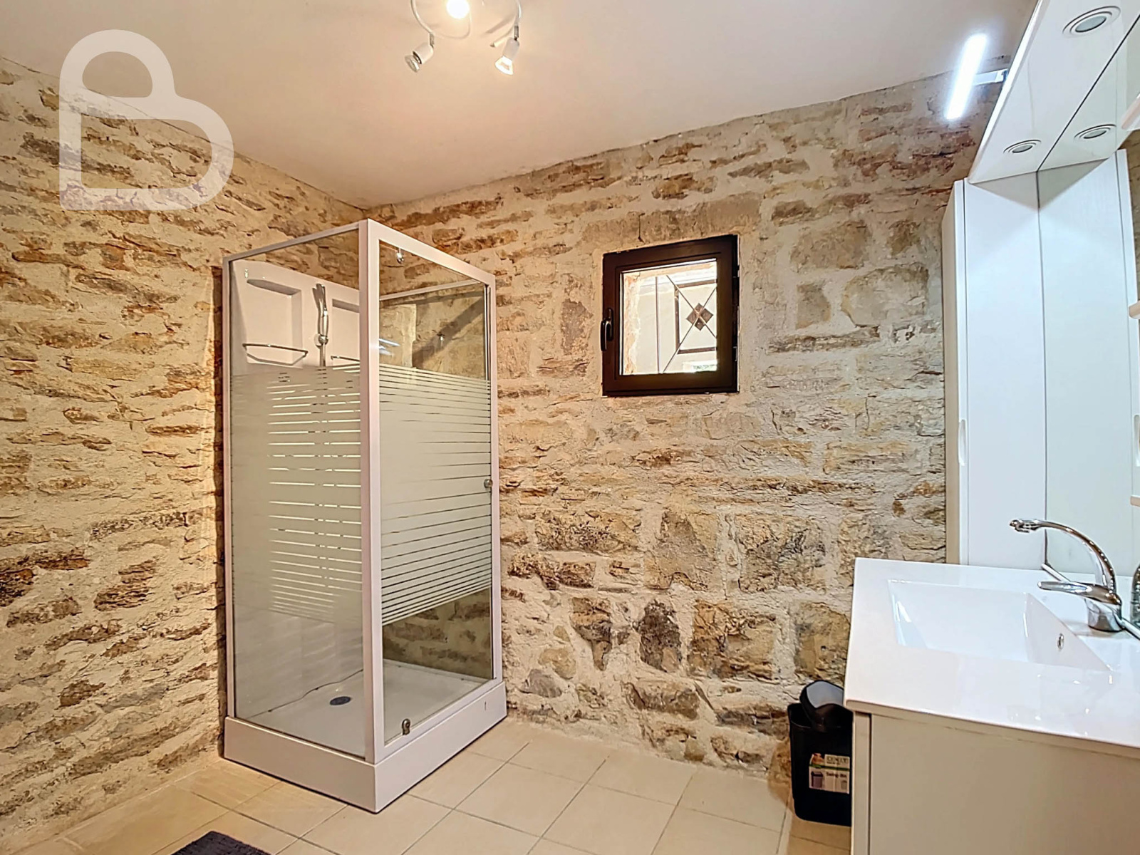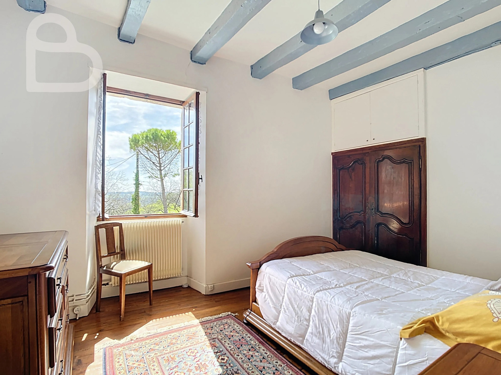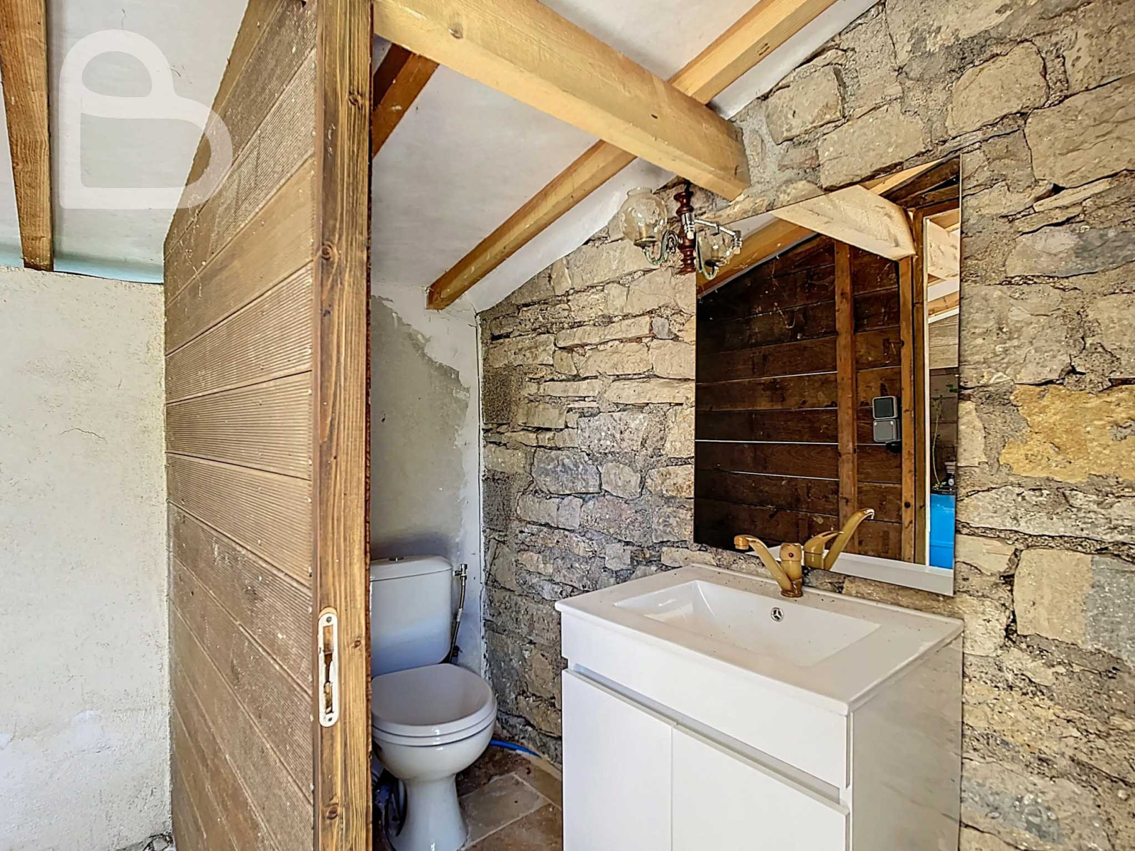 La seconde maison (environ 100 m²), ancien bâtiment scolaire, propose au rez-de-chaussée une grande chambre avec baie vitrée, une salle d'eau (douche et lavabo) et un WC séparé. À l'étage, un séjour lumineux avec cuisine ouverte s'ouvre sur une terrasse ombragée offrant une vue splendide sur les collines environnantes. Les combles aménagés comprennent un dortoir pour enfants et une chambre supplémentaire. Un garage est également présent.