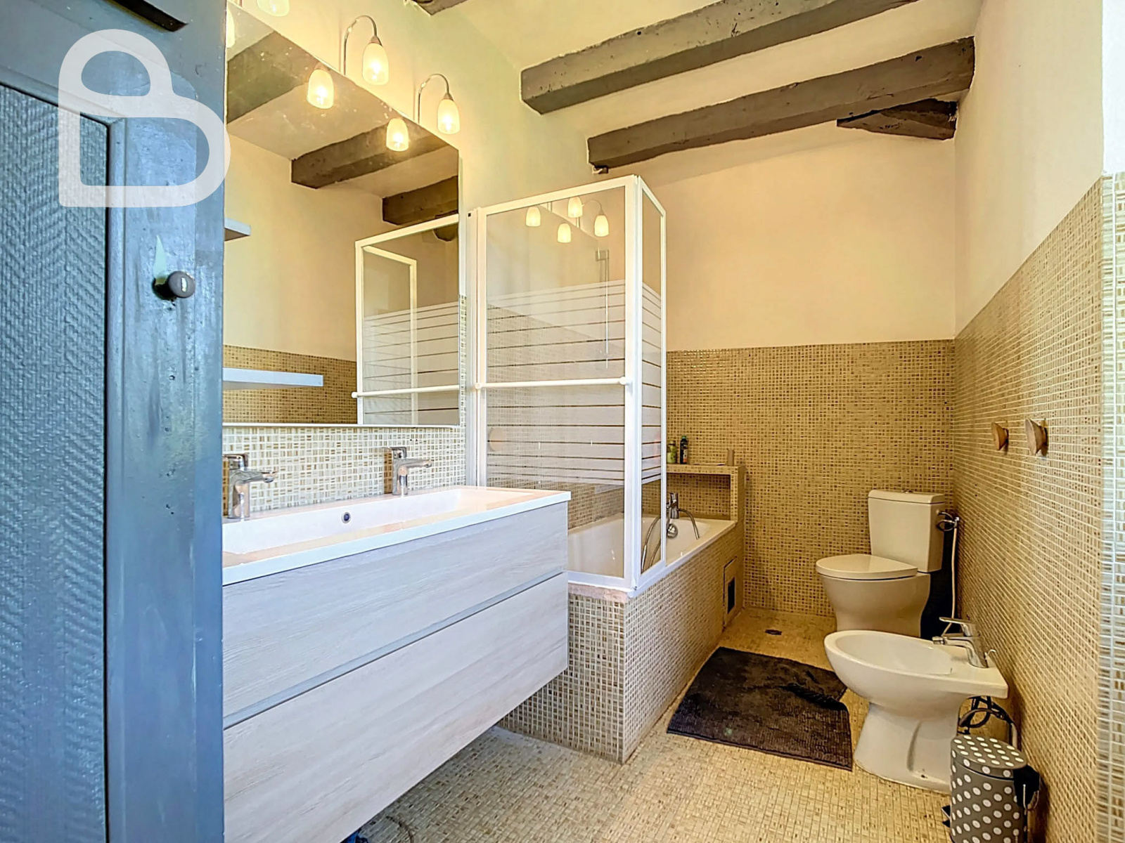 La maison principale (127 m²), datant de 1710, séduit par ses éléments d'origine soigneusement préservés. Au rez-de-chaussée, une pièce de vie chaleureuse avec cantou (cheminée traditionnelle) et four à pain, des sols en pierre naturelle et des plafonds hauts aux poutres apparentes. Une cuisine équipée s'ouvre sur la terrasse, complétée par une buanderie avec poêle à bois et un sol en pierre remarquable, ainsi qu'une salle de bain avec WC. À l'étage, accessible par un escalier en pierre, se trouvent un salon avec cantou, une souillarde aménagée dans le pigeonnier, deux chambres avec parquet et poutres apparentes, et une salle de bain avec WC. Les combles sont aménageables, offrant des possibilités d'extension.