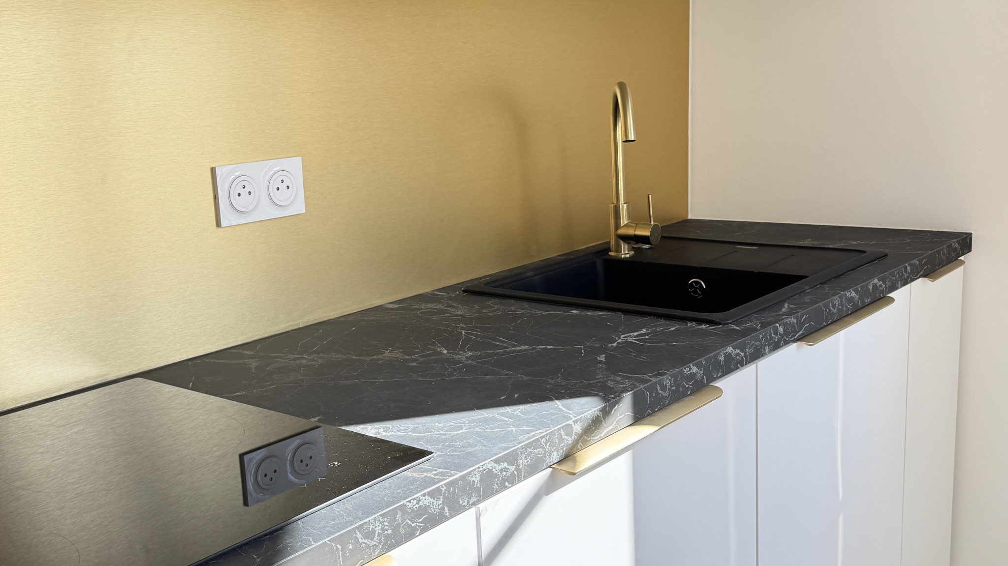 Du parquet chaleureux, une cuisine contemporaine avec finitions dorées, et une lumière naturelle à faire pâlir le filtre "Valencia"