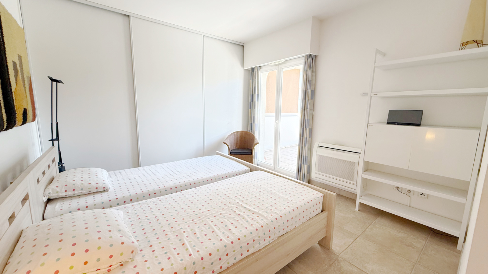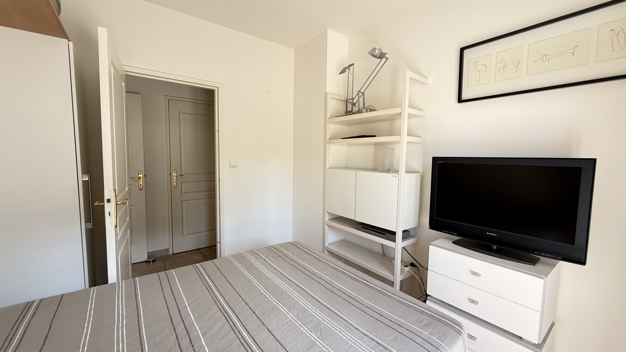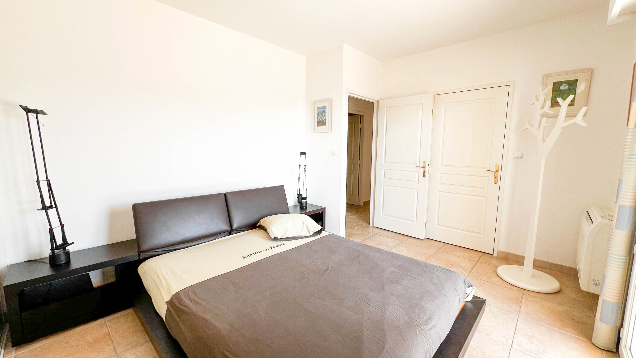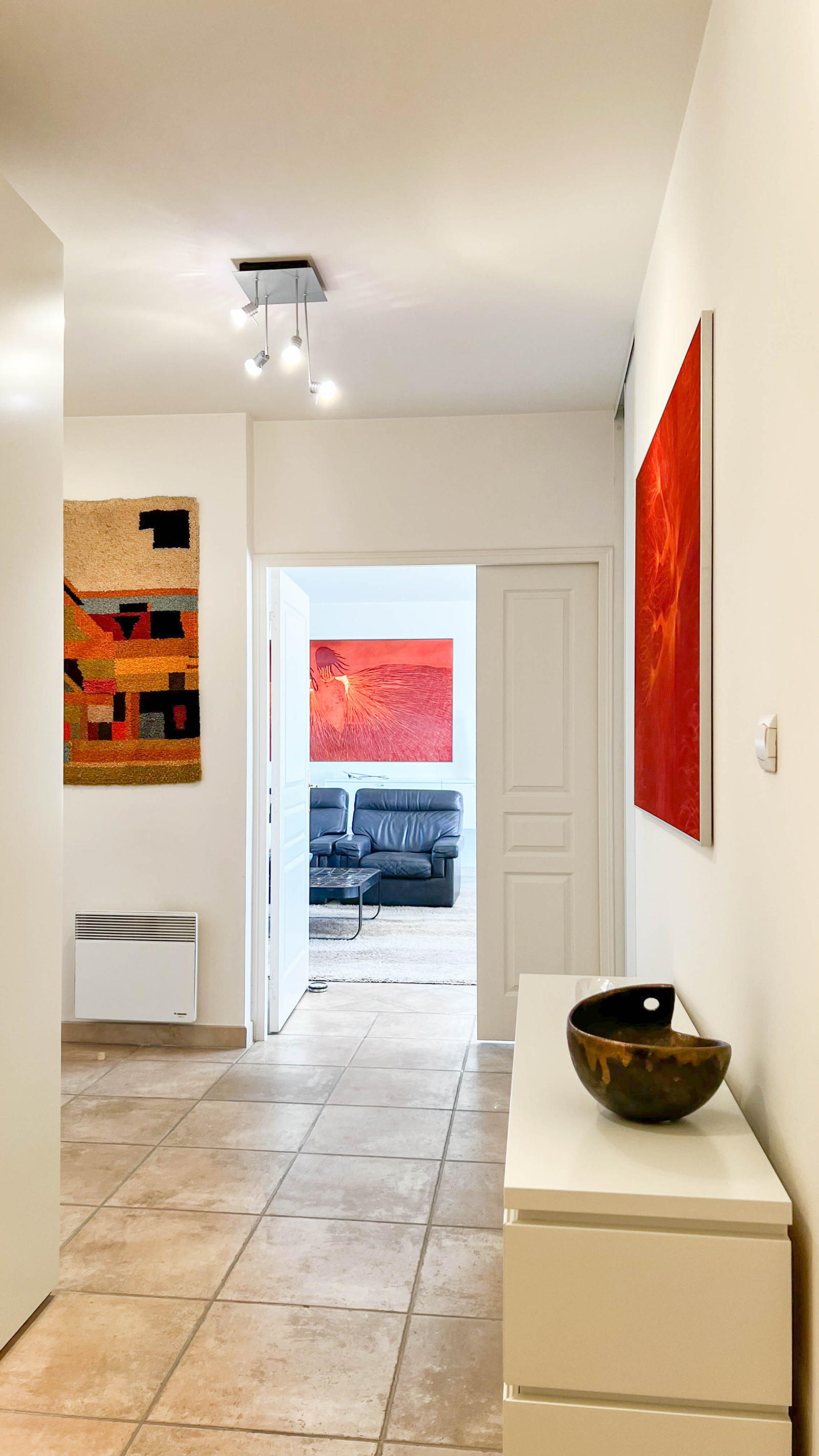 Climatisation dans les chambres, portes à galandage dans le salon et la cuisine, double vitrage, stores électriques, porte blindée