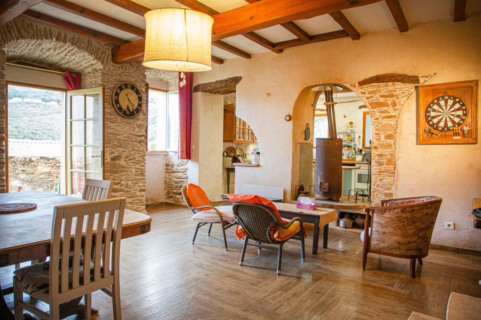 Entrée principale par la cuisine : vaste espace cuisine / séjour avec poêle à bois et cellier attenant.