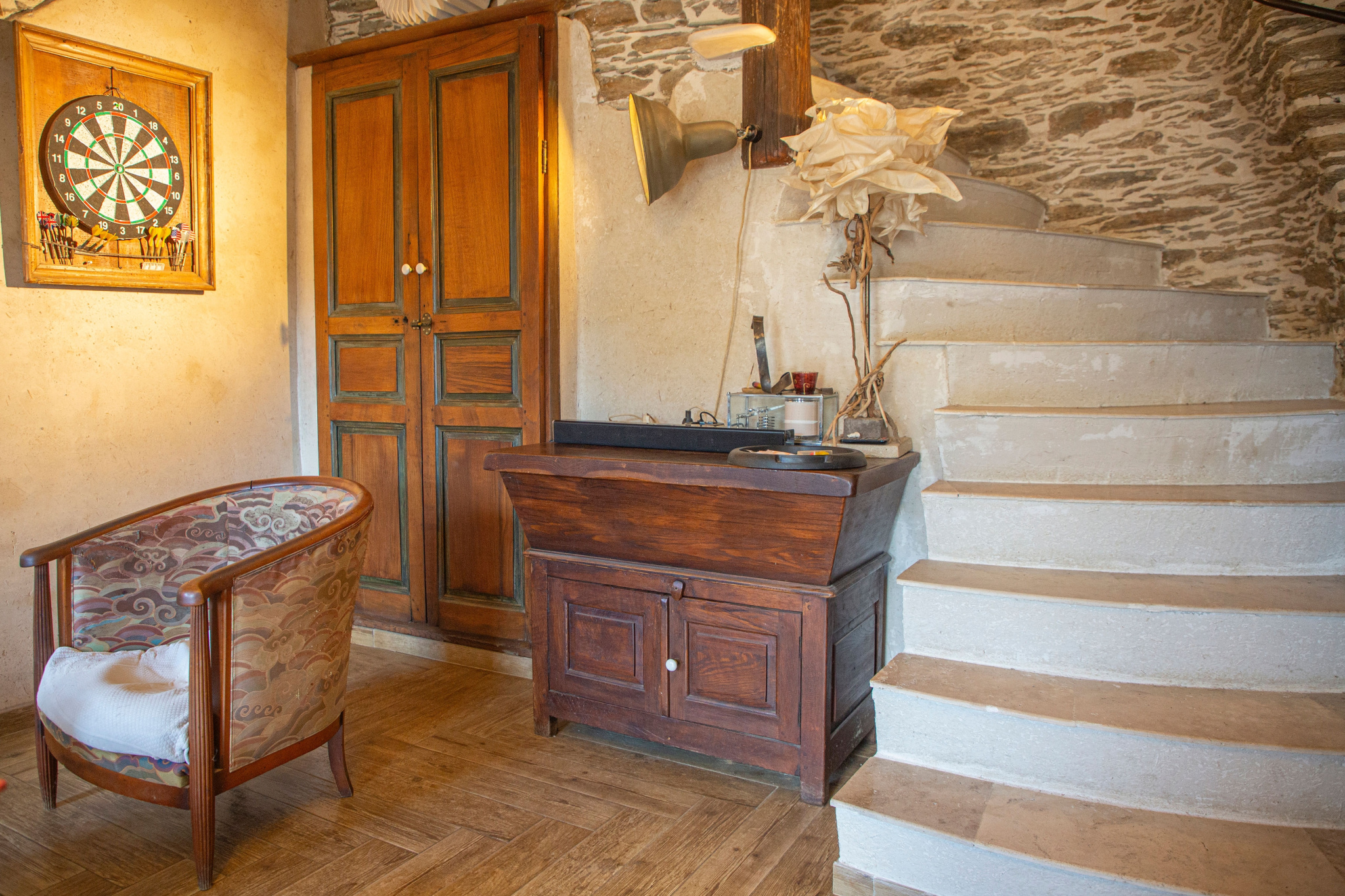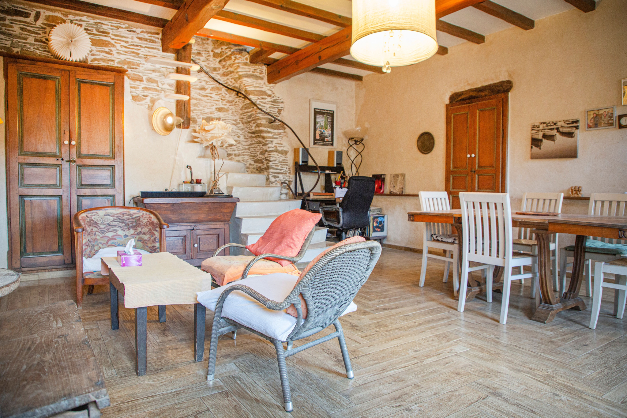 Nichée dans un environnement paisible, cette maison en pierre entièrement rénovée avec des matériaux de récupération offre une atmosphère authentique et chaleureuse.