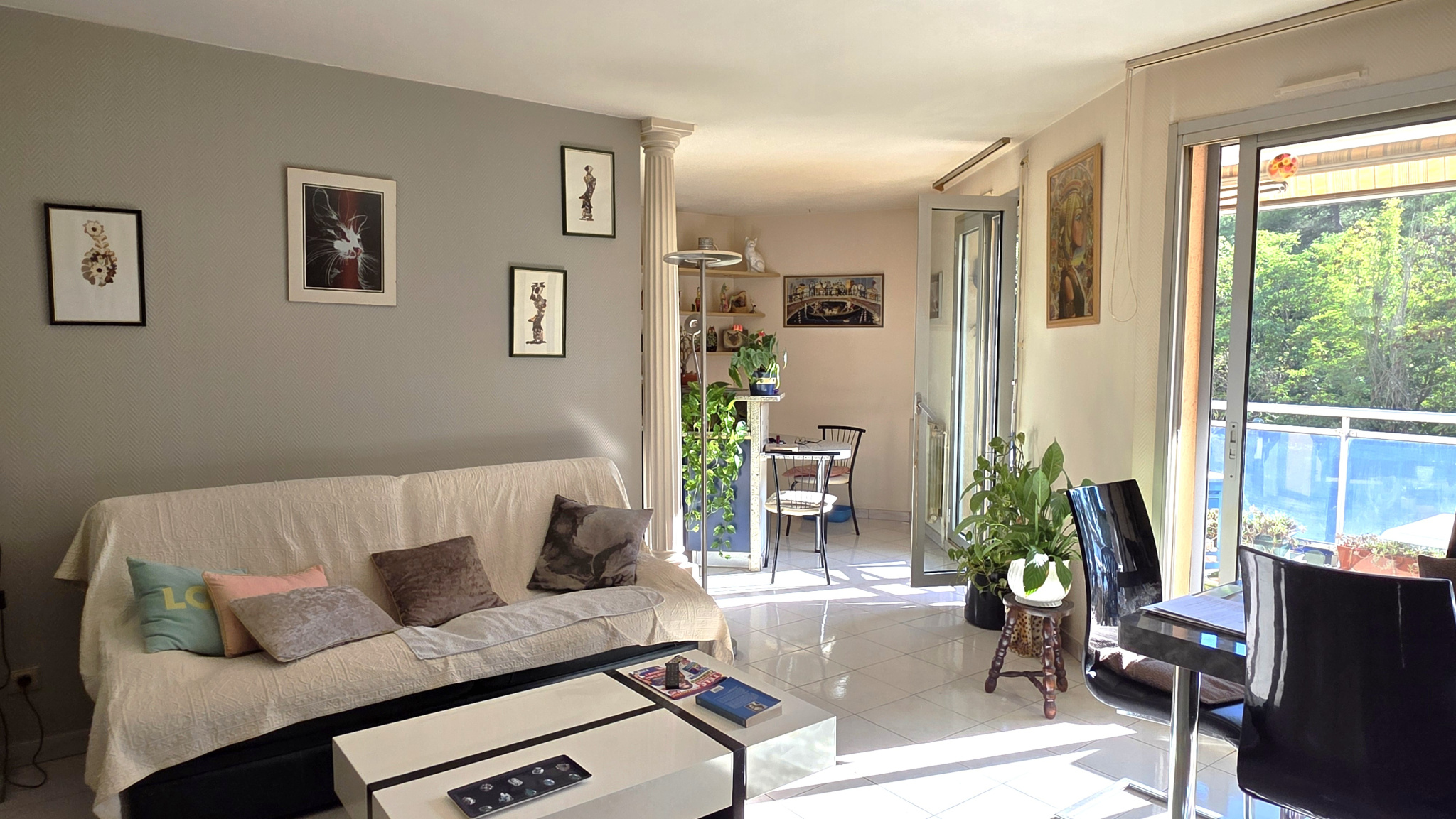 Appartement lumineux de 71 m² avec un balcon de 8 m² offrant une magnifique vue comprenant un grand séjour, cuisine américaine ouverte sur le séjour, totalement équipée, deux chambres, salle de bain, WC et Hall d'entrée