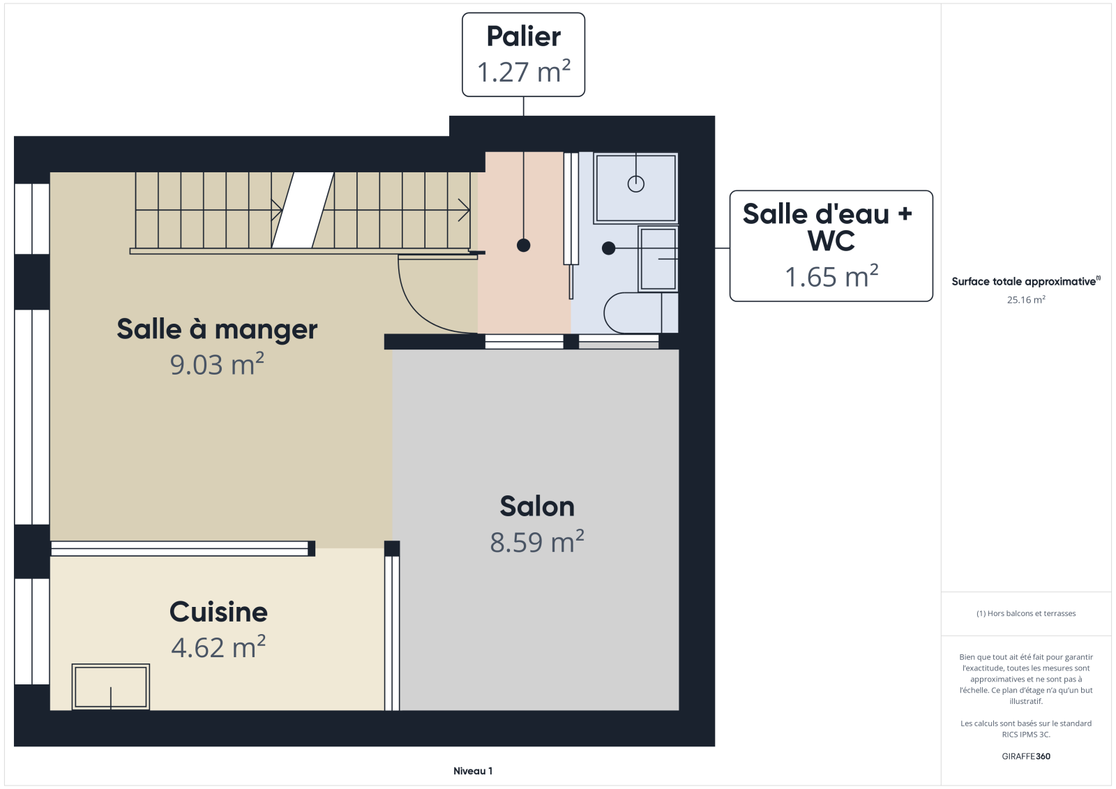 -      Salle d’eau avec lavabo, douche et WC (1,65m2).