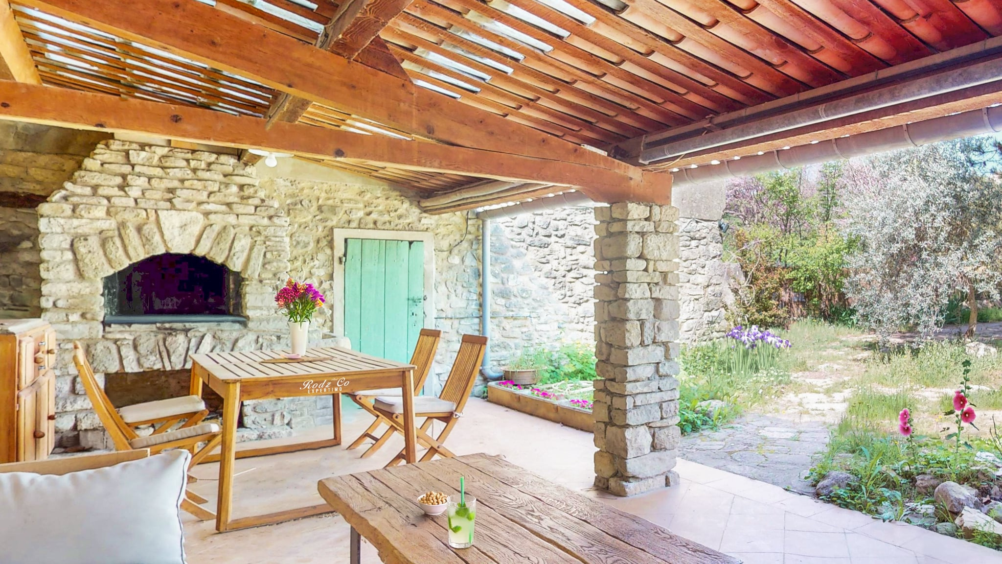 À l’extérieur, le charme opère immédiatement : une agréable terrasse abritée sous un auvent, véritable pièce de vie d’été, invite à profiter de moments conviviaux à l’ombre. Un bassin d’agrément complète cet espace et apporte une touche de fraîcheur, dans un cadre paisible et typiquement provençal.