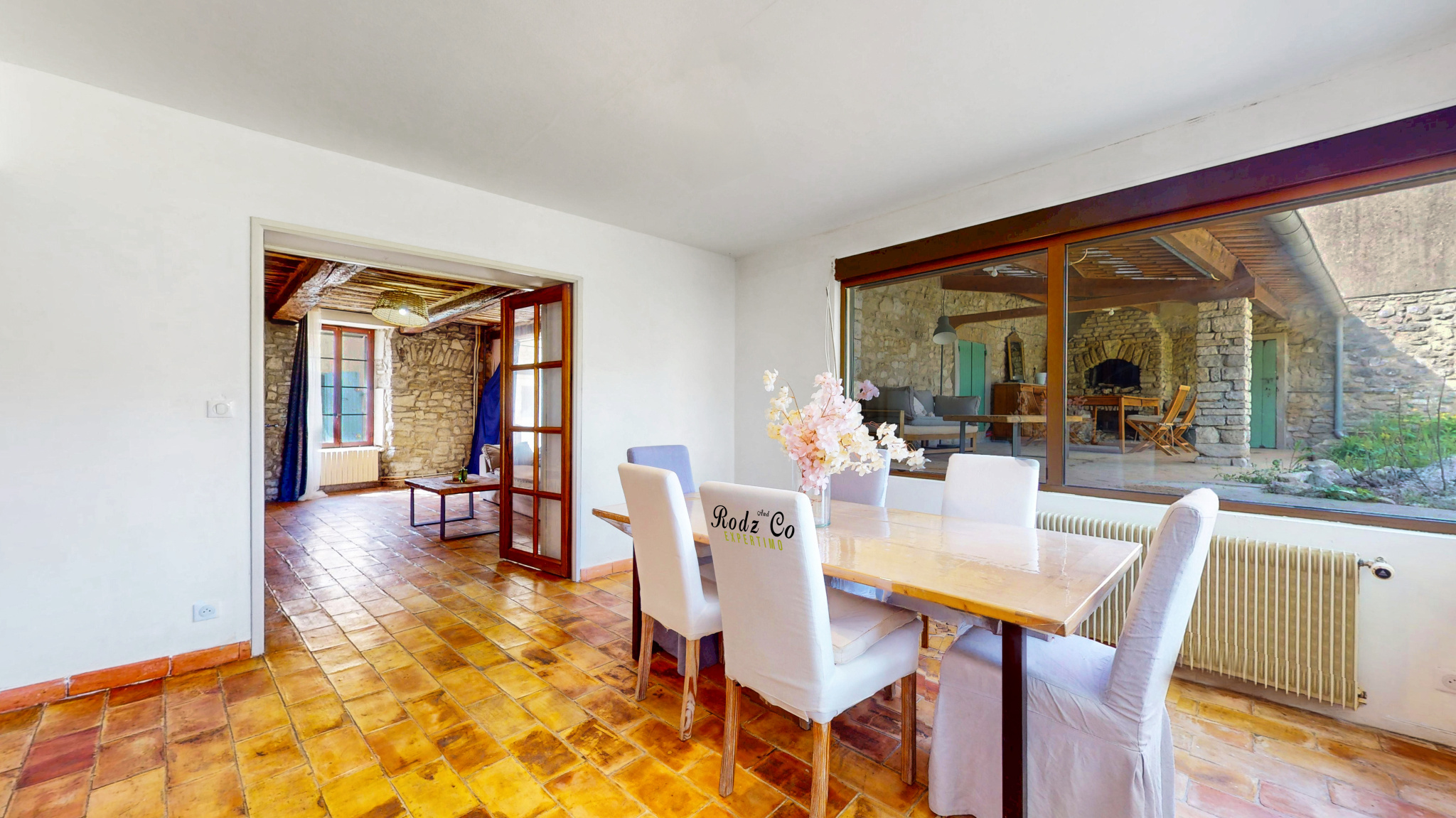 Édifiée en pierre, cette bâtisse de hameau séduit par son cachet ancien et son atmosphère chaleureuse : murs en pierre apparente, cheminées, caves voûtées et volumes généreux témoignent de son histoire et de son authenticité.
