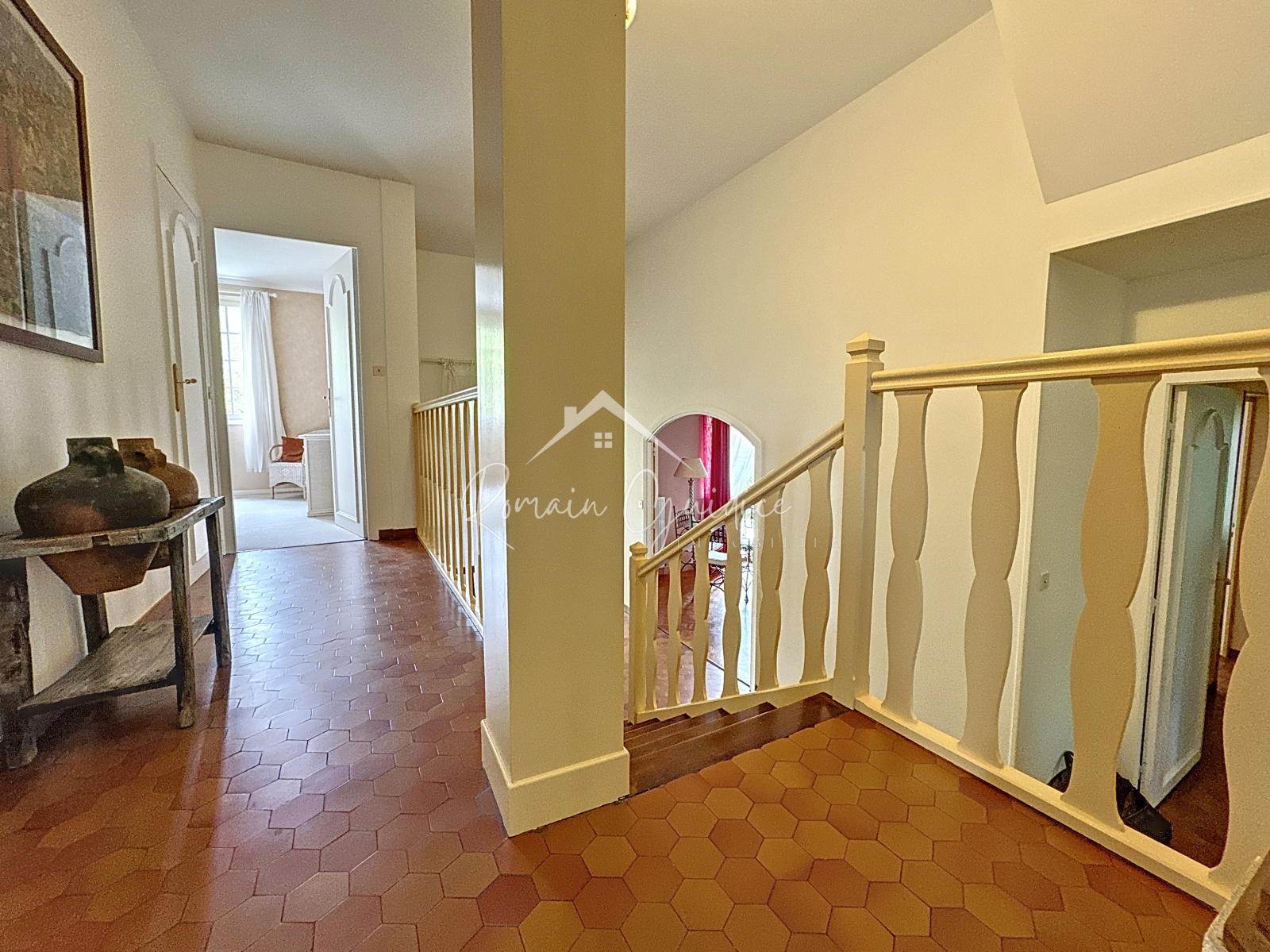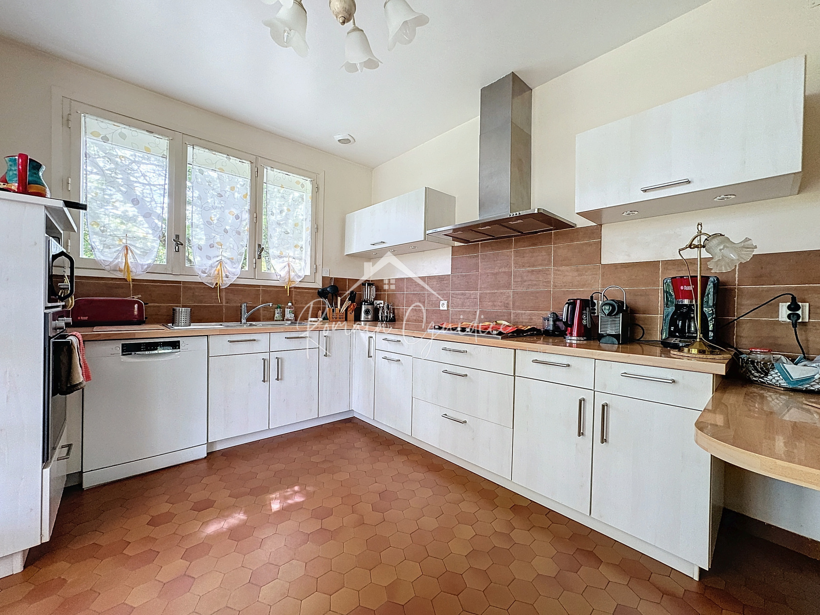 Une vaste entrée dessert un agréable séjour de 34 m² avec insert bois (installé en 2023) et baies vitrées à galandage donnant sur une première terrasse avec vue sur le parc.