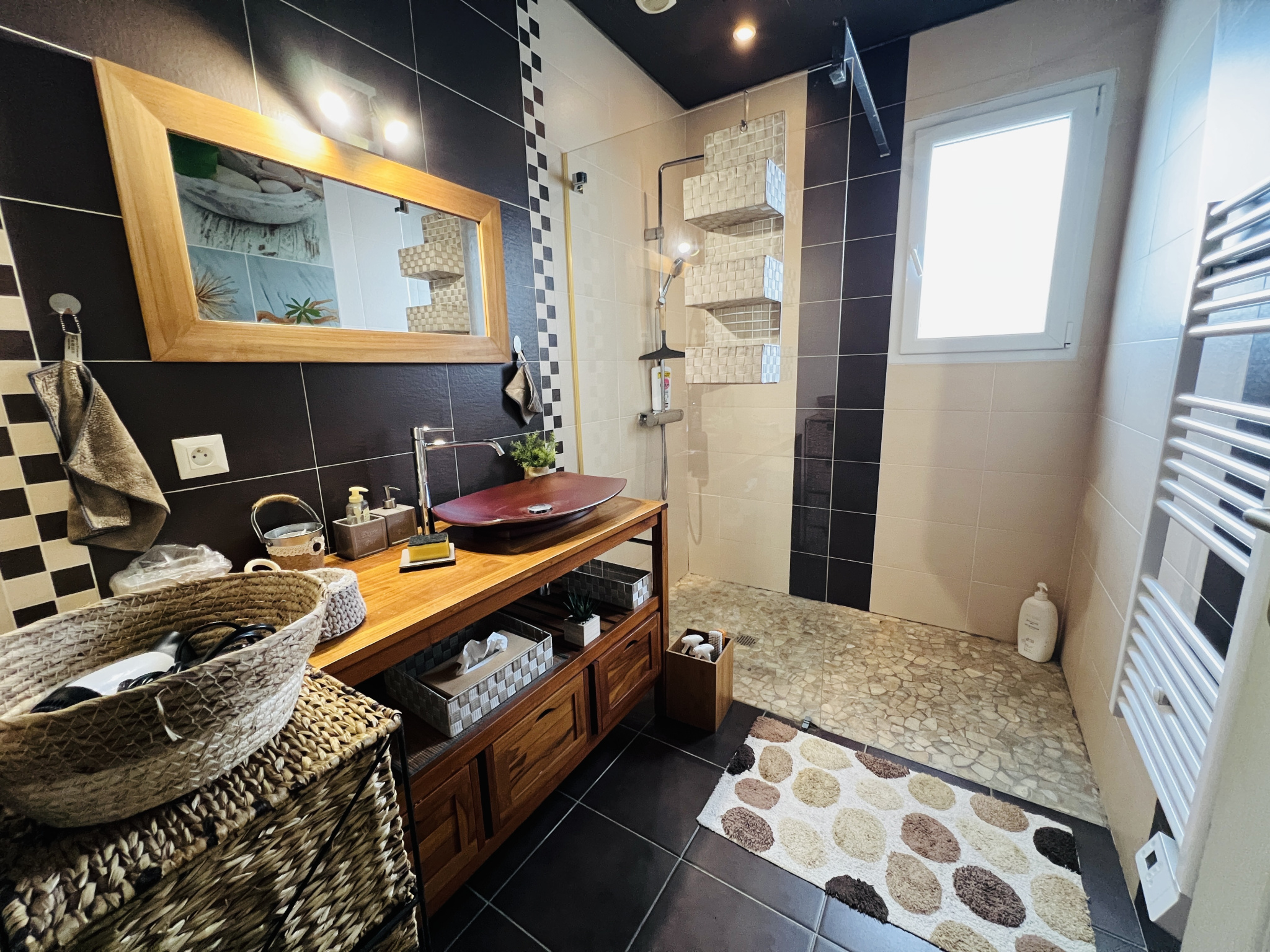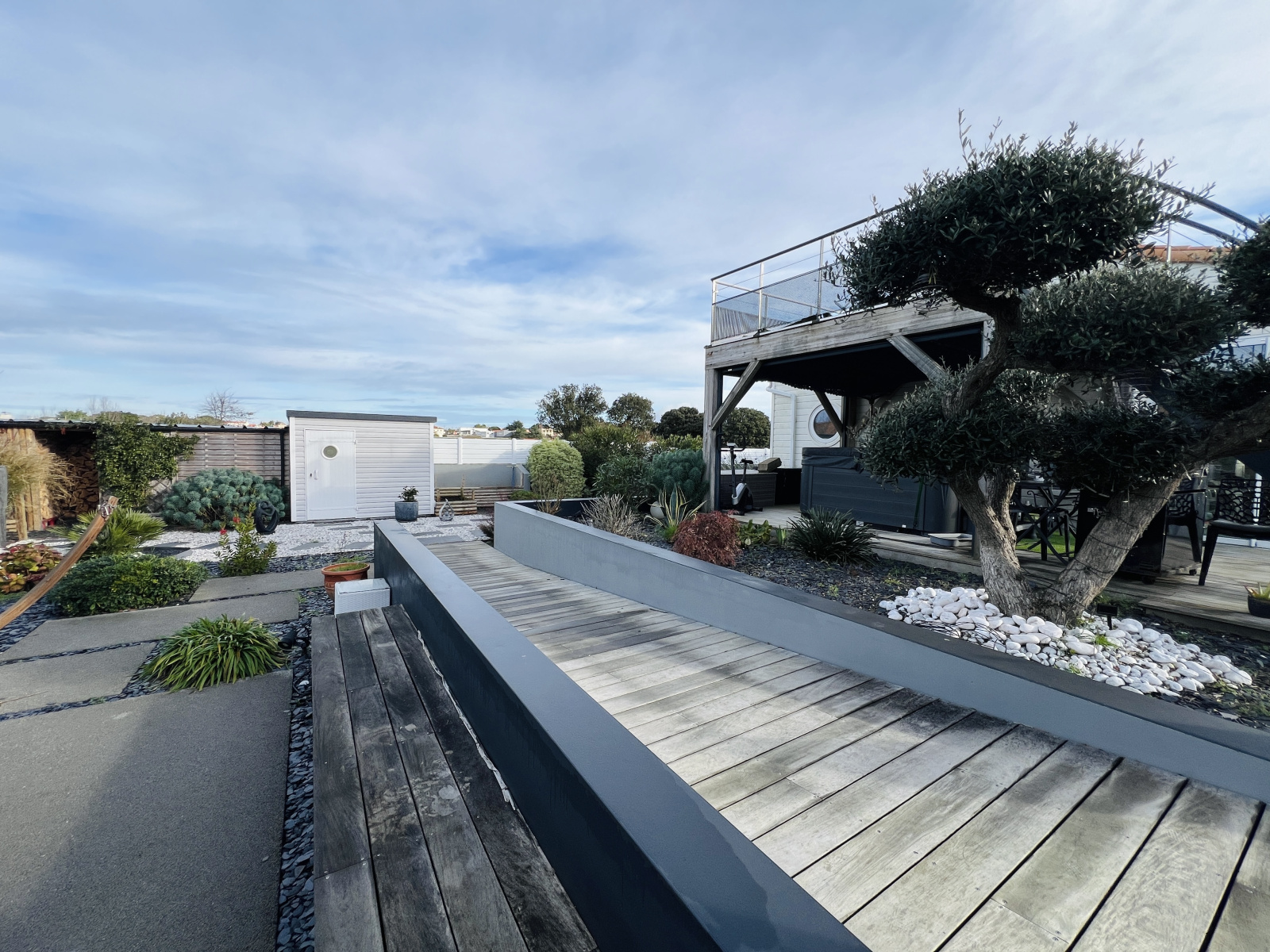 À l’extérieur, les terrasses, dont une avec pergola, entourent élégamment la piscine chauffée et protégée sous dôme. Le jardin paysagé offre un solarium, un boulodrome et un agréable coin détente autour d’un brasero. Un abri de jardin complète l’ensemble.