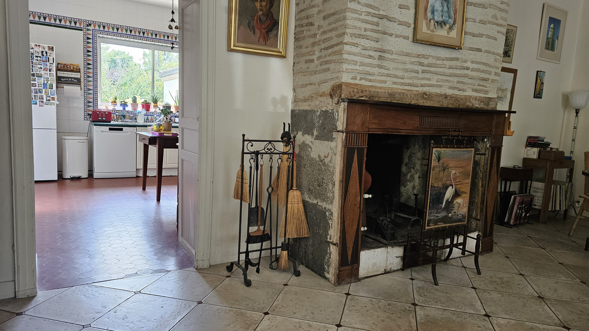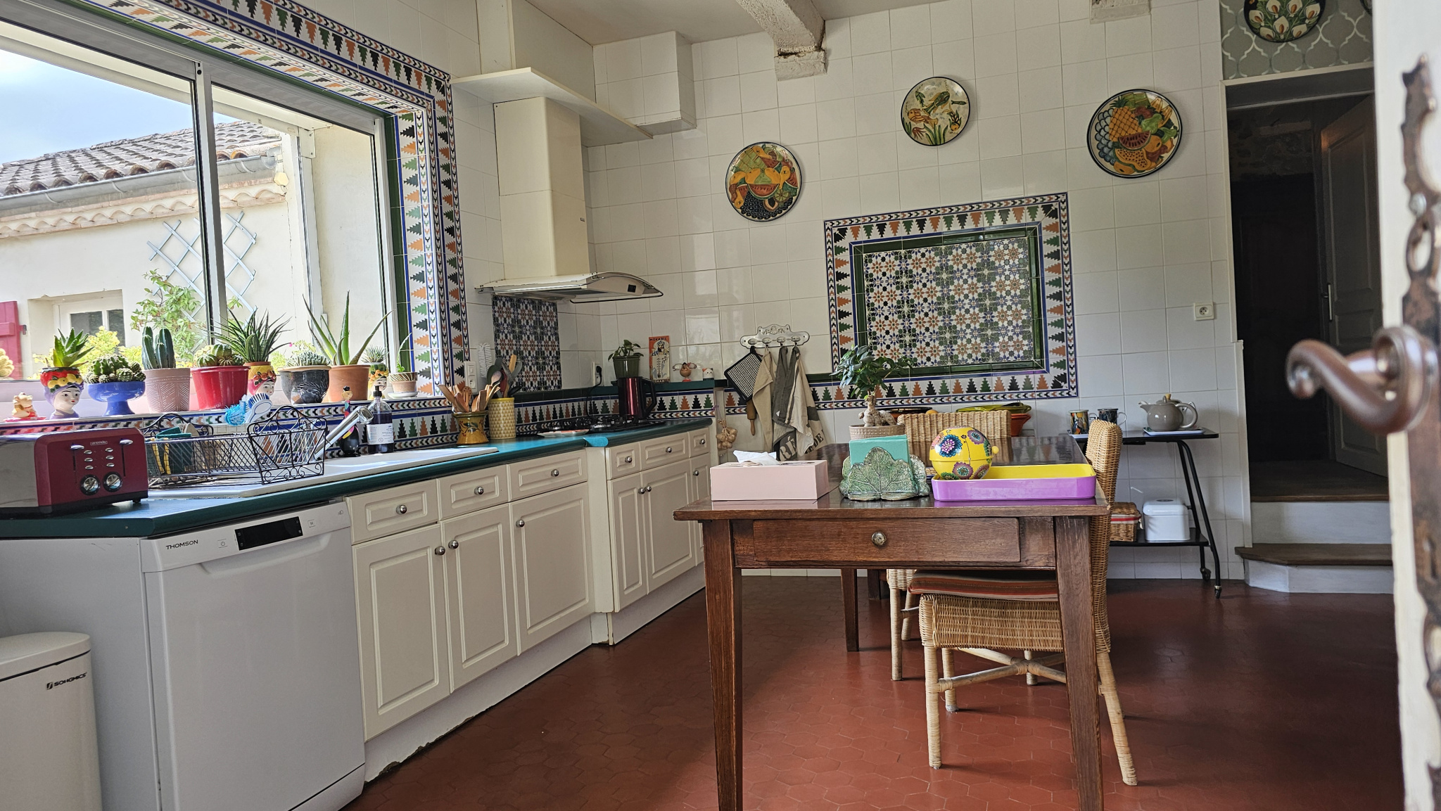 Sa cuisine (19 m²) atypique avec ses carreaux de faïence colorés donne par sa porte fenêtre directement sur la terrasse et le jardin.
