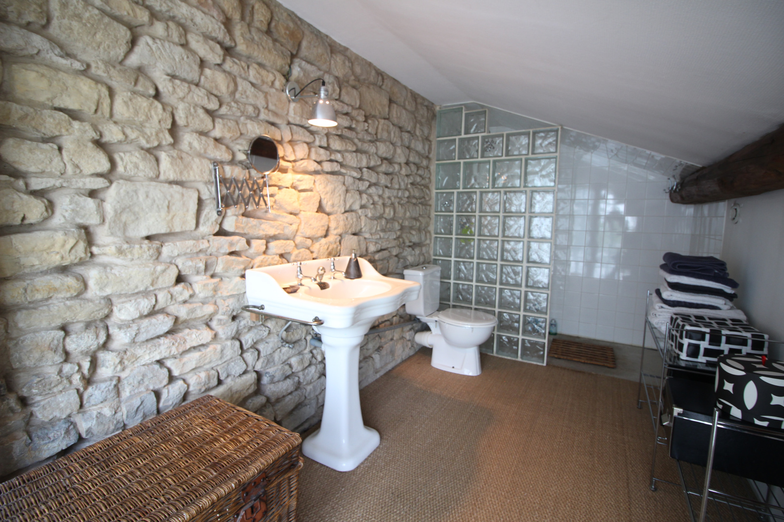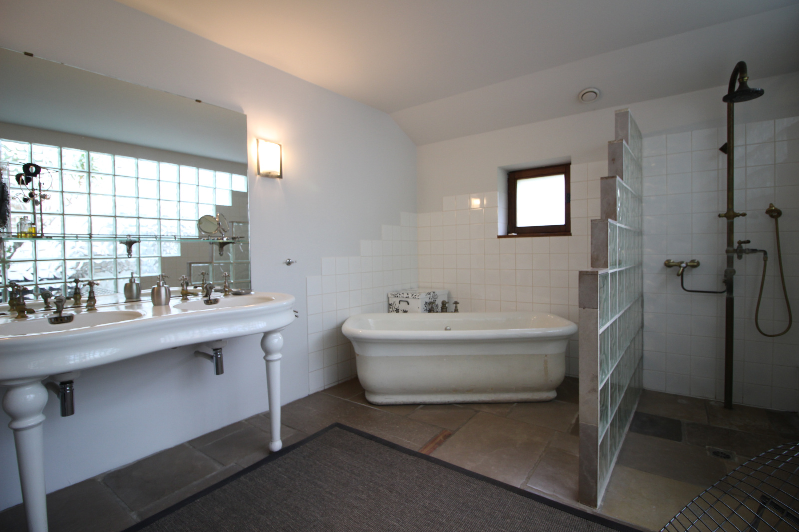 pierre de bourgogne au sol, VMC, 1 baignoire sur pied, 1 douche à l'italienne, 2 vasques, 1 fenêtre