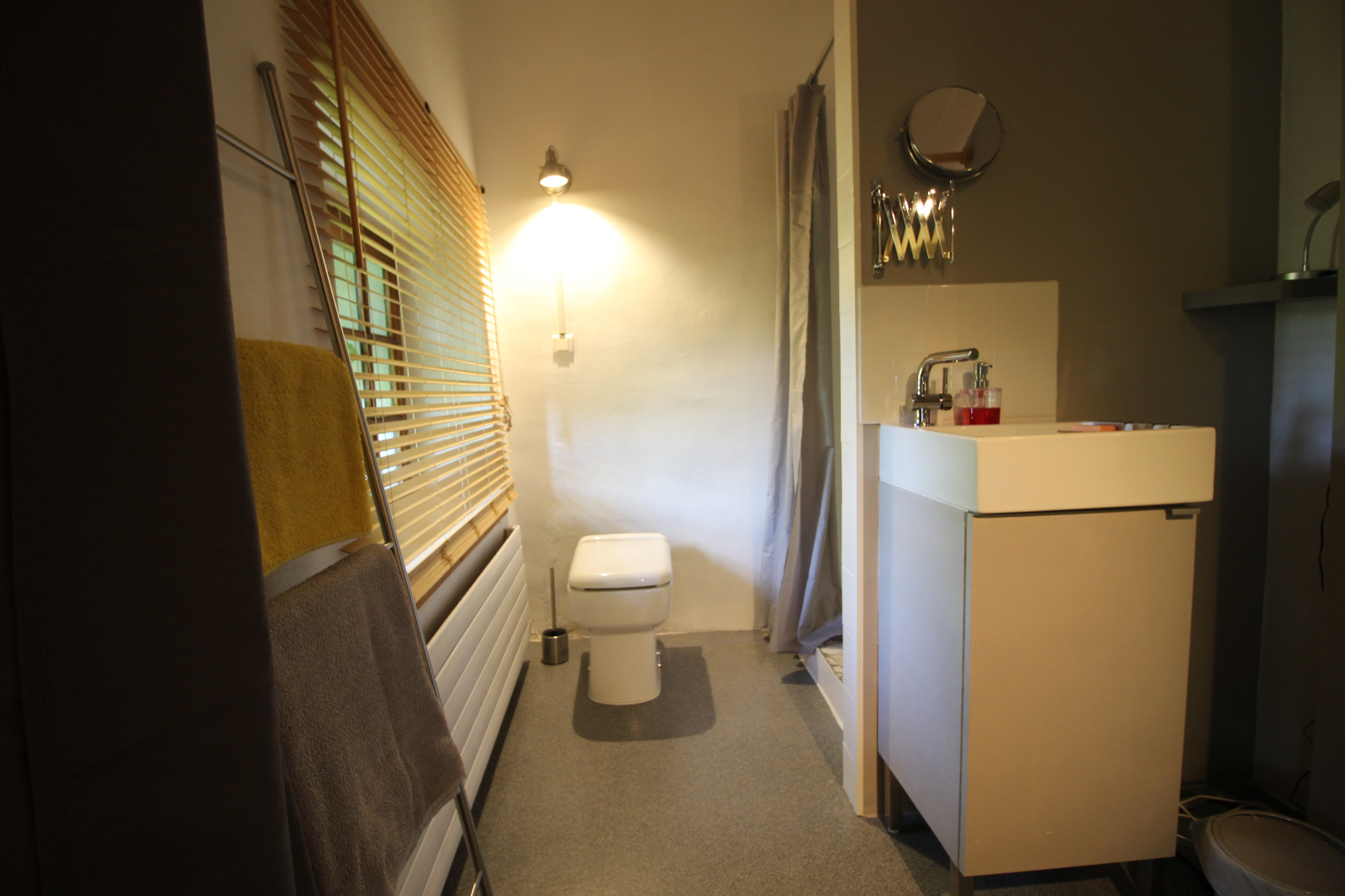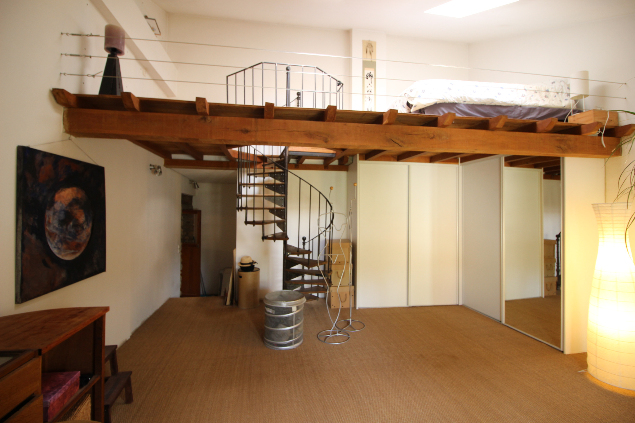 avec mezzanine et coin douche, 1 vasque, 1 WC, dalle gerflor au sol