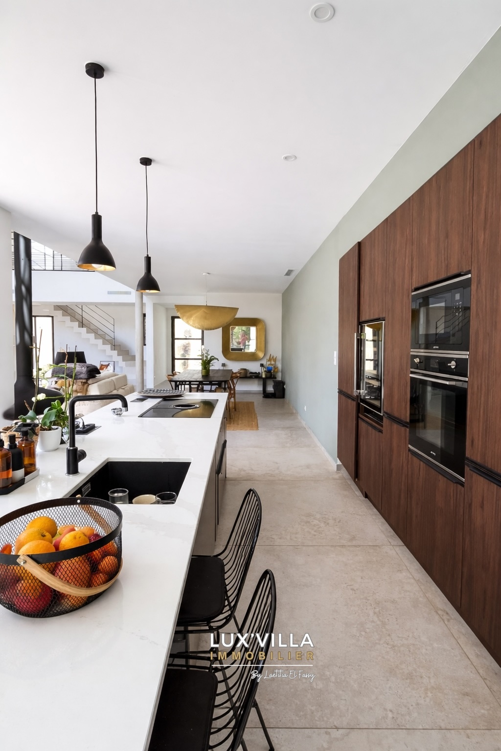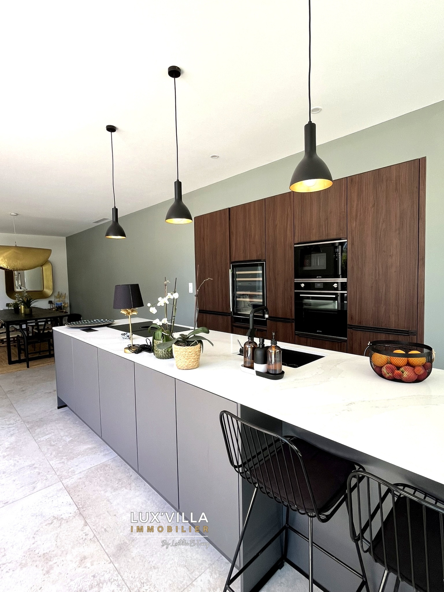 La pièce de vie accueille une magnifique cuisine sur mesure signée Cuisines Harmonie, aux lignes contemporaines et finitions soignées, parfaitement intégrée à l’espace réception. Elle est complétée par une grande arrière-cuisine entièrement aménagée et équipée, idéale pour le rangement et l’organisation du quotidien.