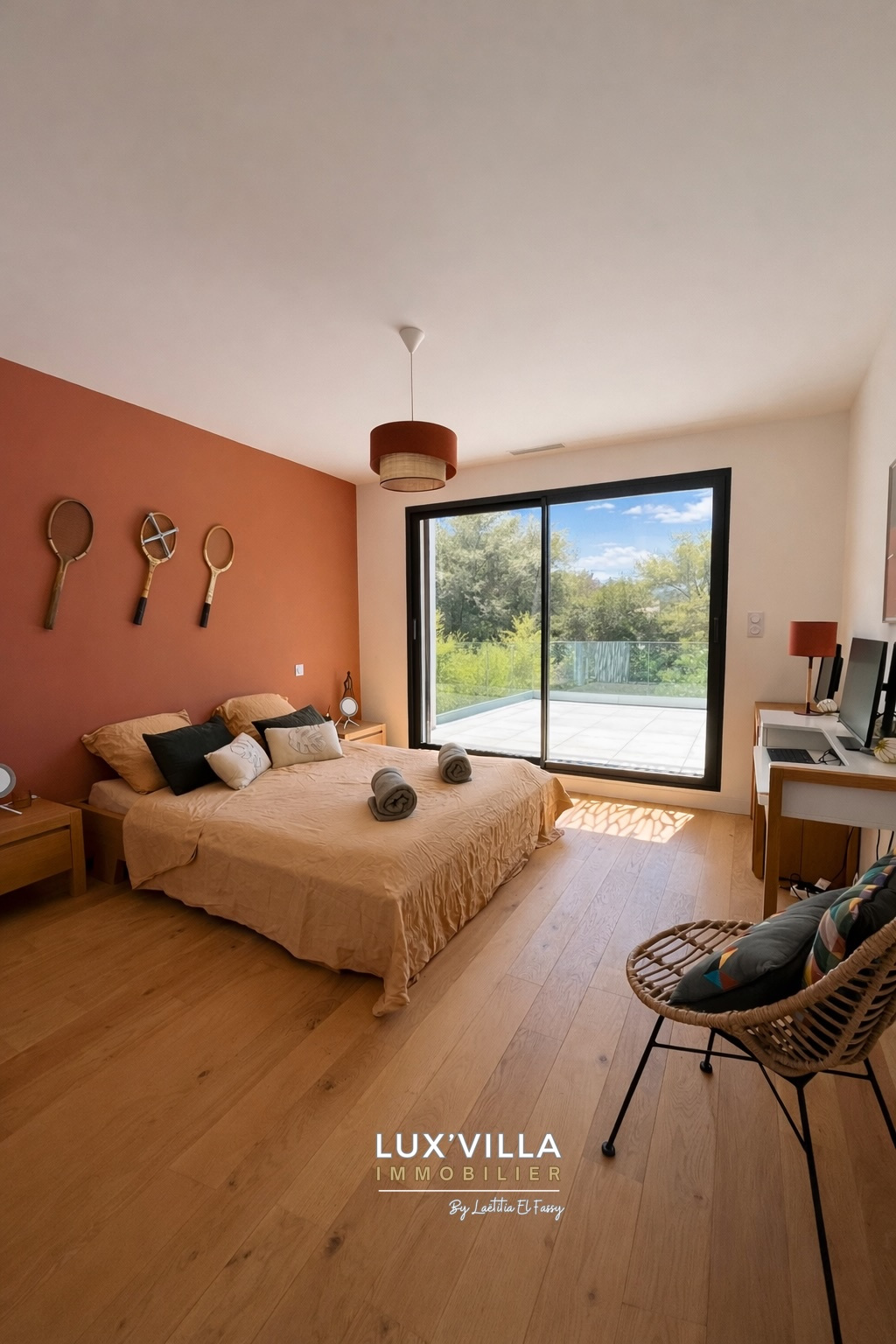 Dans un Domaine prisé, à proximité immédiate de Montpellier, avec le tramway accessible à pied, écoles et collège à quelques minutes, cette élégante villa contemporaine réalisée en 2022 par le cabinet de renom A+ Architectes (Philippe Bonon) conjugue architecture affirmée, fonctionnalité familiale et prestations haut de gamme.
