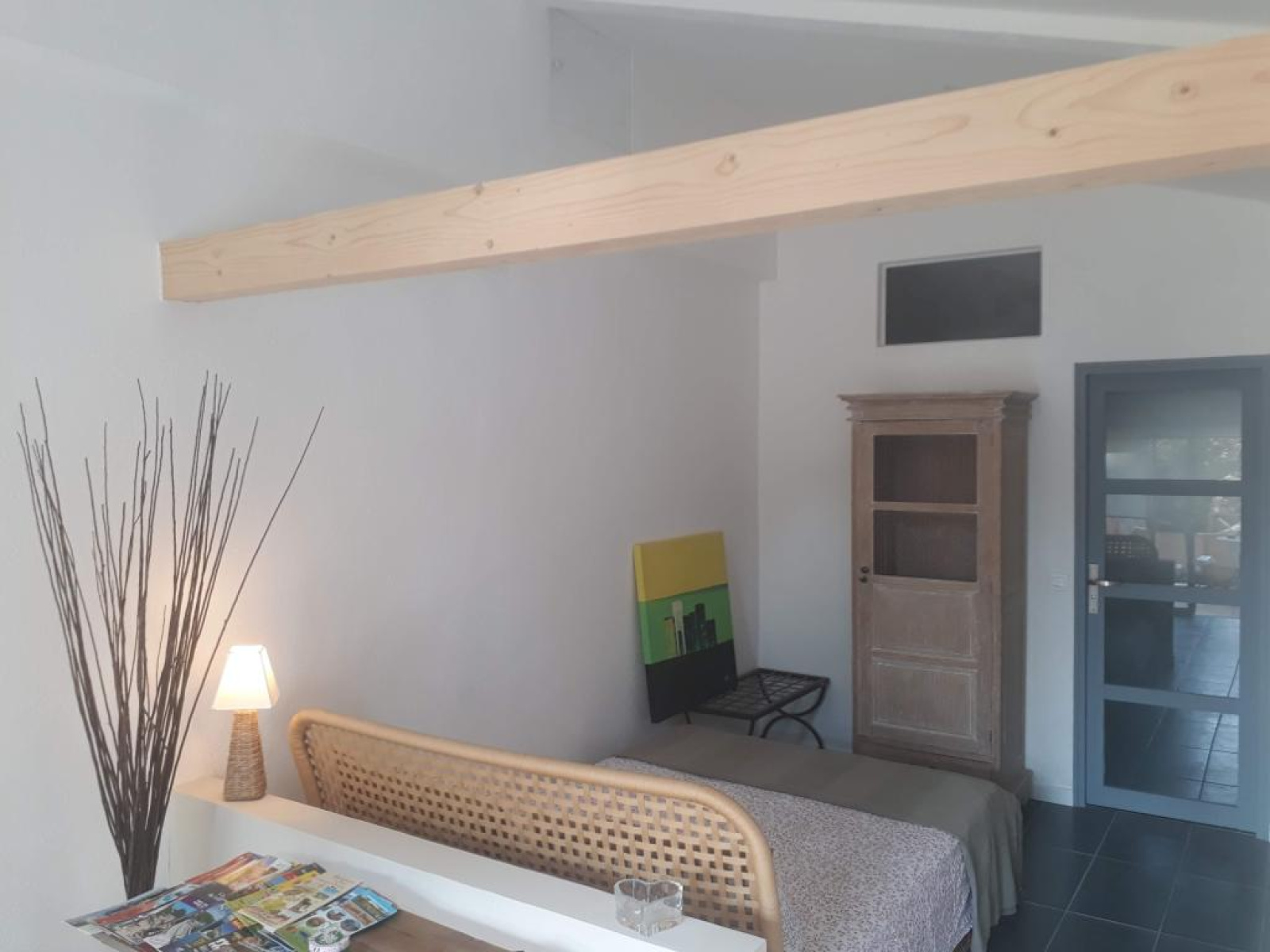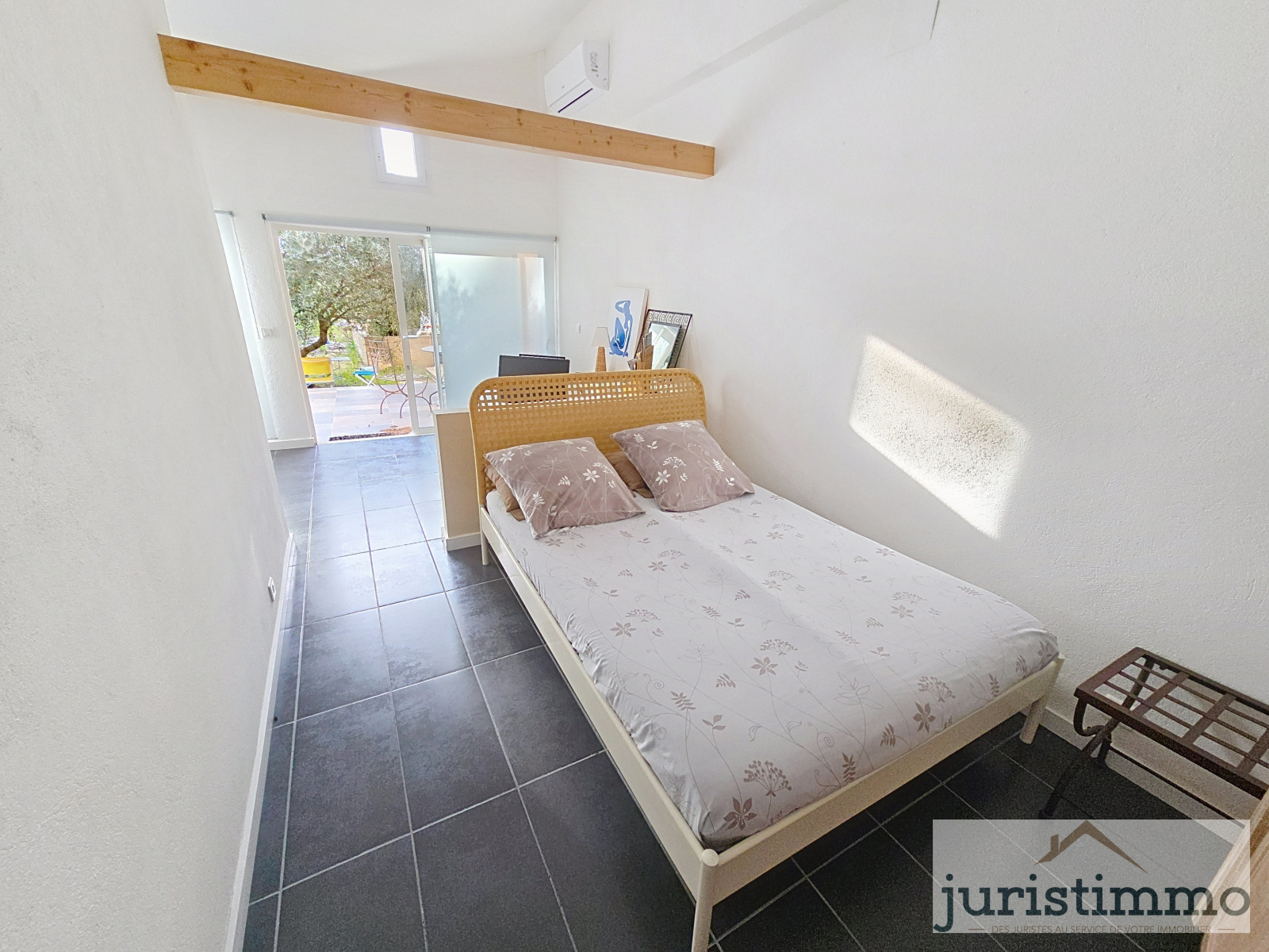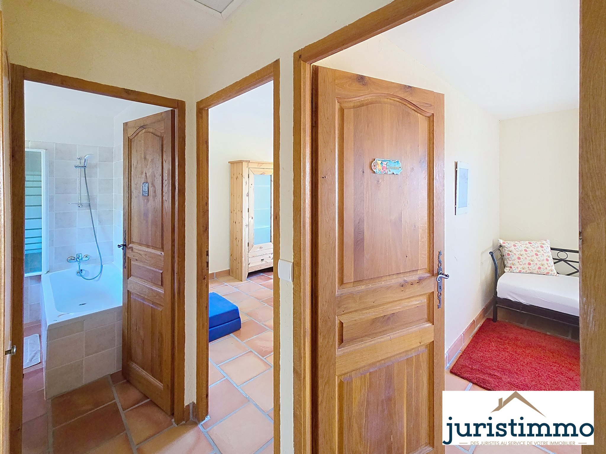 Depuis la pièce de vie, un couloir dessert : Une salle d’eau. Une chambre avec accès direct à une terrasse. Des WC séparés avec cuvette suspendue. Un espace de rangement sous l’escalier. Une buanderie (sol brut) ouvrant sur une petite cour à l’arrière.